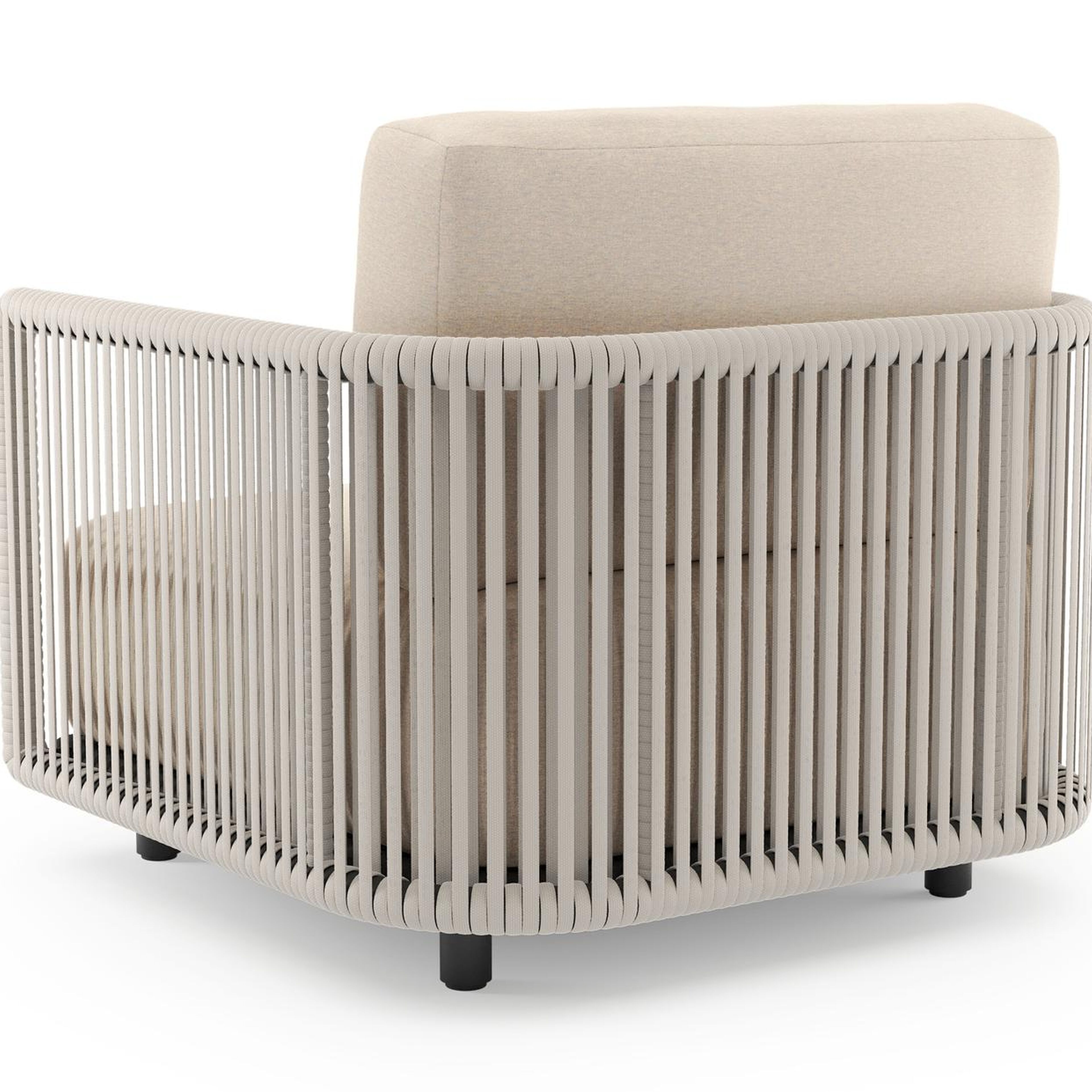 Organo loungestoel 1-zit in zwart aluminium en beige verticaal geweven luxe vlakke rope met heritage papyrus all weather sunbrella® luxe kussen | Exterioo tuinmeubelen