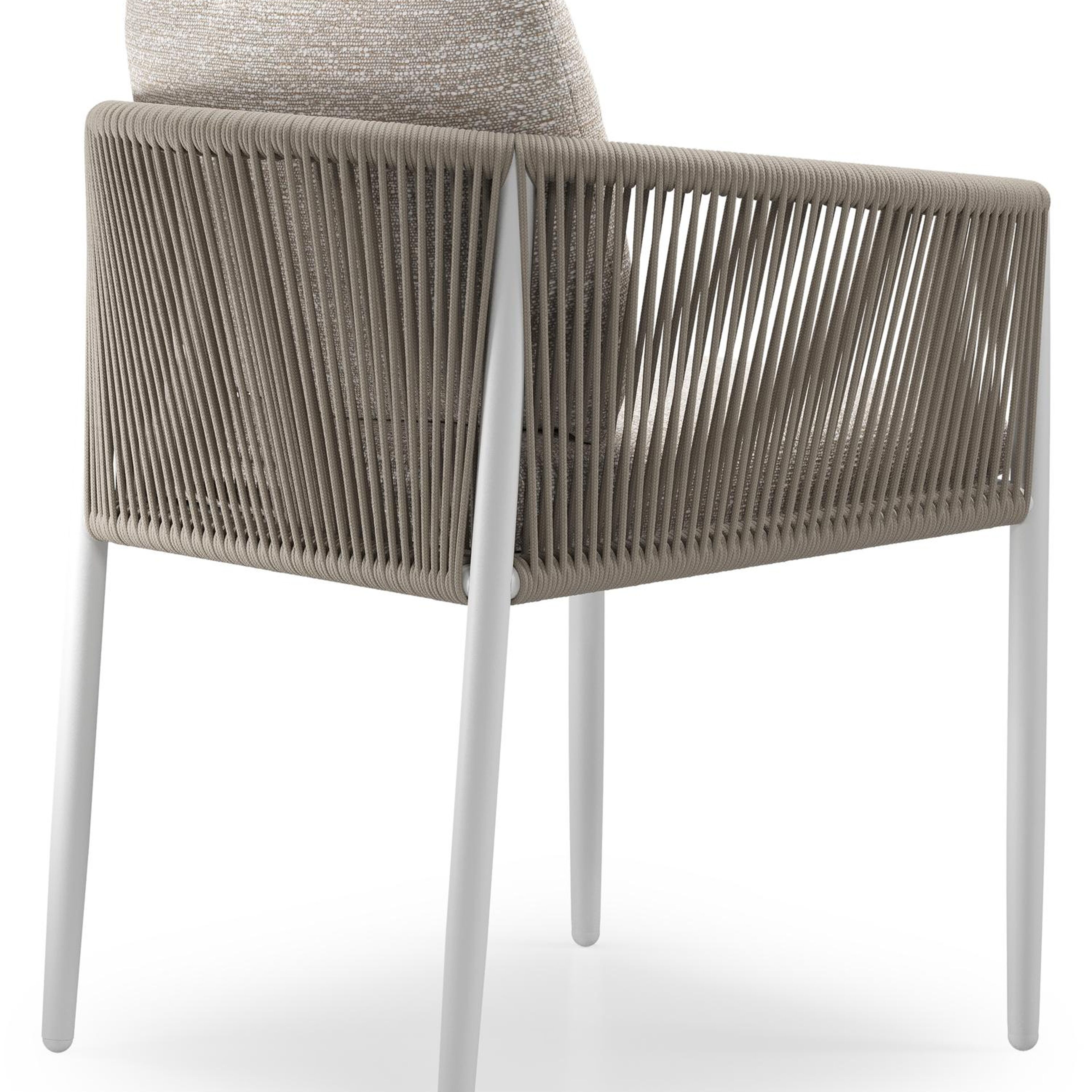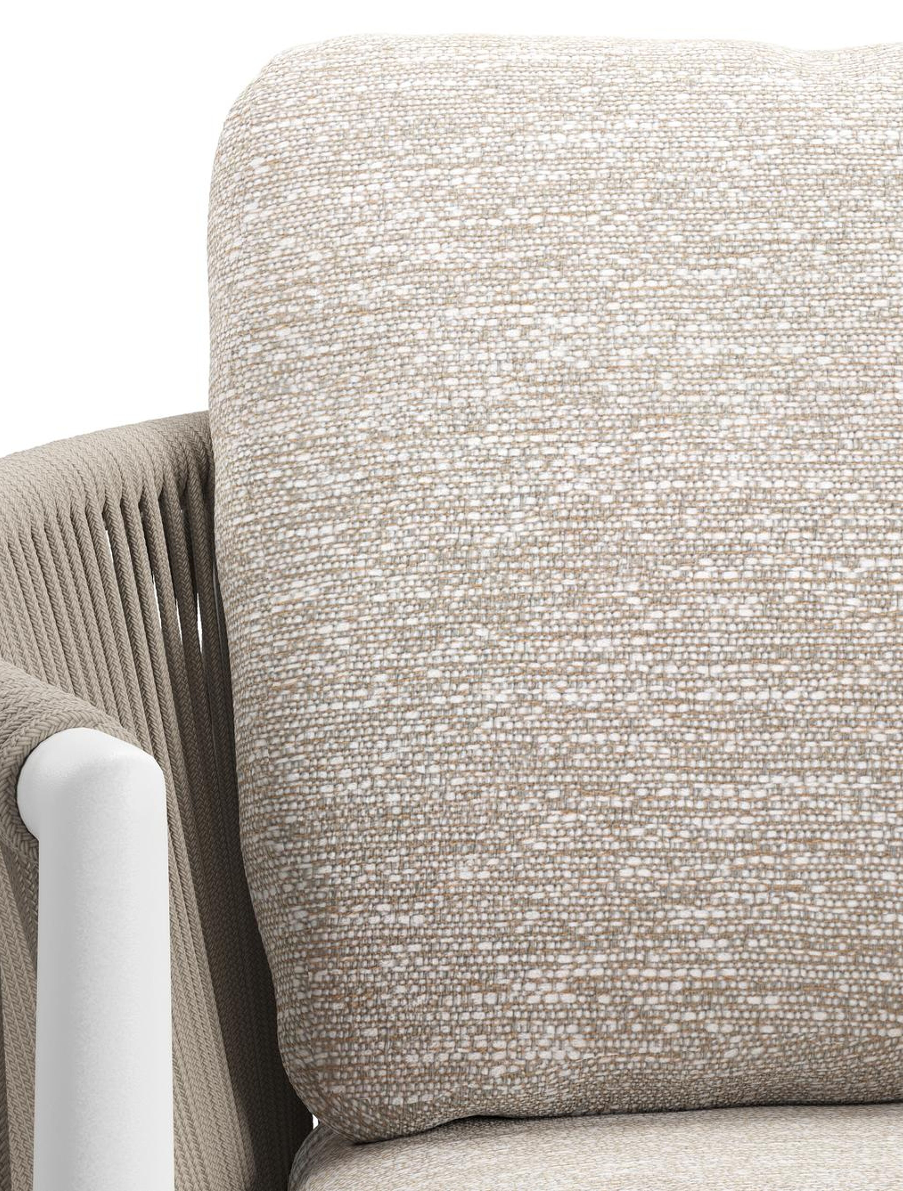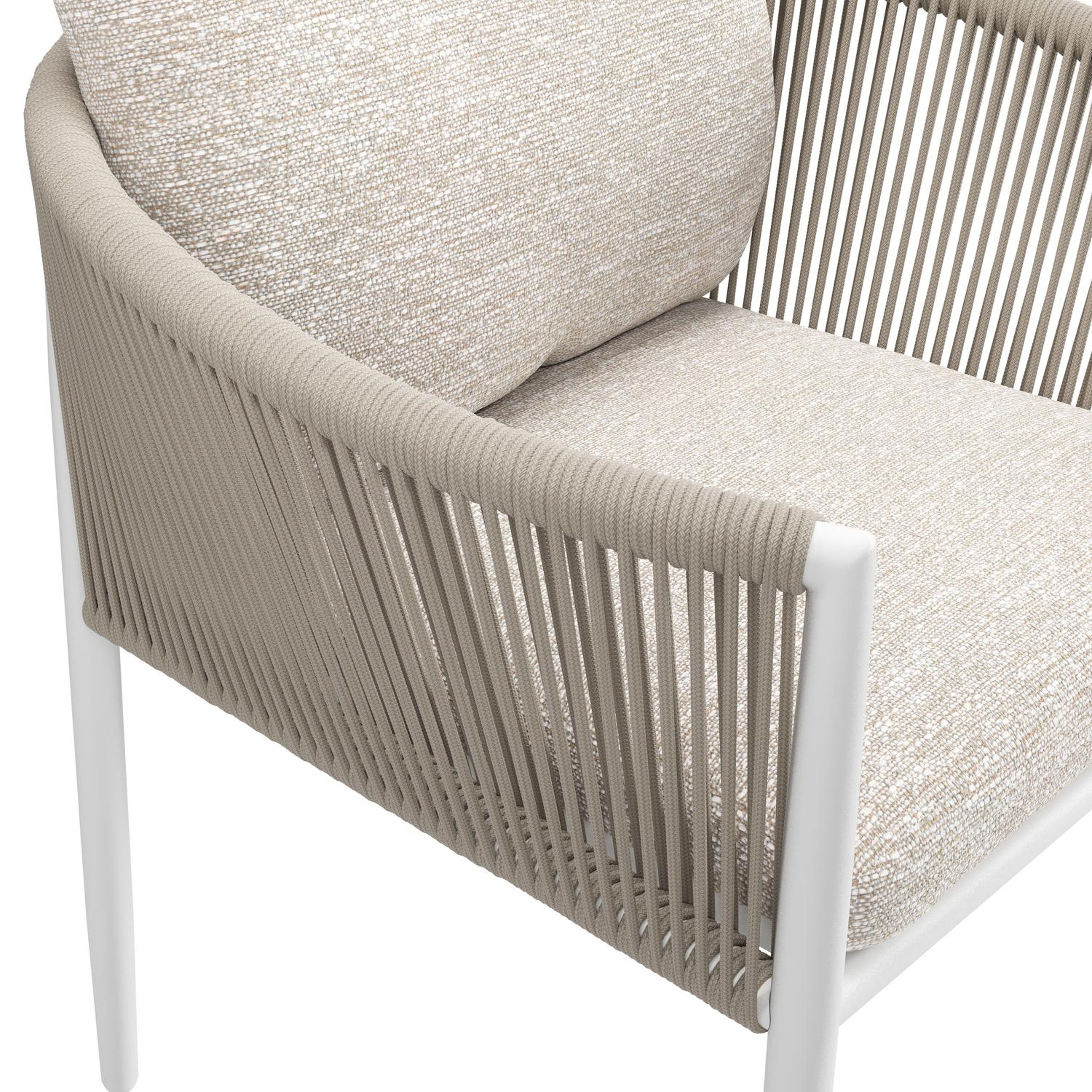 Organo tuinstoel in beige aluminium en beige verticaal geweven ronde rope met stoelkussen in All Weather Sunbrella® Luxe Tundra Sand | Exterioo tuinmeubelen