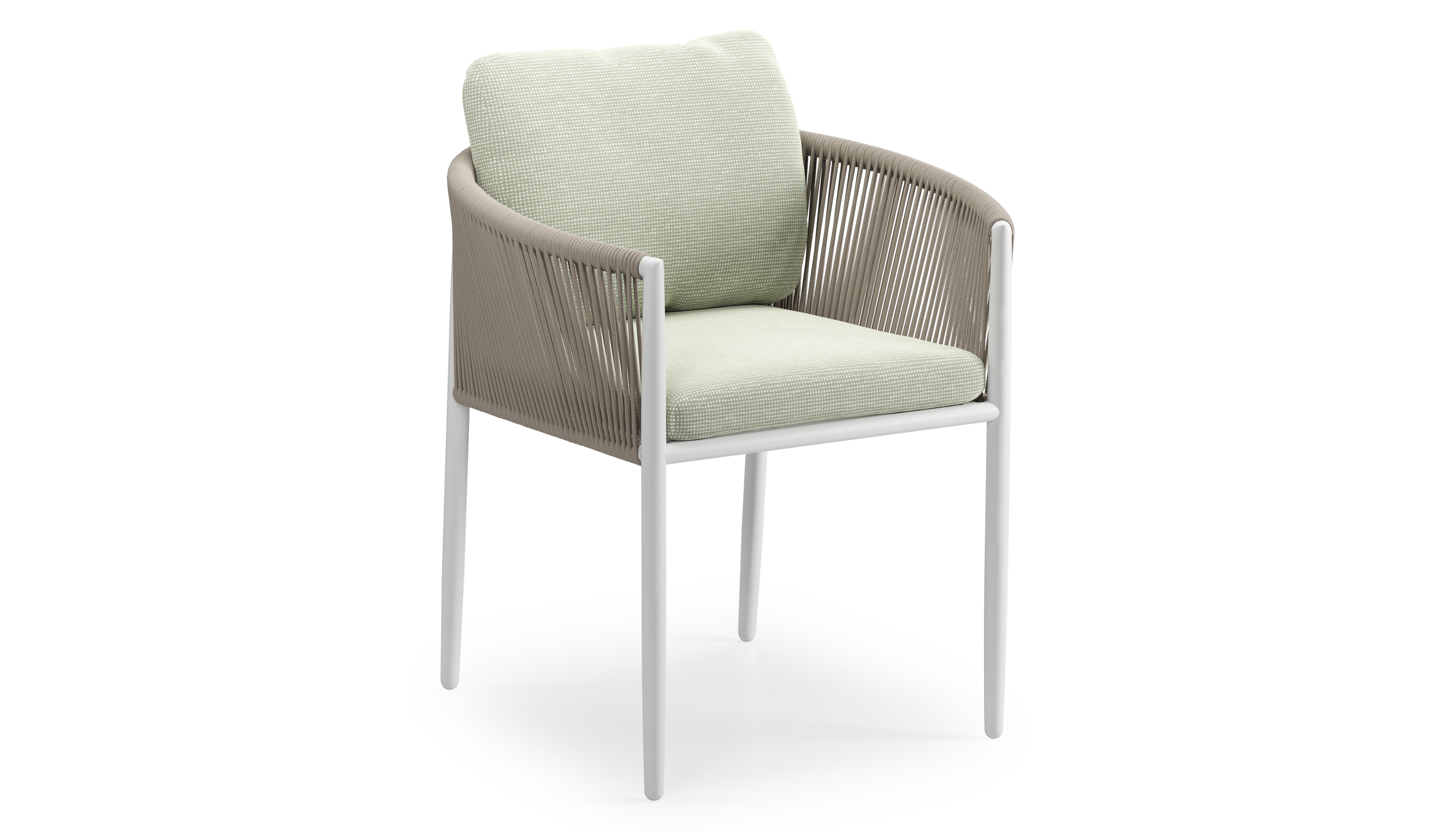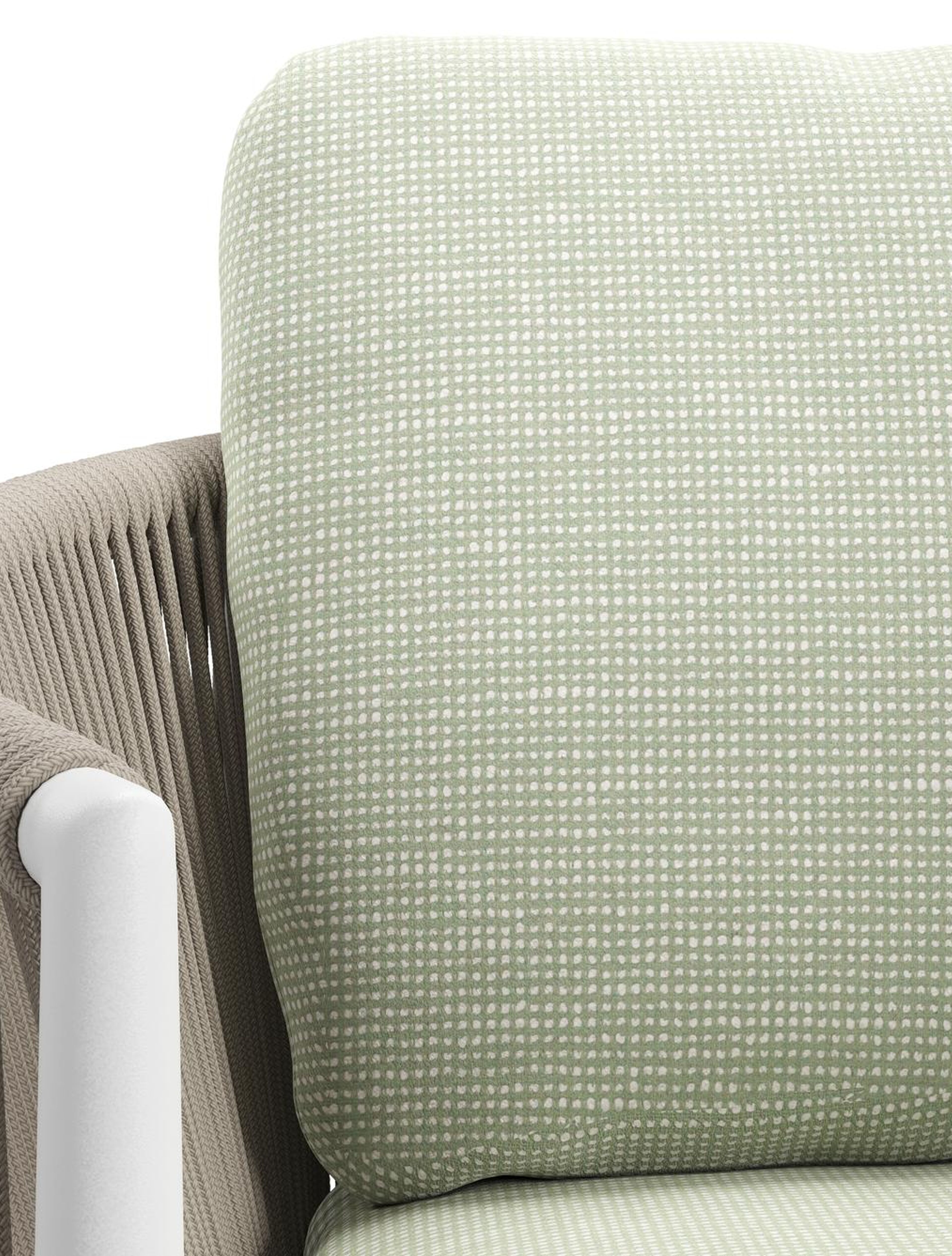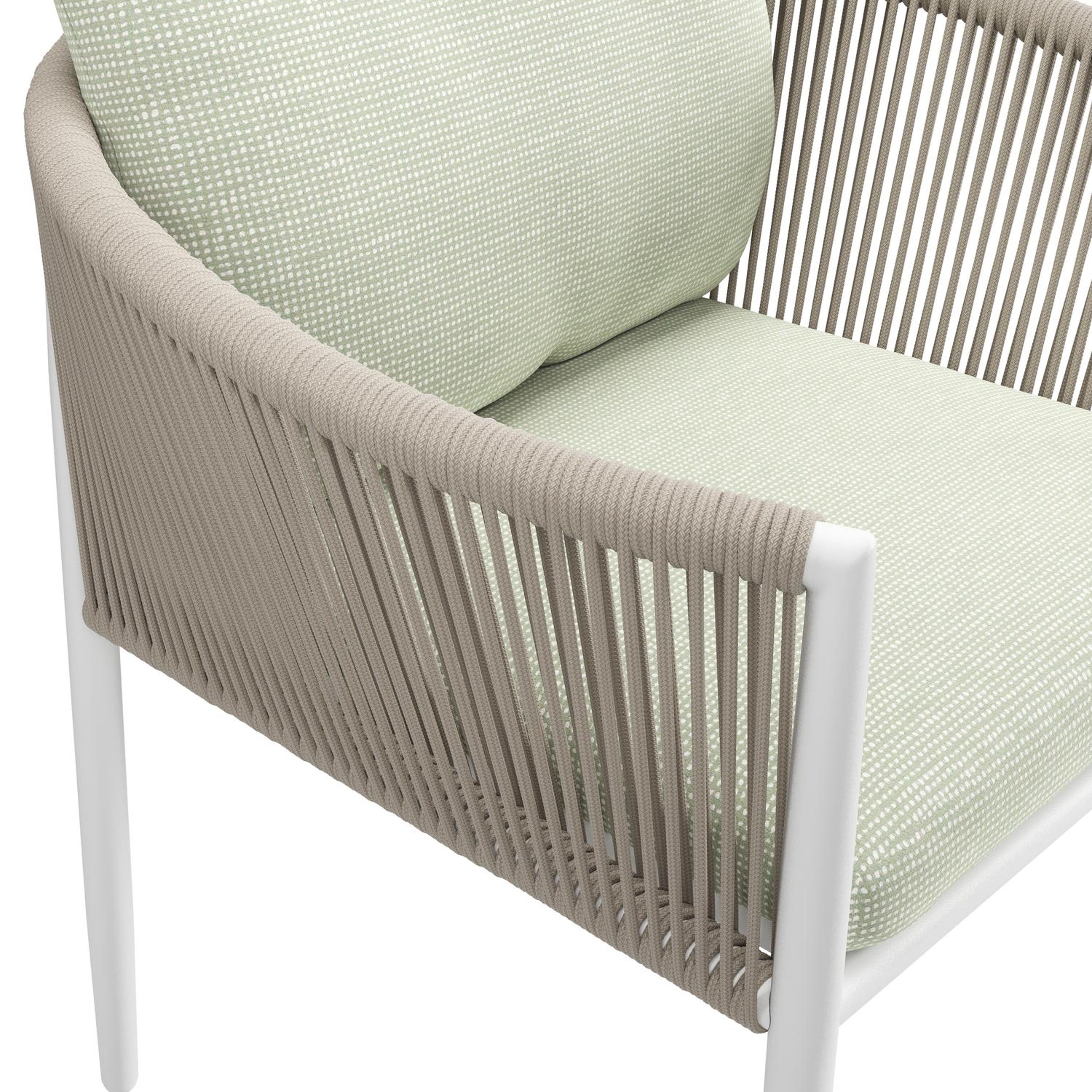 Organo tuinstoel in beige aluminium en beige verticaal geweven ronde rope met stoelkussen in All Weather Sunbrella® Luxe Slow Spirea | Exterioo tuinmeubelen