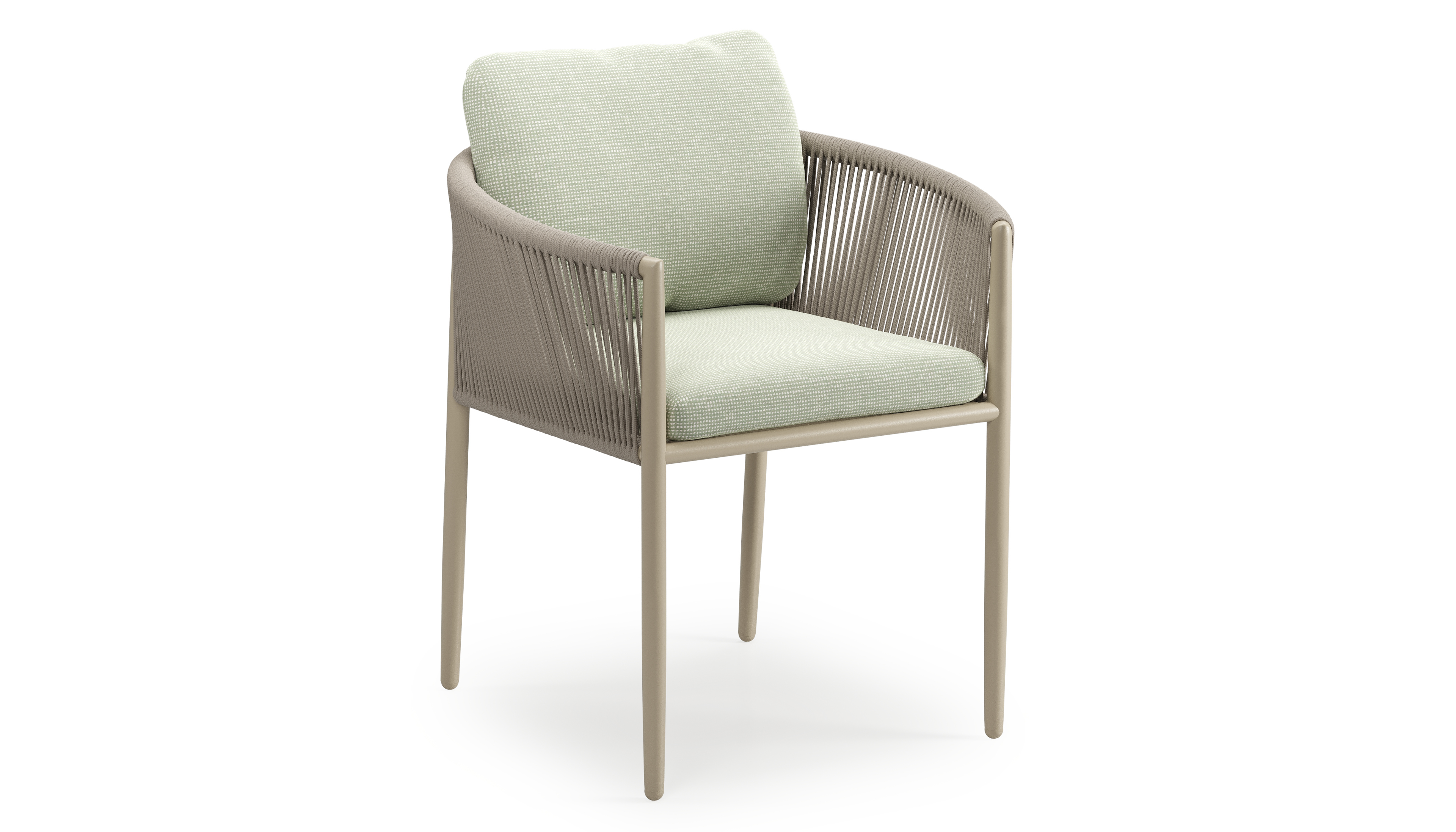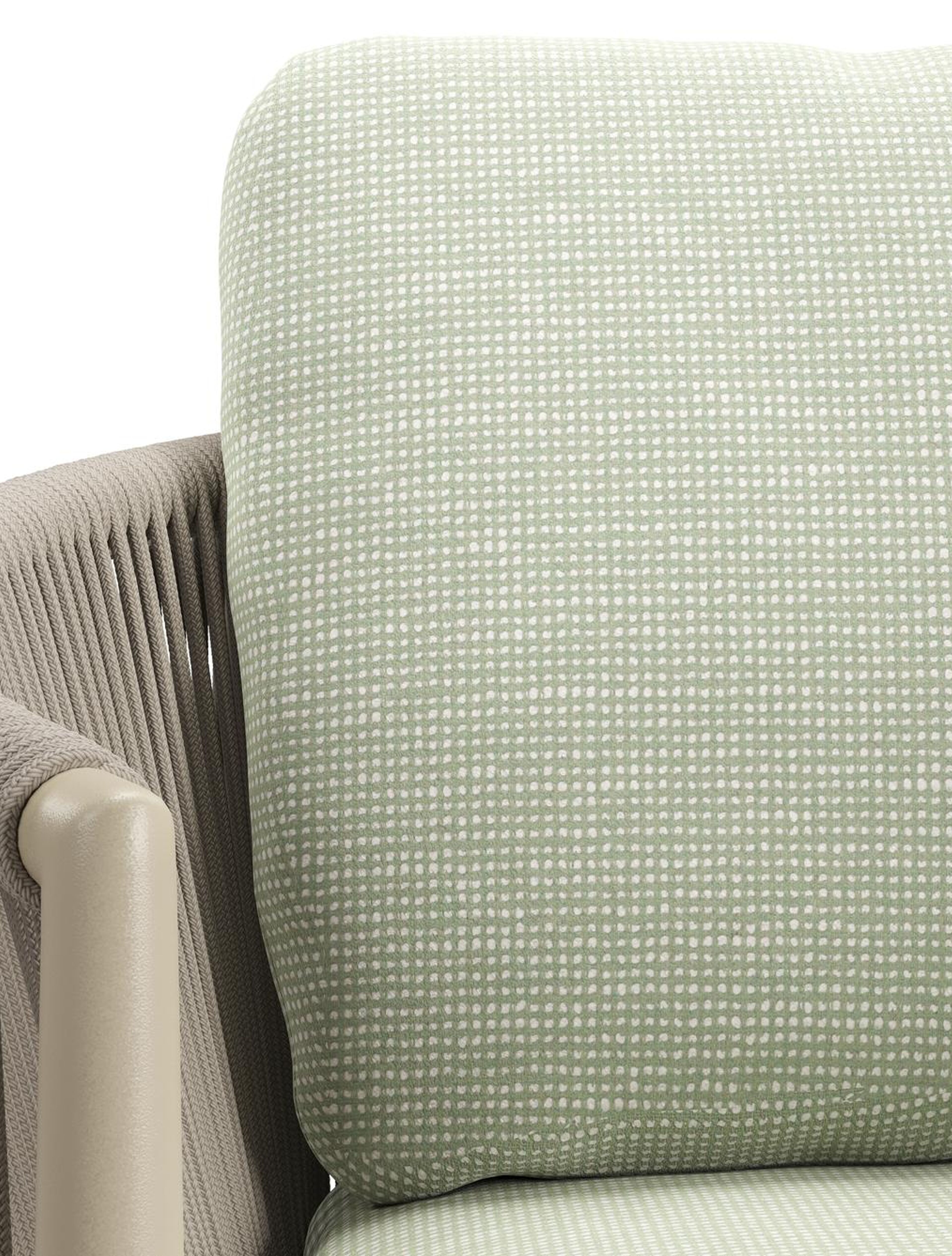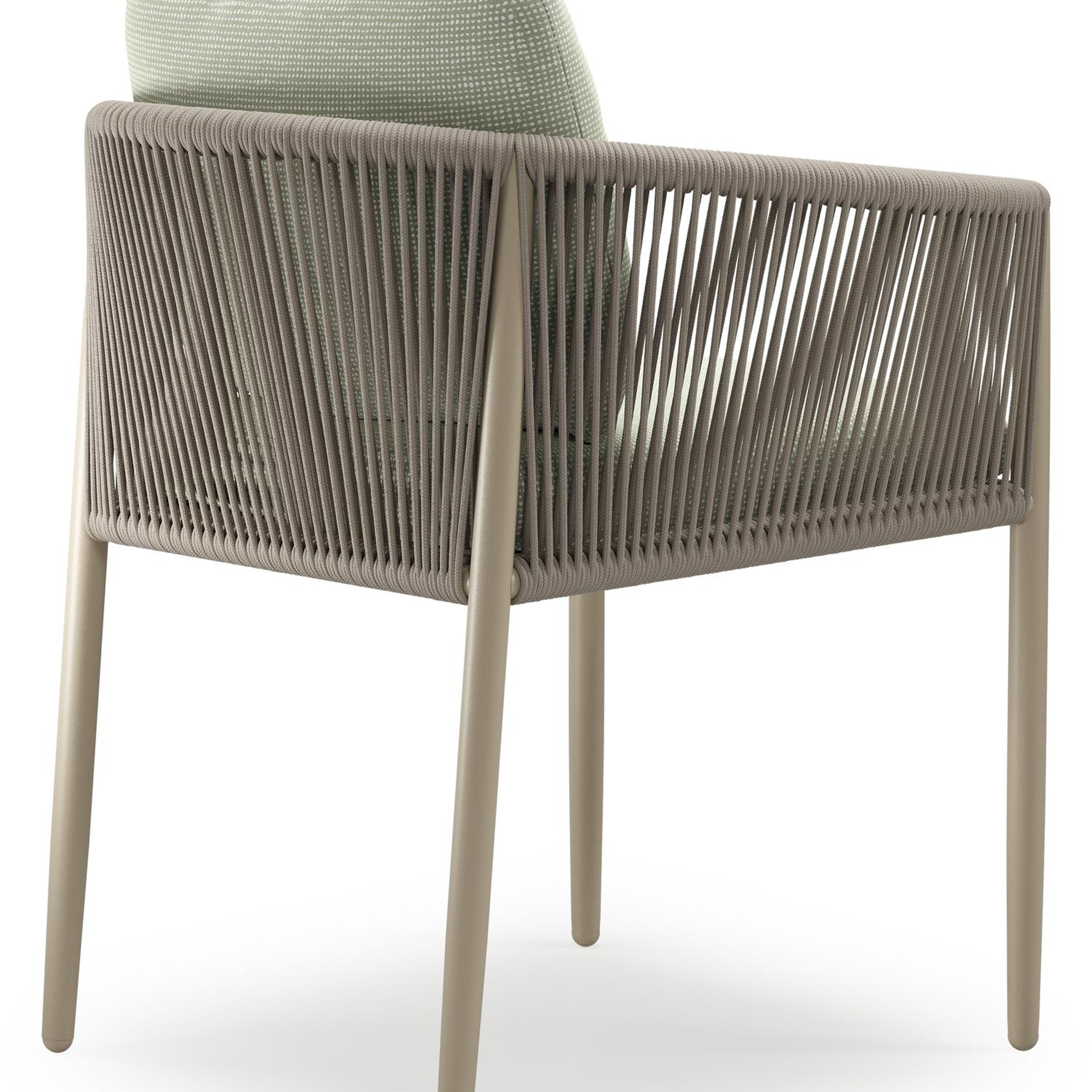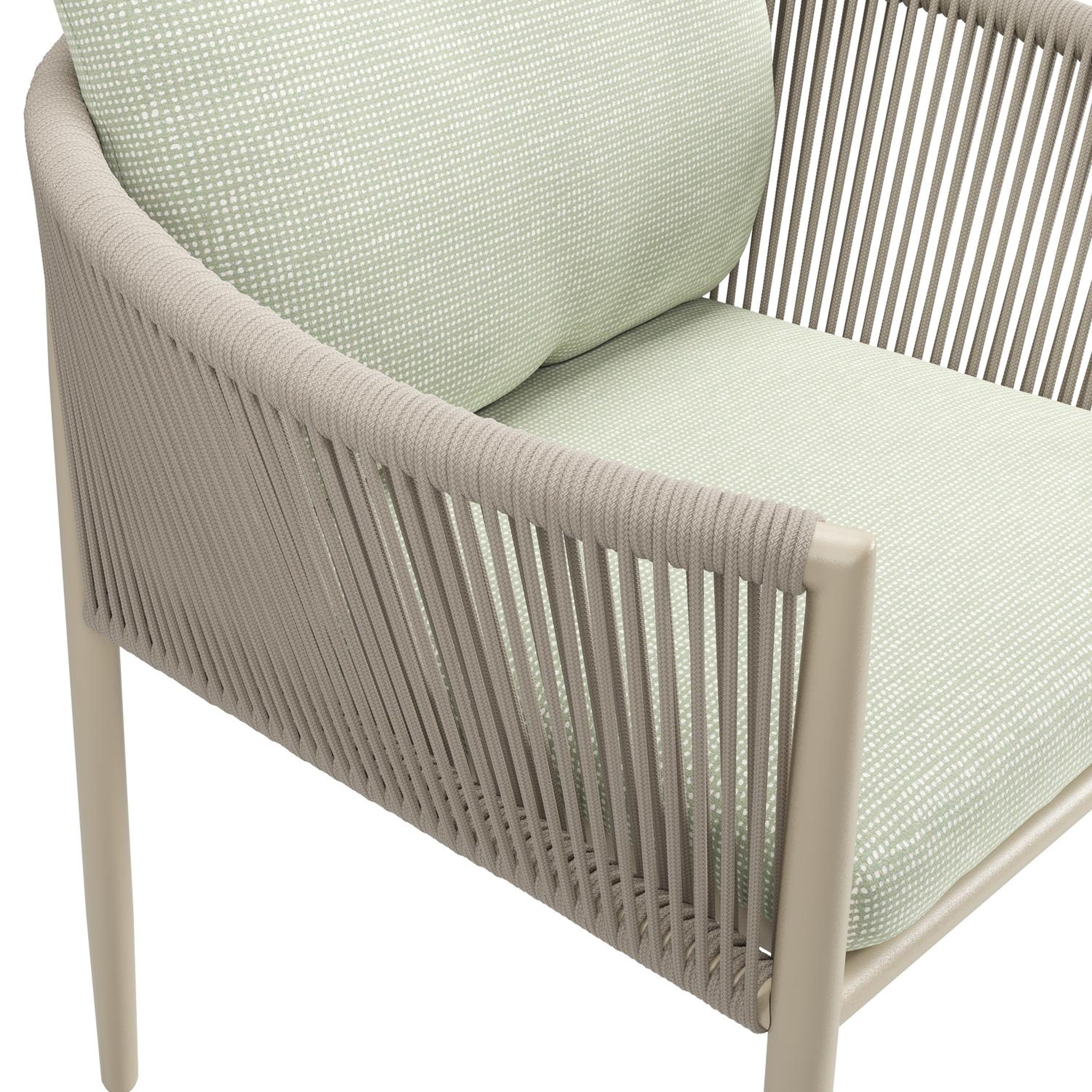 Organo tuinstoel in zwart aluminium en beige verticaal geweven ronde rope met stoelkussen in All Weather Sunbrella® Luxe Slow Spirea | Exterioo tuinmeubelen