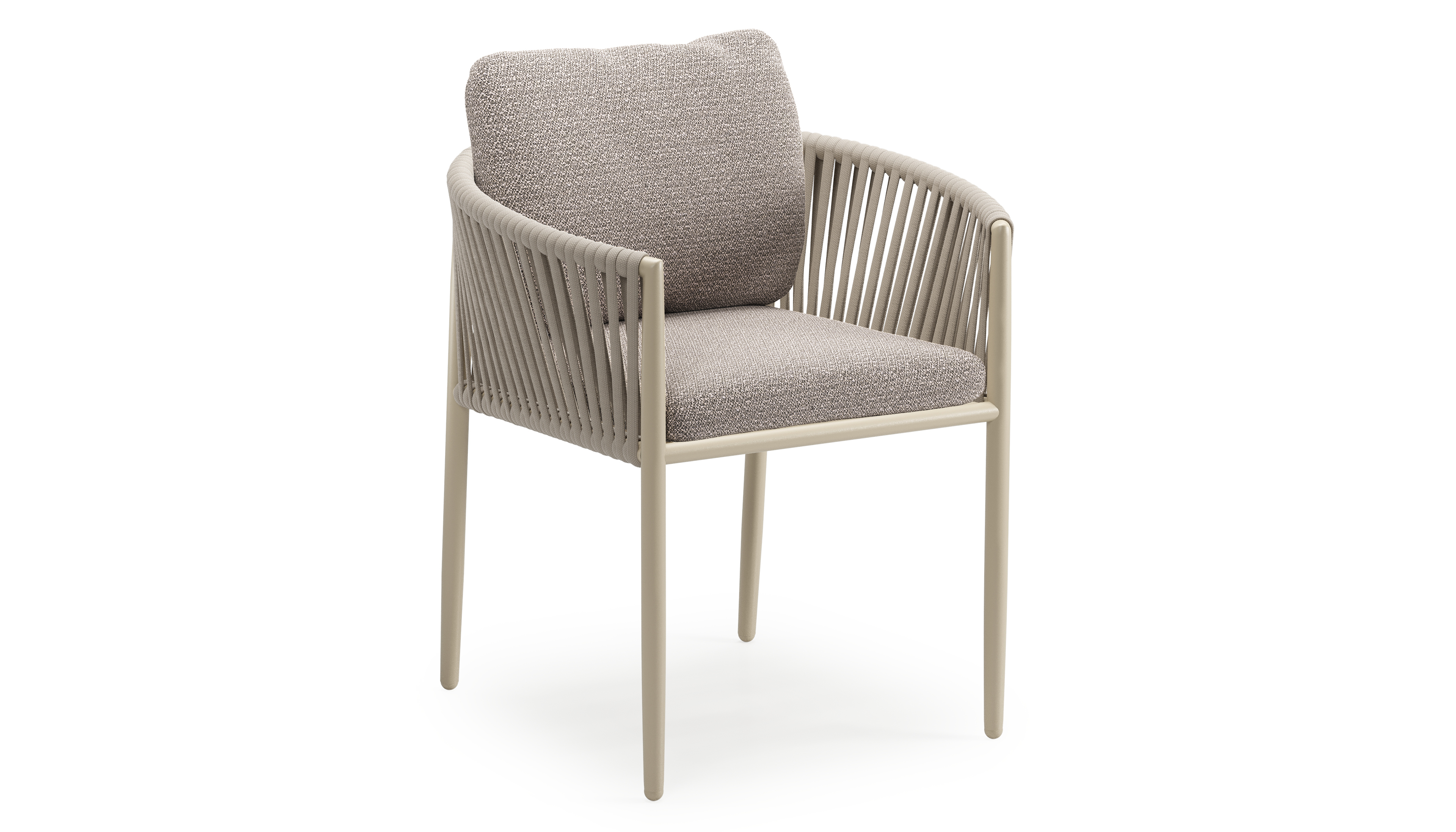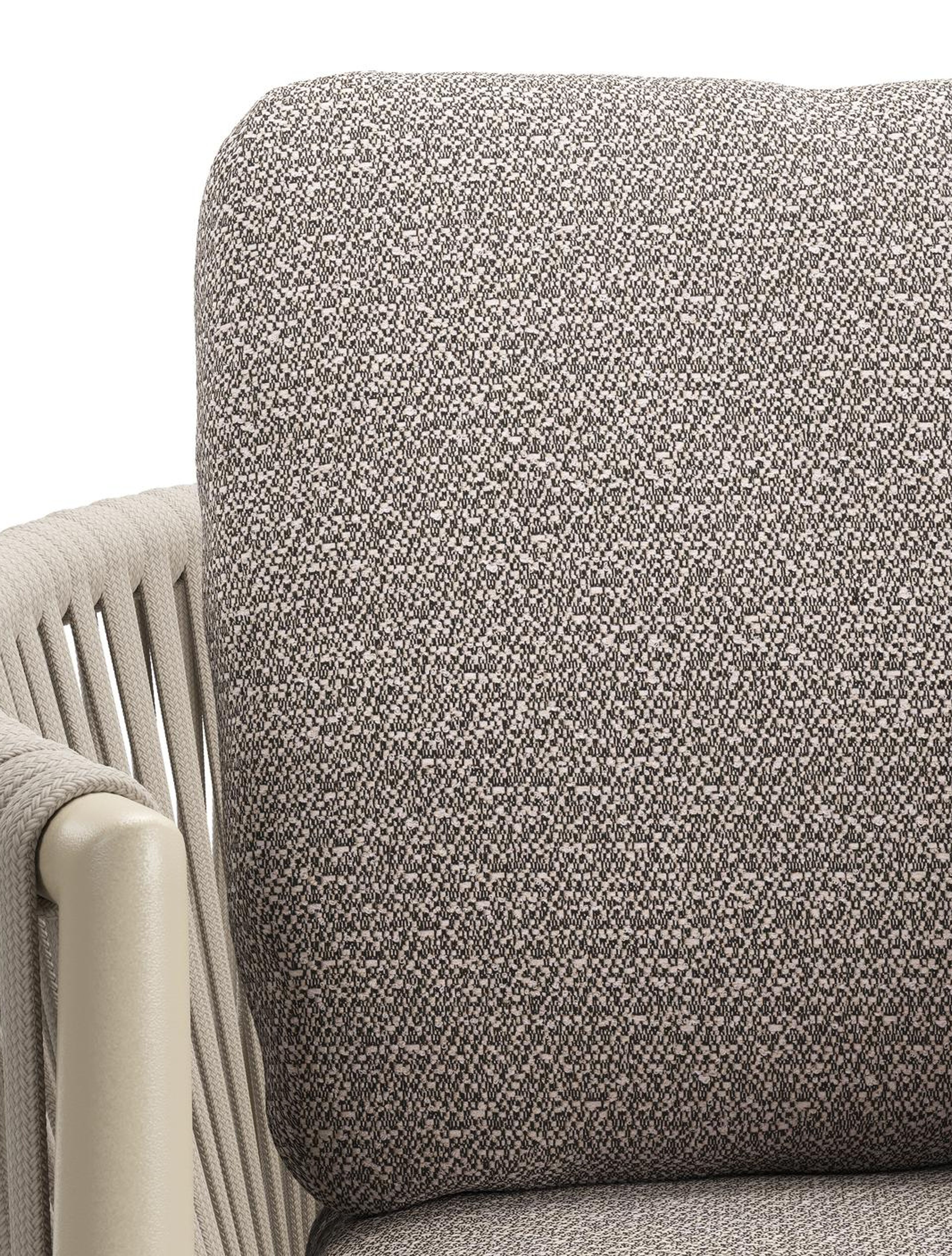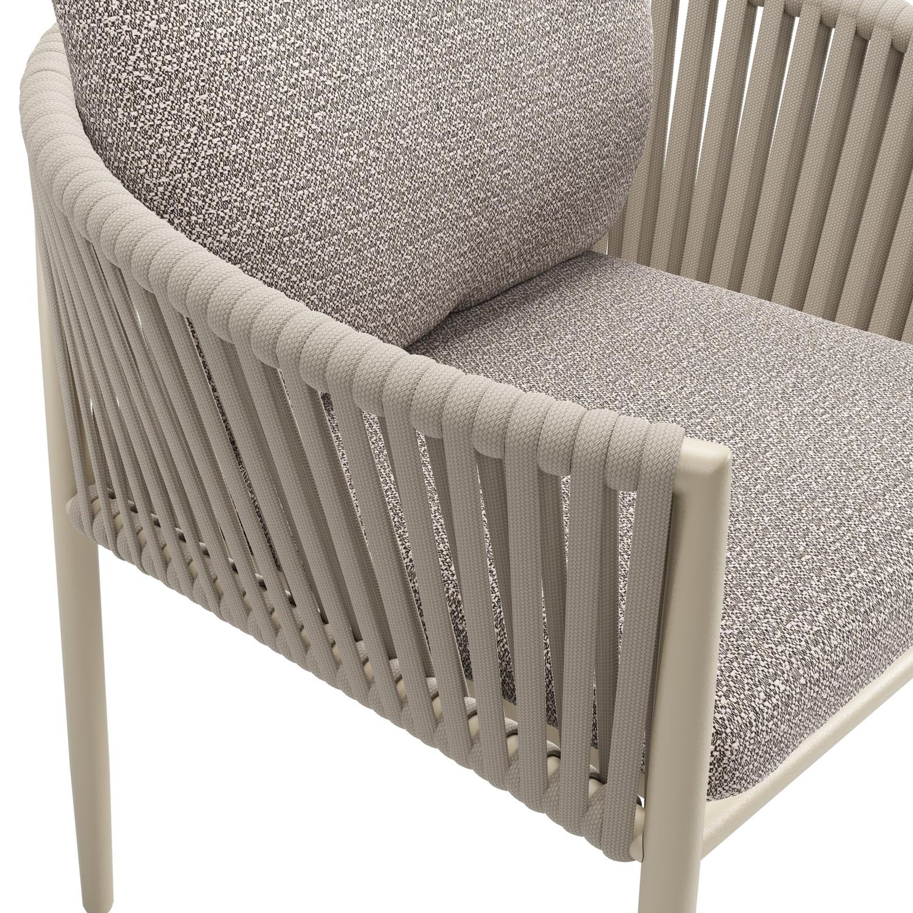 Organo tuinstoel in beige aluminium en beige verticaal geweven luxe vlakke rope met zitkussen in All Weather Sunbrella® Luxe Wander Granite | Exterioo tuinmeubelen