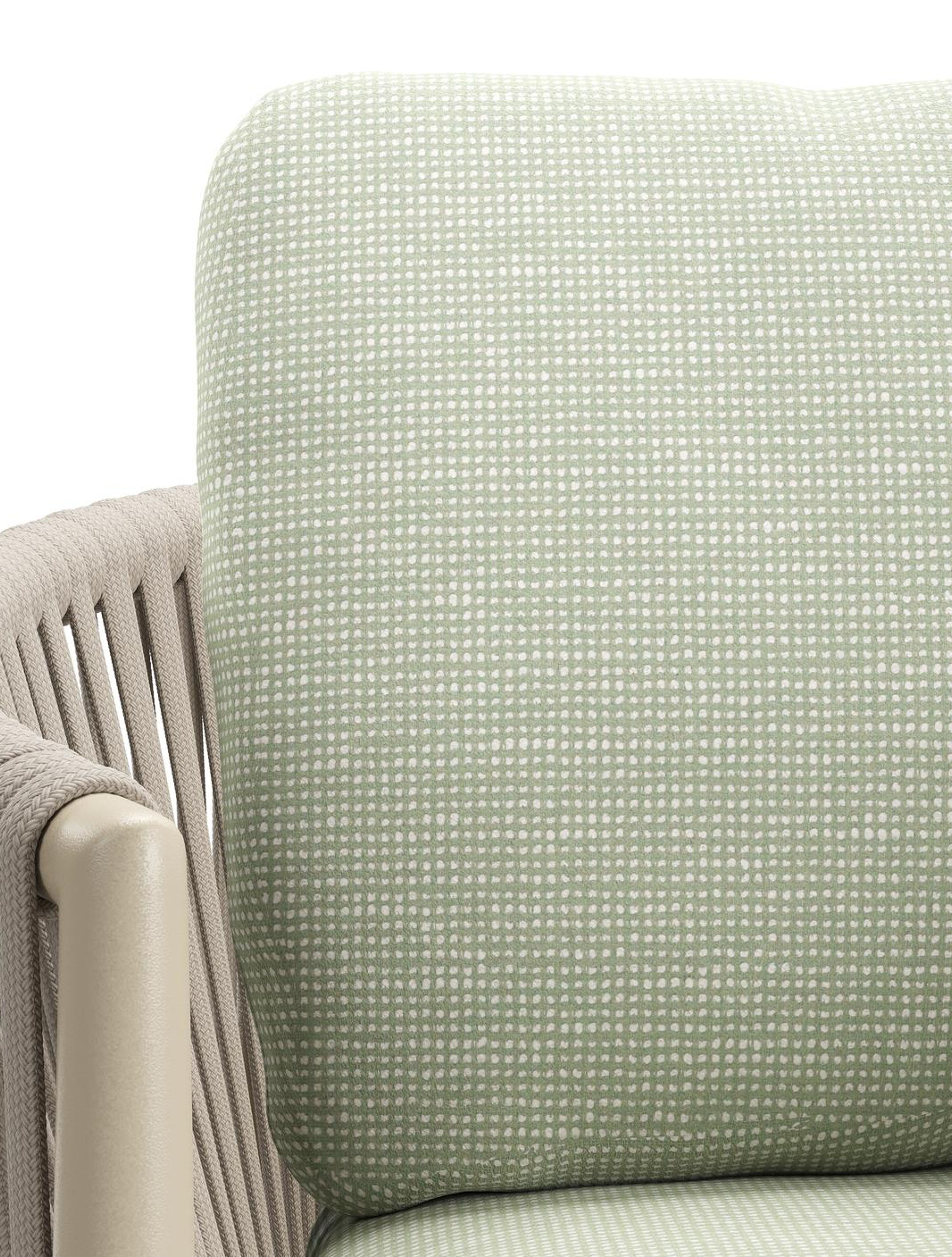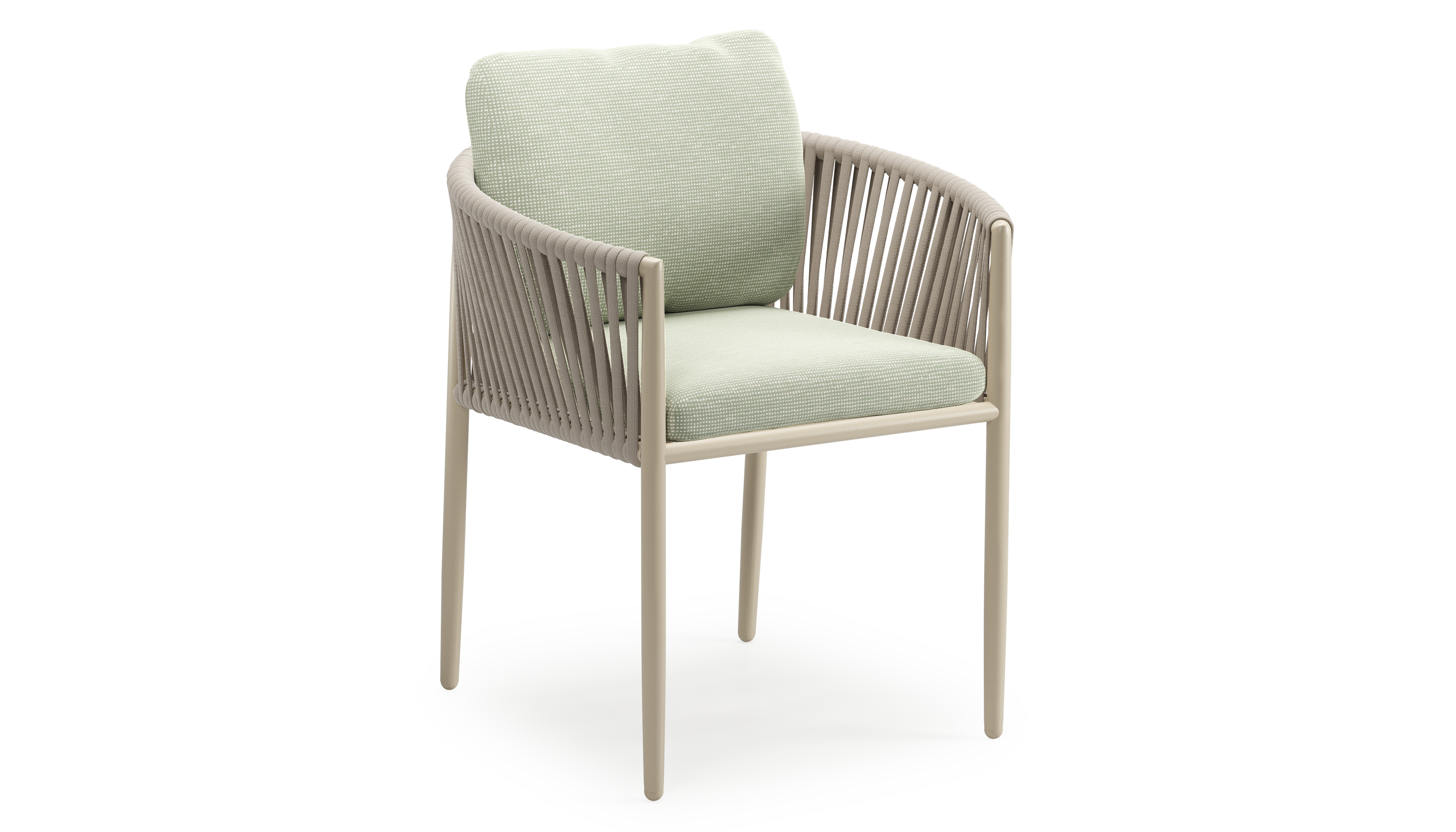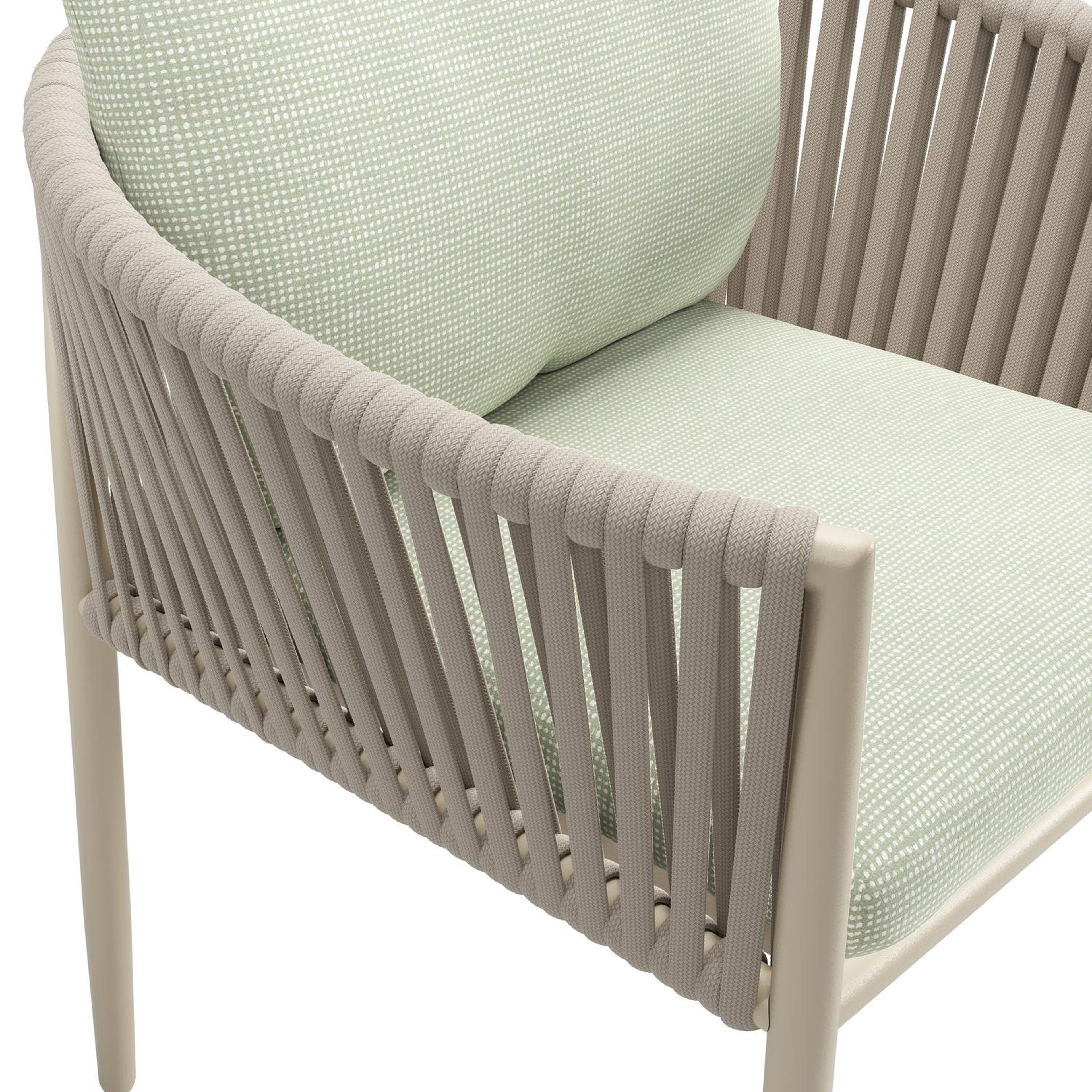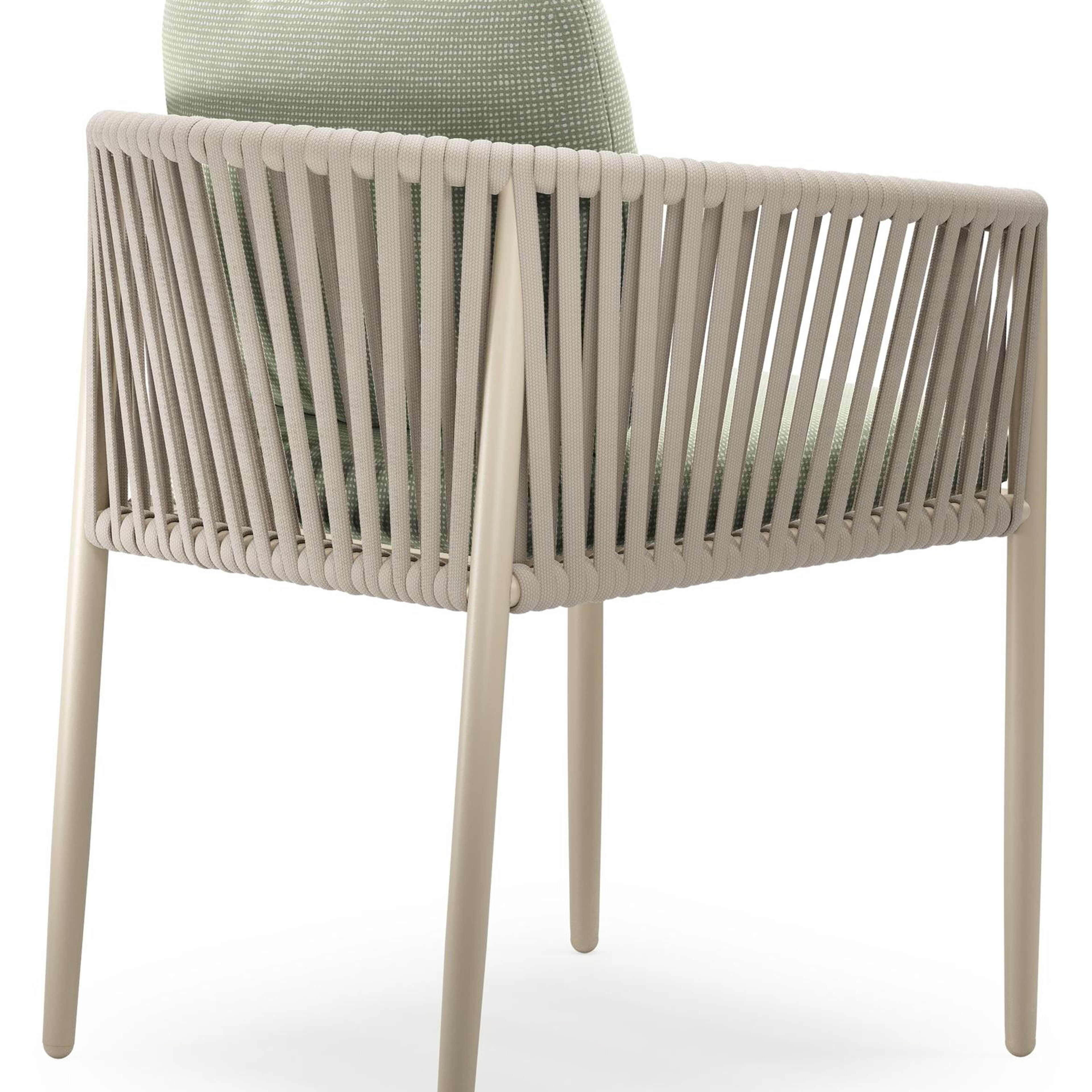 Organo tuinstoel in beige aluminium en beige verticaal geweven luxe vlakke rope met zitkussen in All Weather Sunbrella® Luxe Slow Spirea | Exterioo tuinmeubelen
