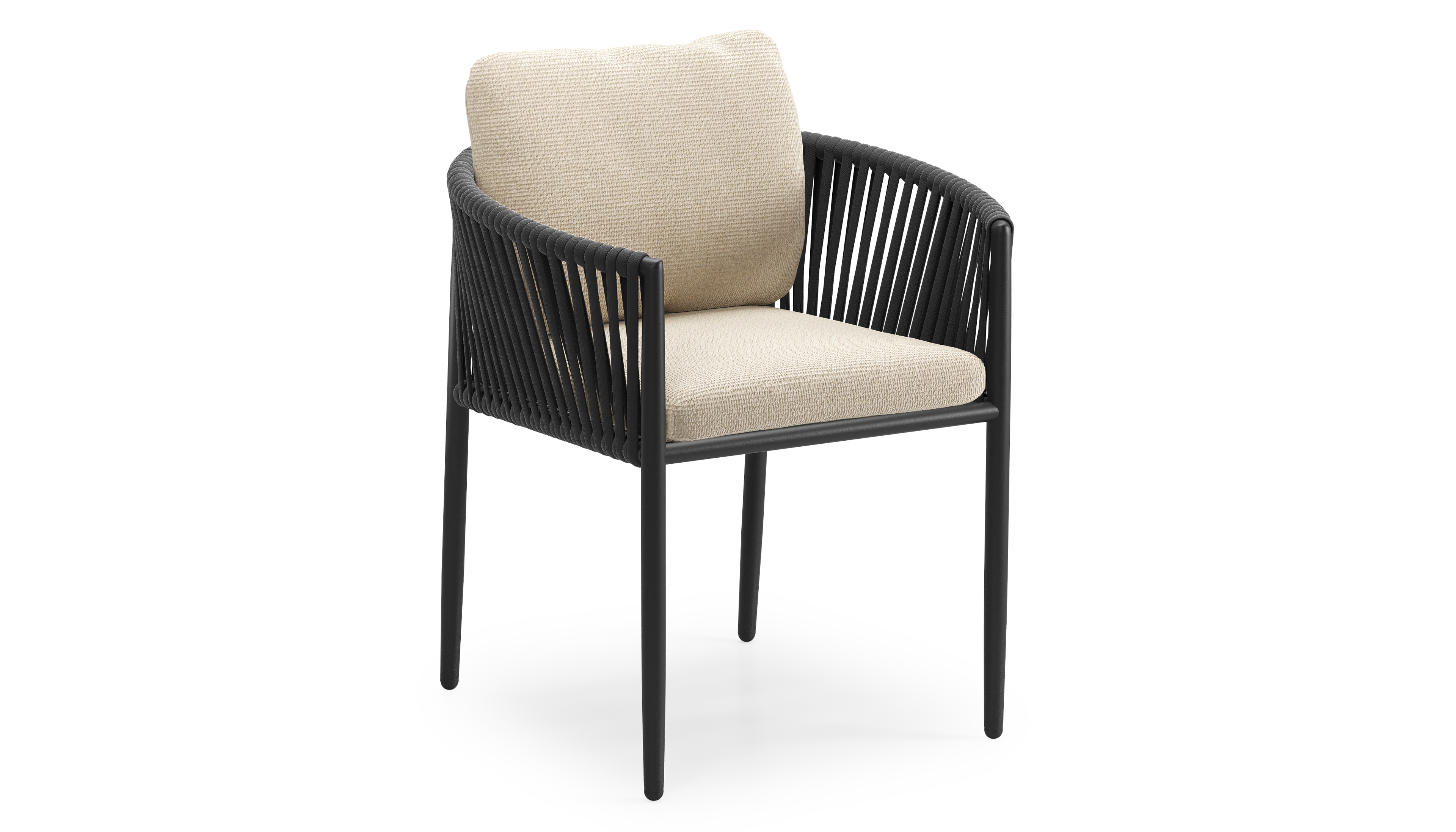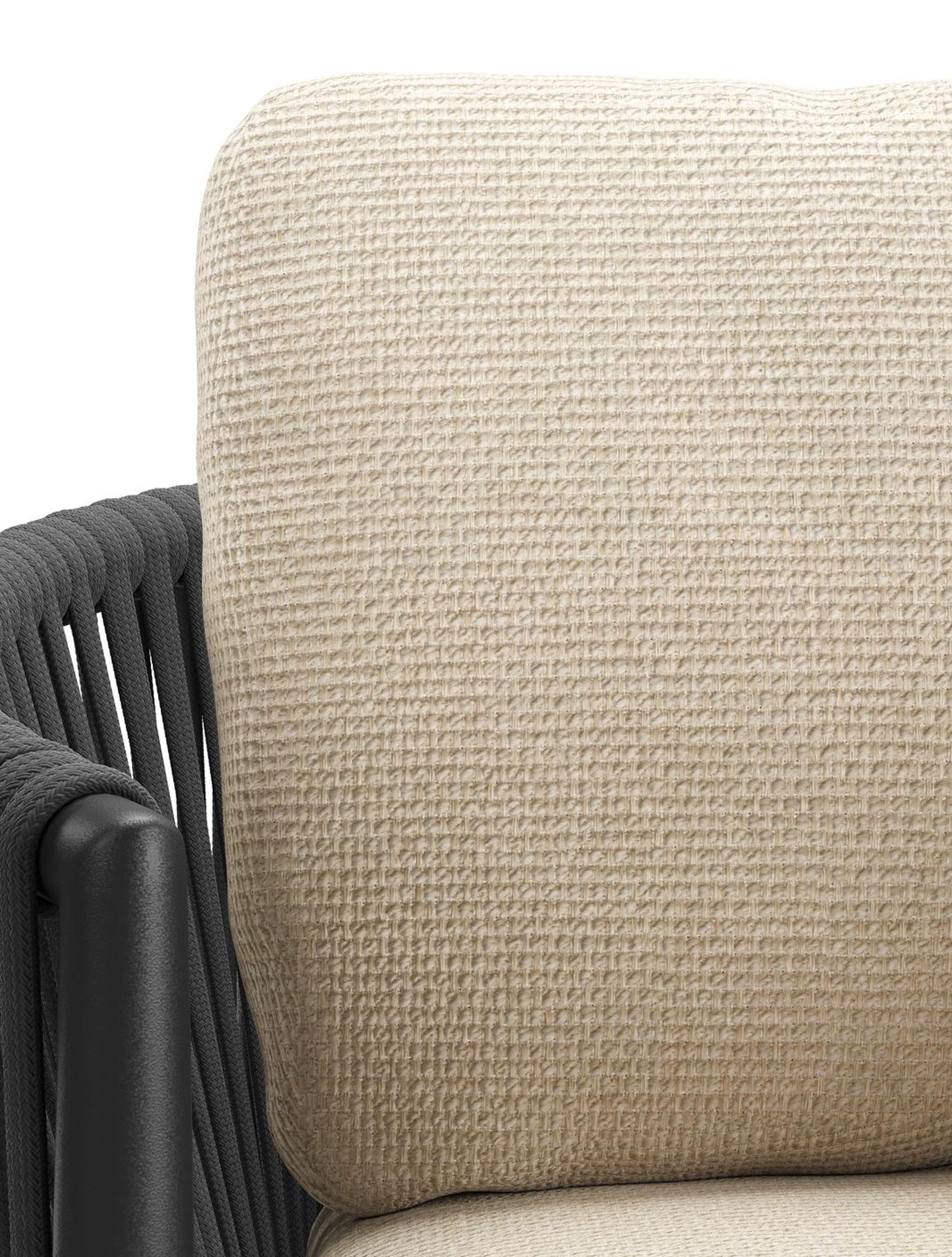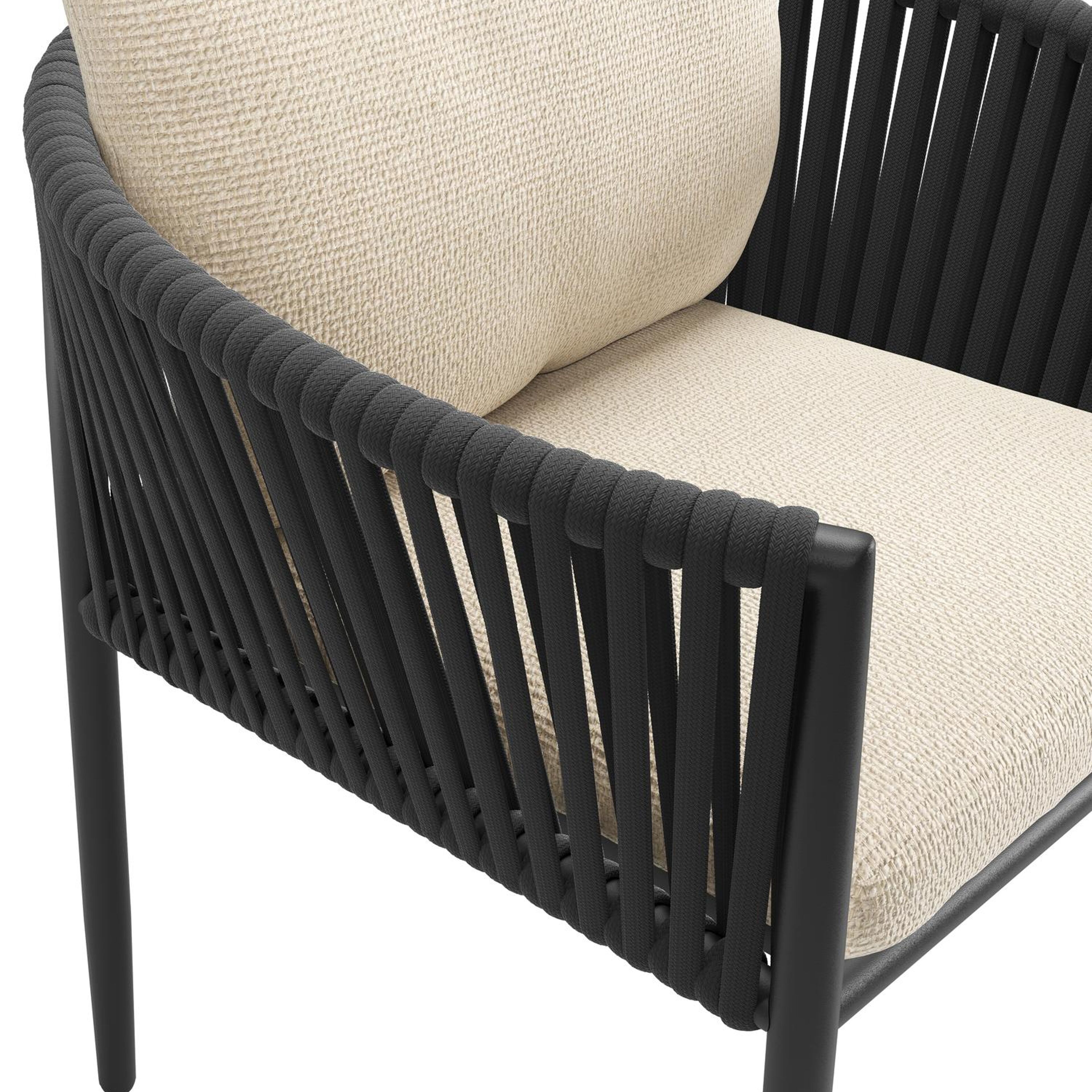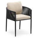 Organo tuinstoel in zwart aluminium en zwart verticaal geweven luxe vlakke rope met zitkussen in All Weather Cosytica Althea Chalk | Exterioo tuinmeubelen