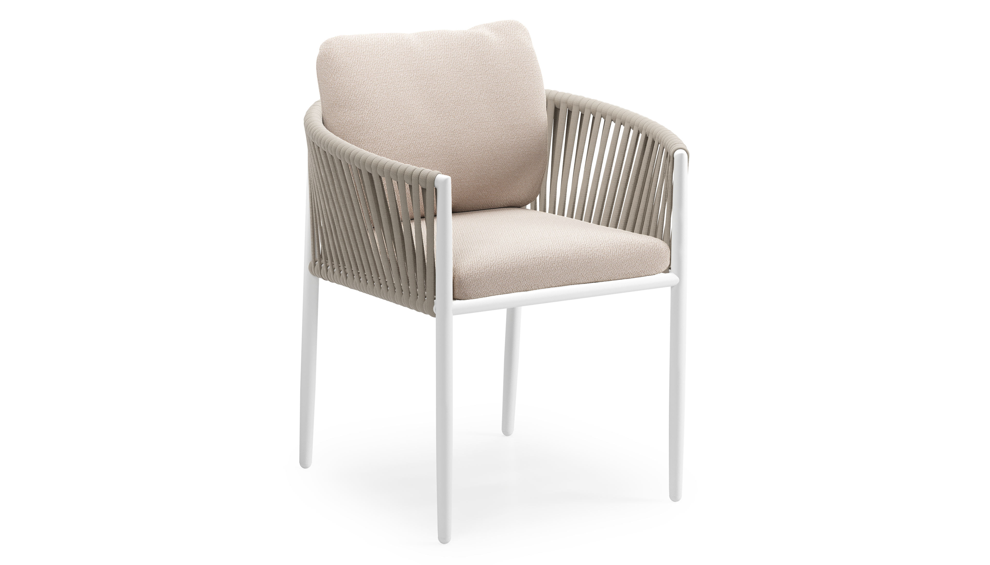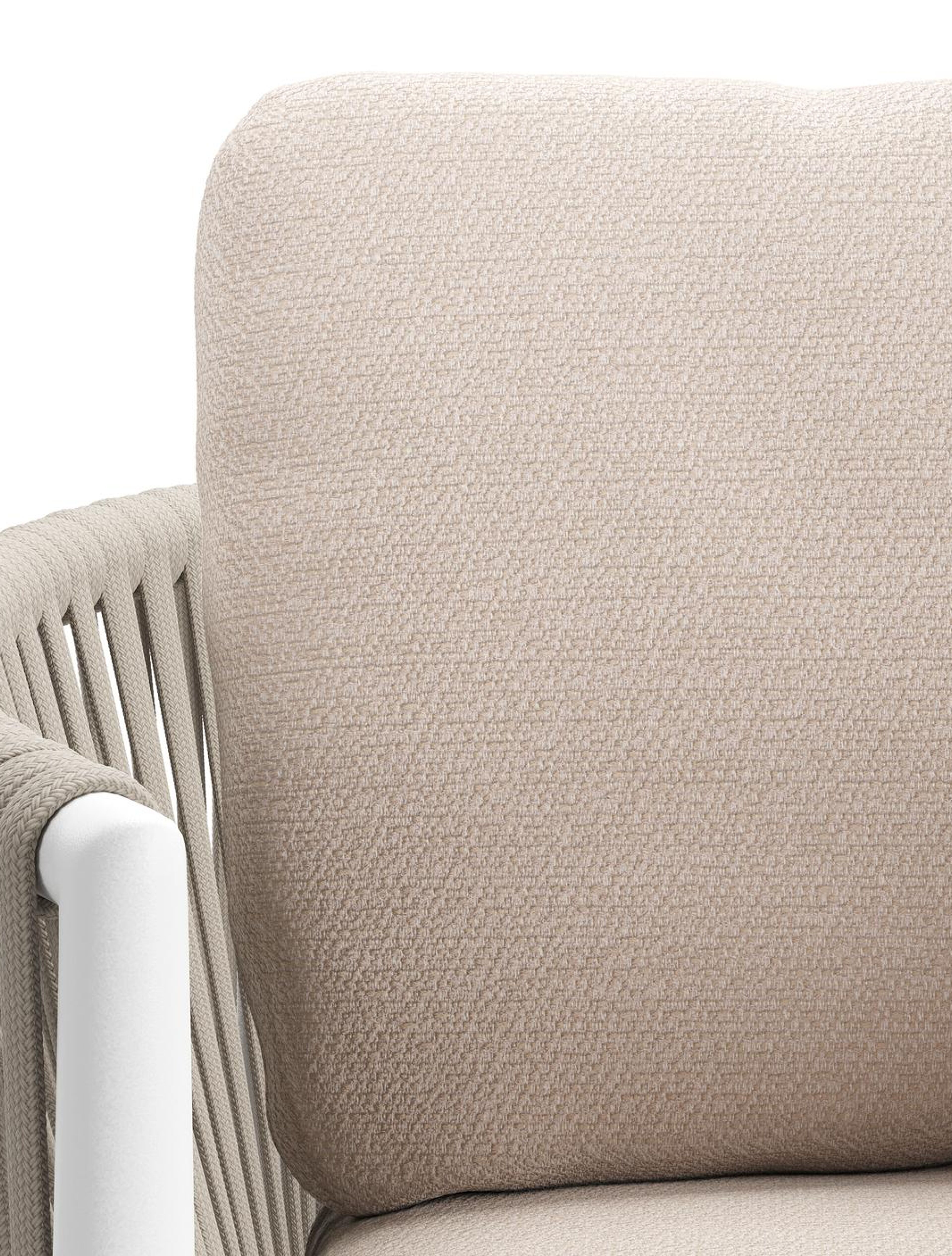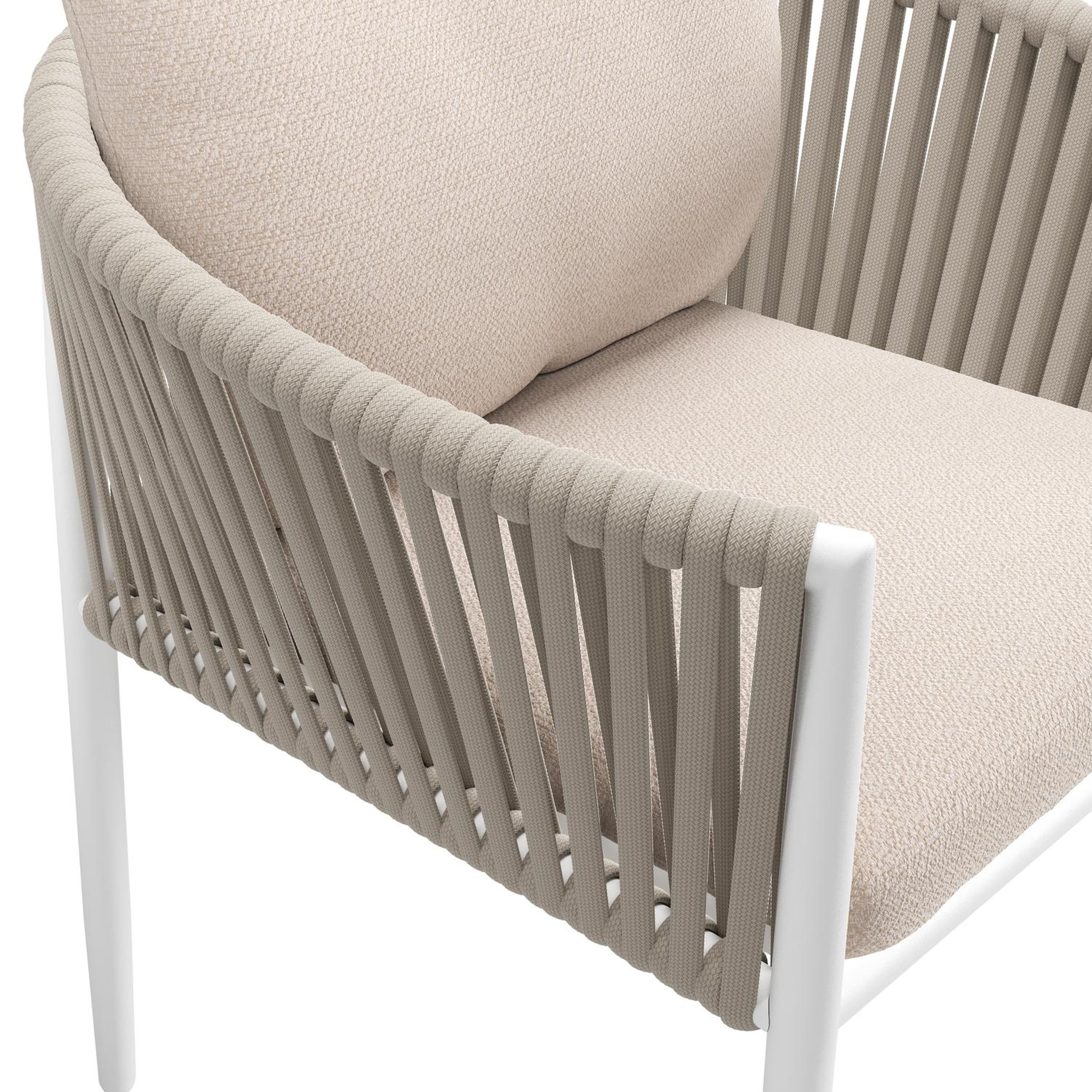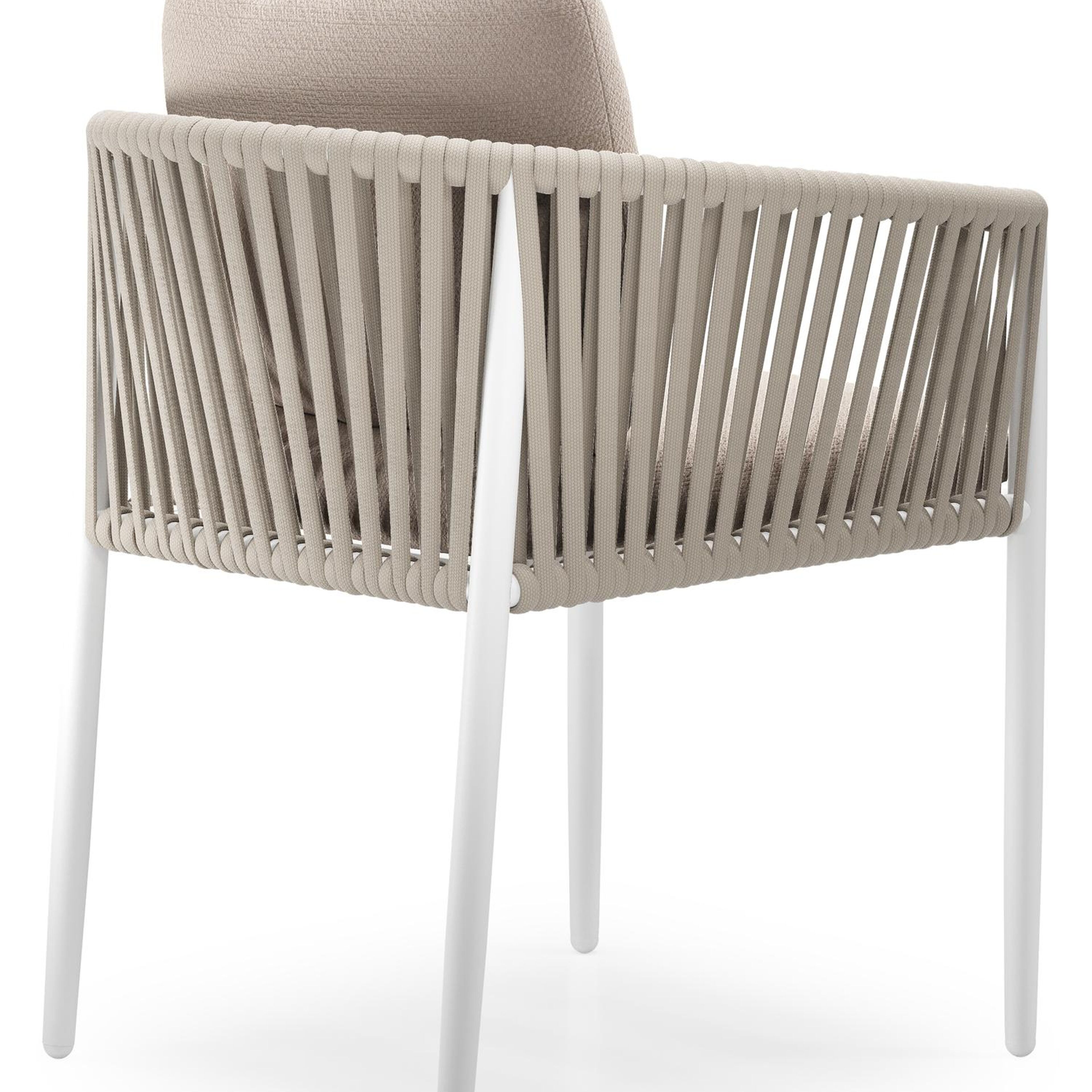 Organo tuinstoel in wit aluminium en beige verticaal geweven luxe vlakke rope met zitkussen in All Weather Sunbrella® Luxe Wander Pilat | Exterioo tuinmeubelen