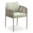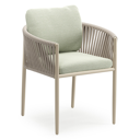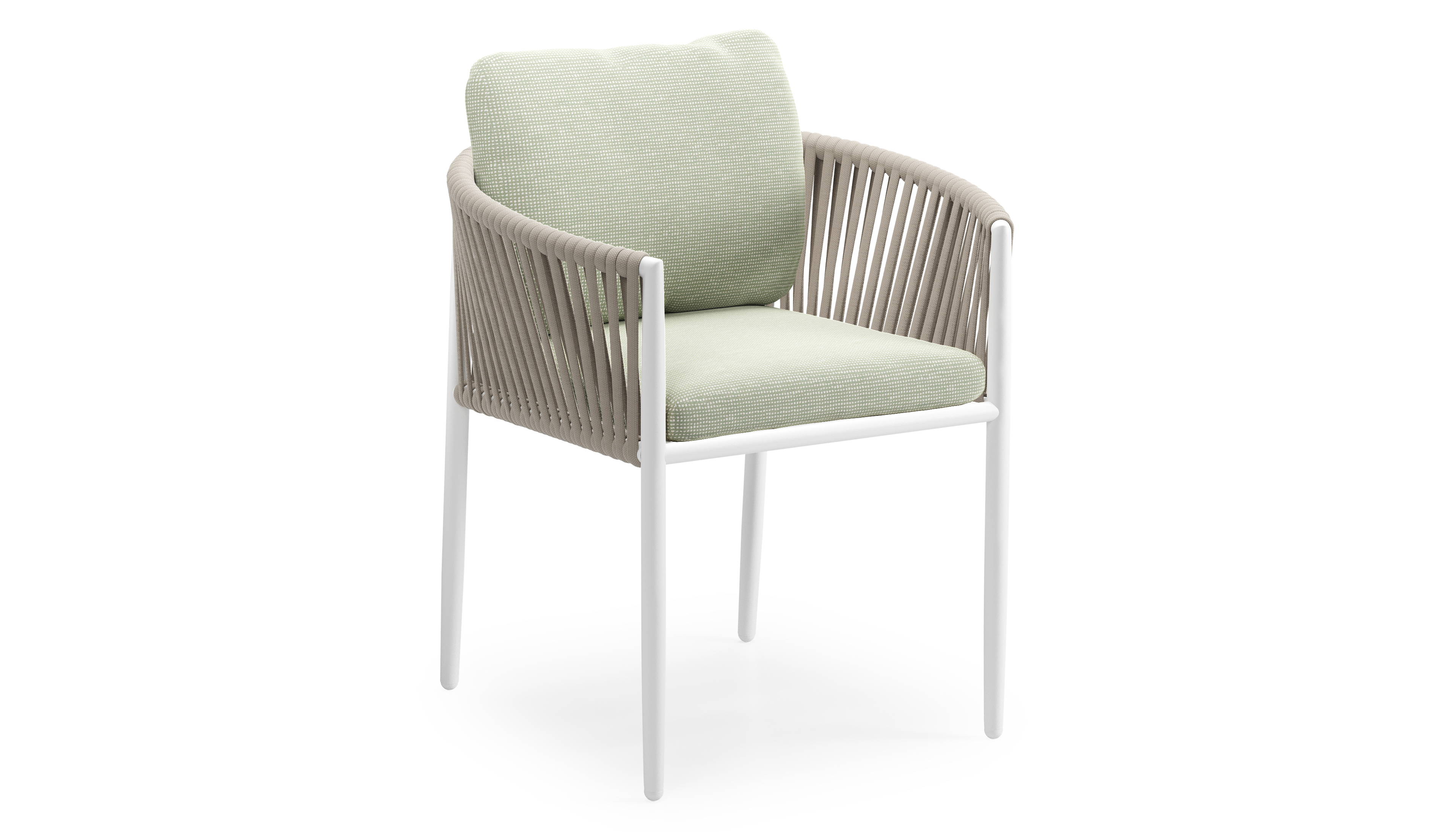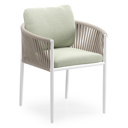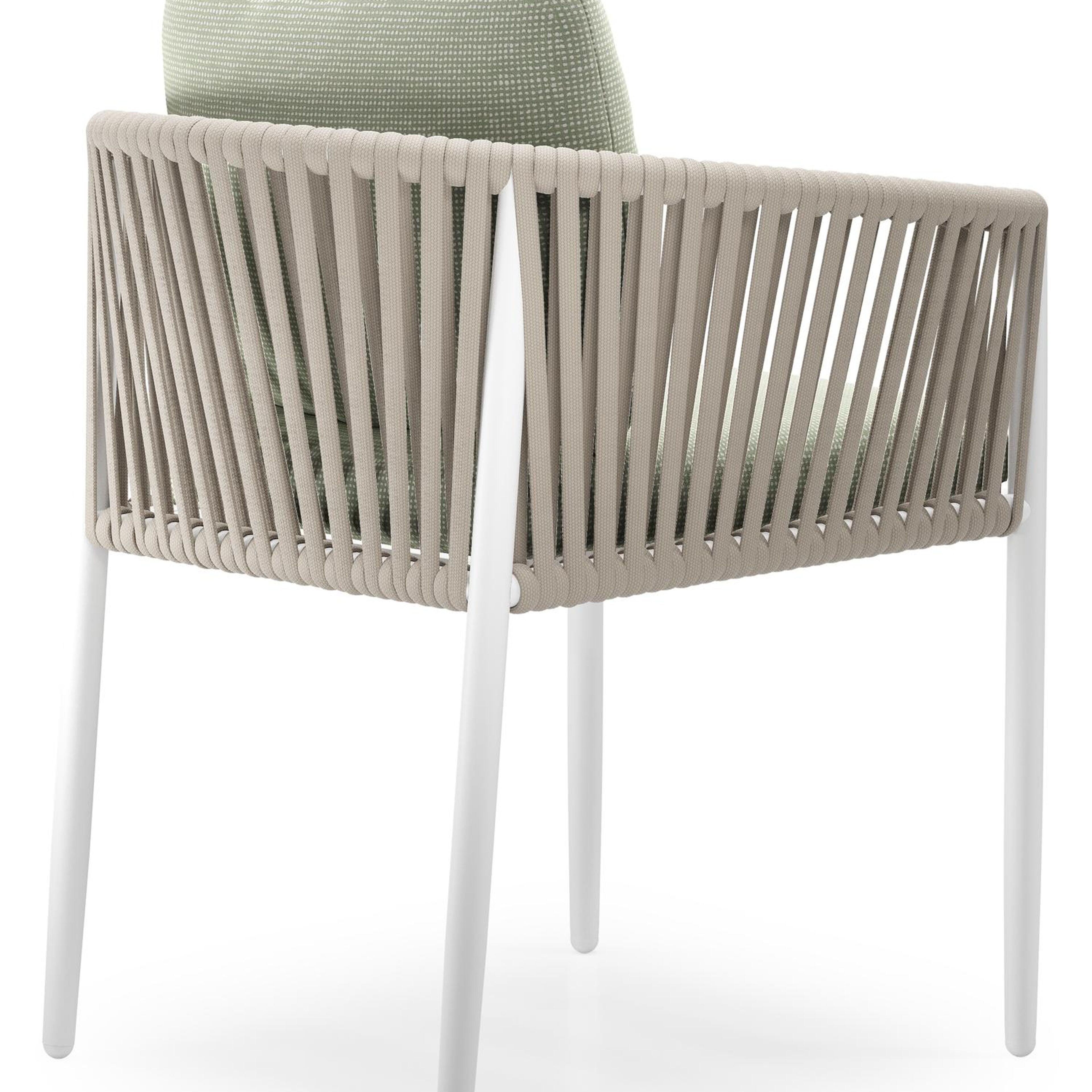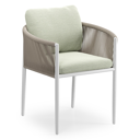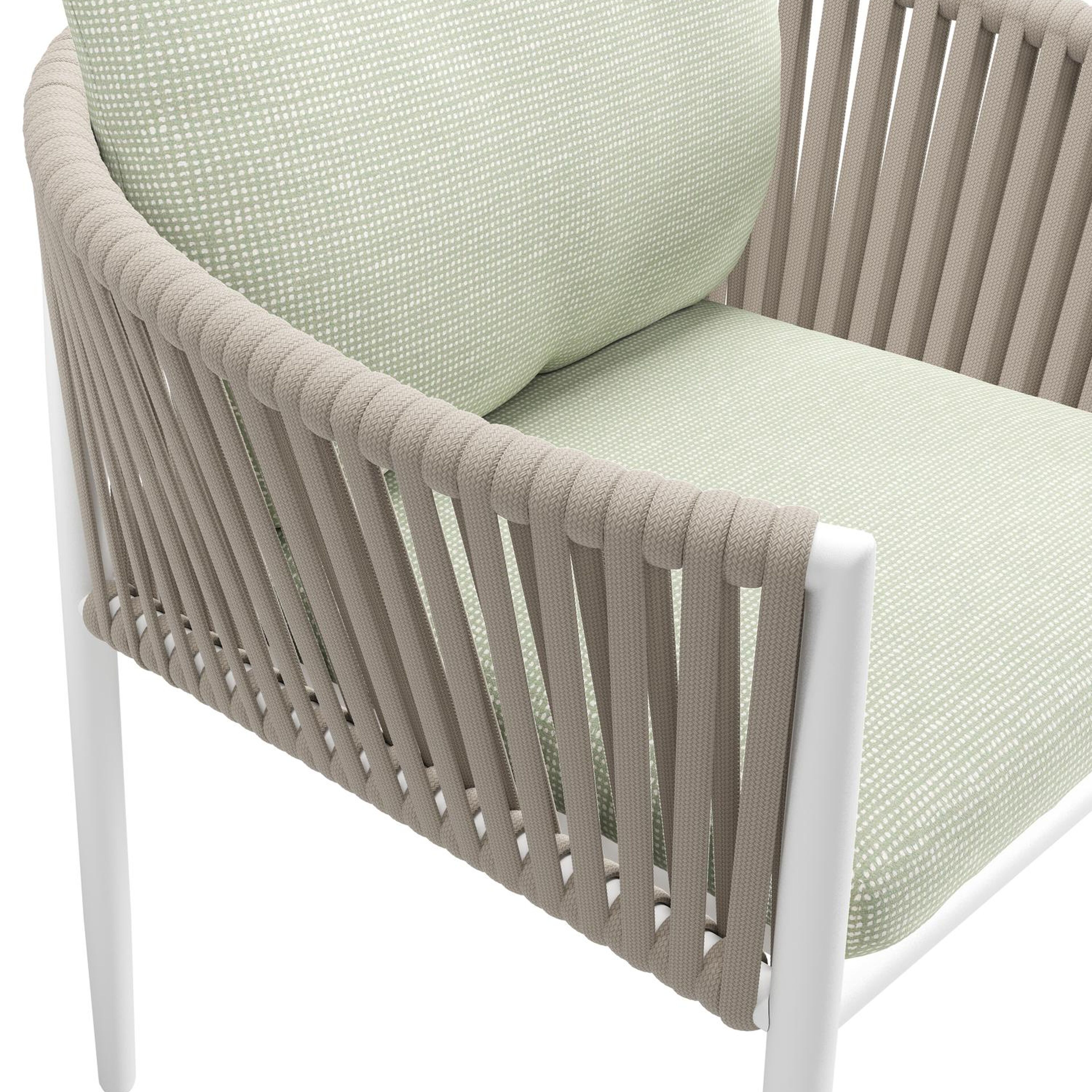 Organo tuinstoel in wit aluminium en beige verticaal geweven luxe vlakke rope met zitkussen in All Weather Sunbrella® Luxe Slow Spirea | Exterioo tuinmeubelen