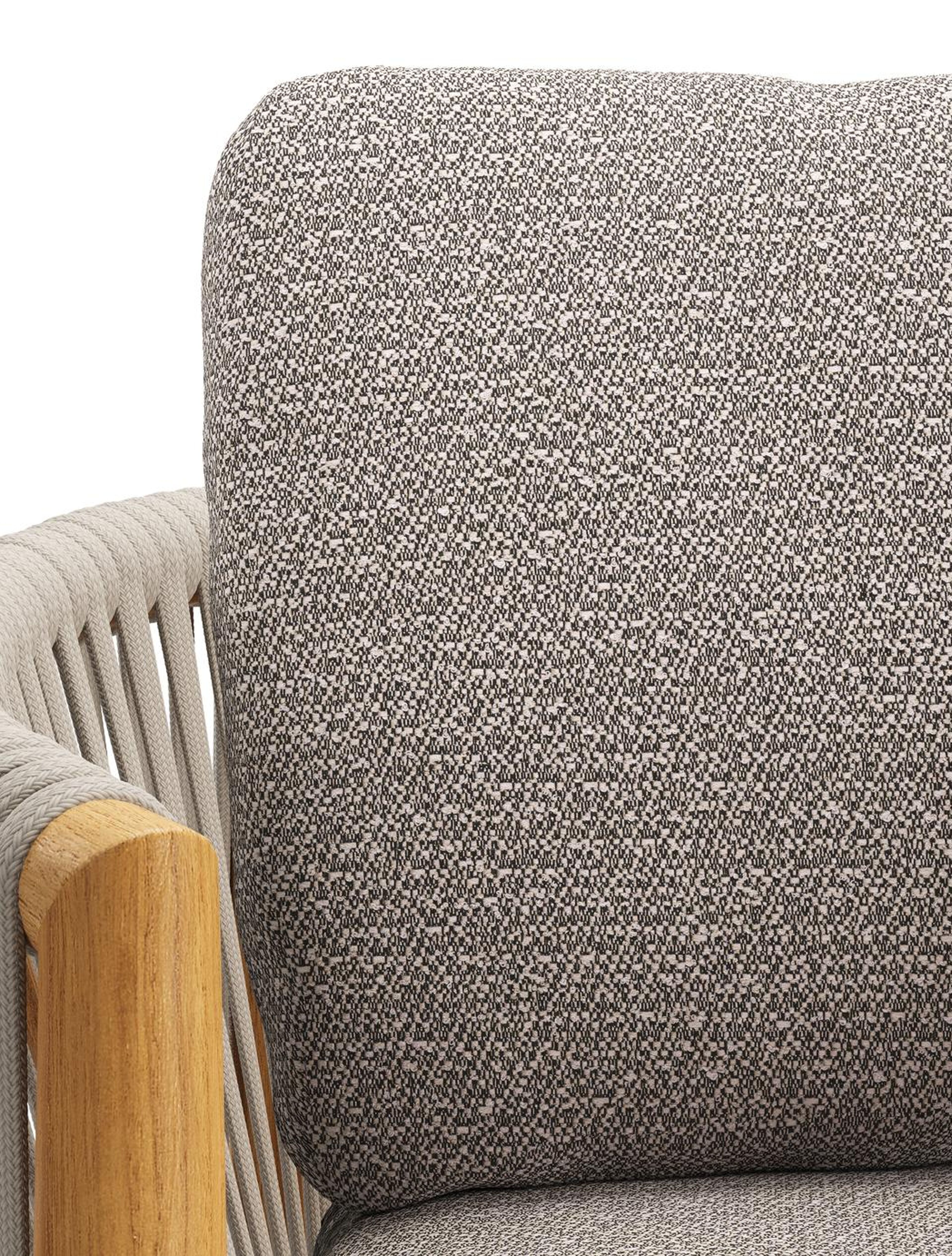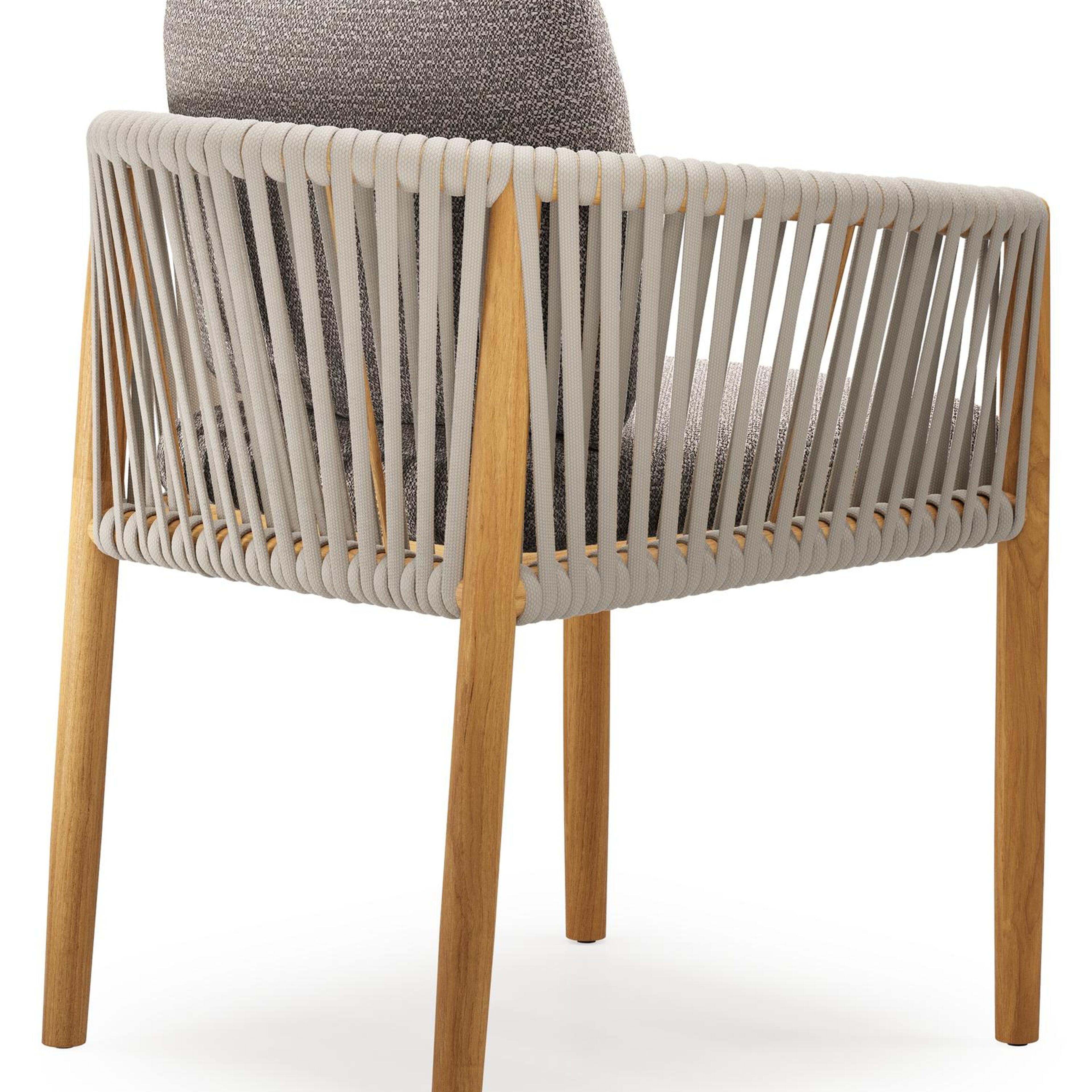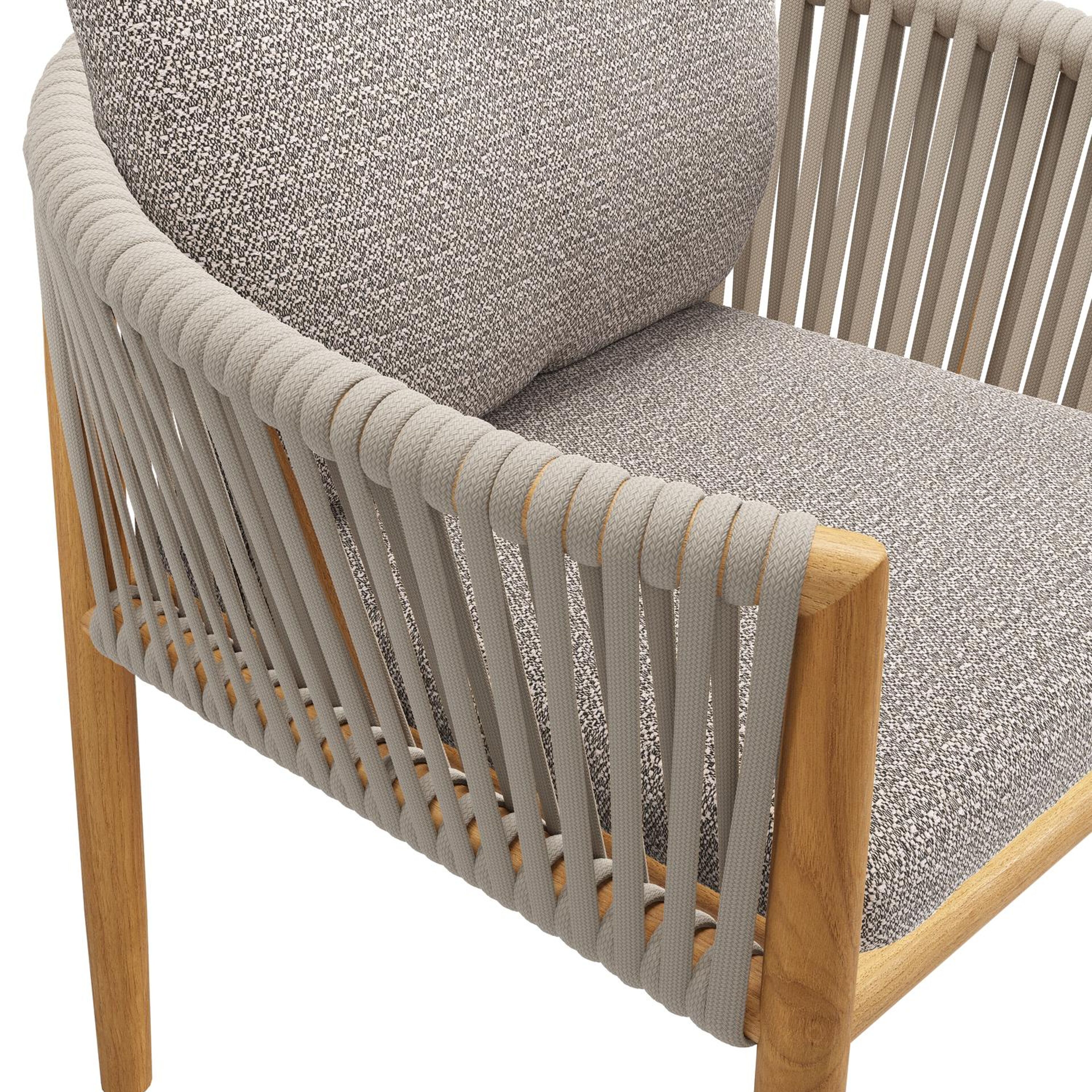 Organo tuinstoel in teak en beige verticaal geweven luxe vlakke rope met zitkussen in All Weather Sunbrella® Luxe Wander Granite | Exterioo tuinmeubelen