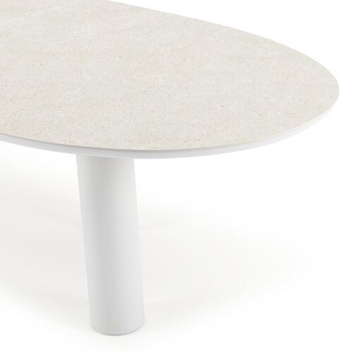 De Organo tuintafel onderscheidt zich door zijn uniek ontwerp, met een organisch gevormd tafelblad dat een eigentijdse uitstraling heeft. De tafel rust op een robuuste, dikke ronde poot en twee fijne ronde poten. Samen creëren ze een meesterlijke balans tussen luxe en moderniteit, waardoor deze tafel het pronkstuk van je buitenruimte wordt.
