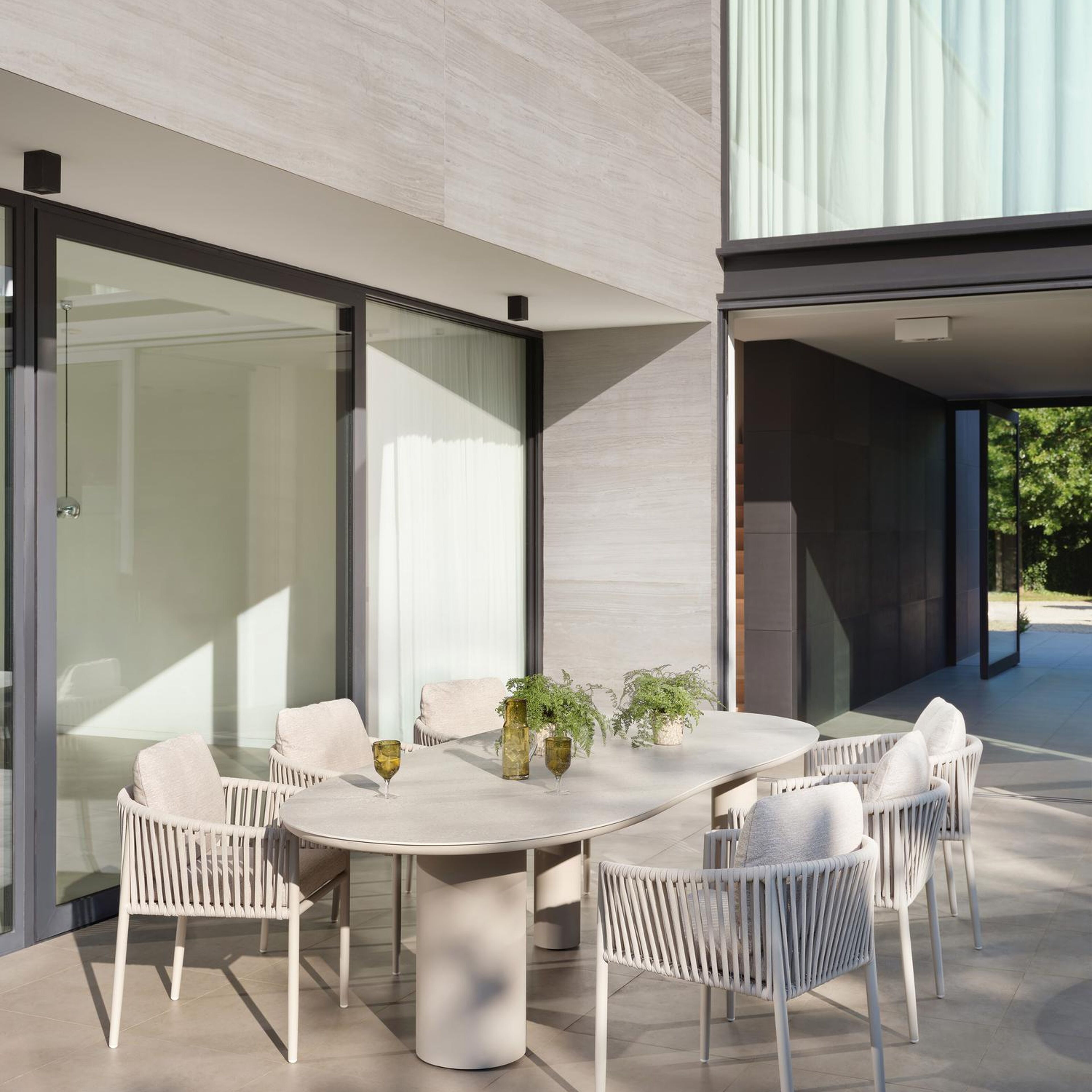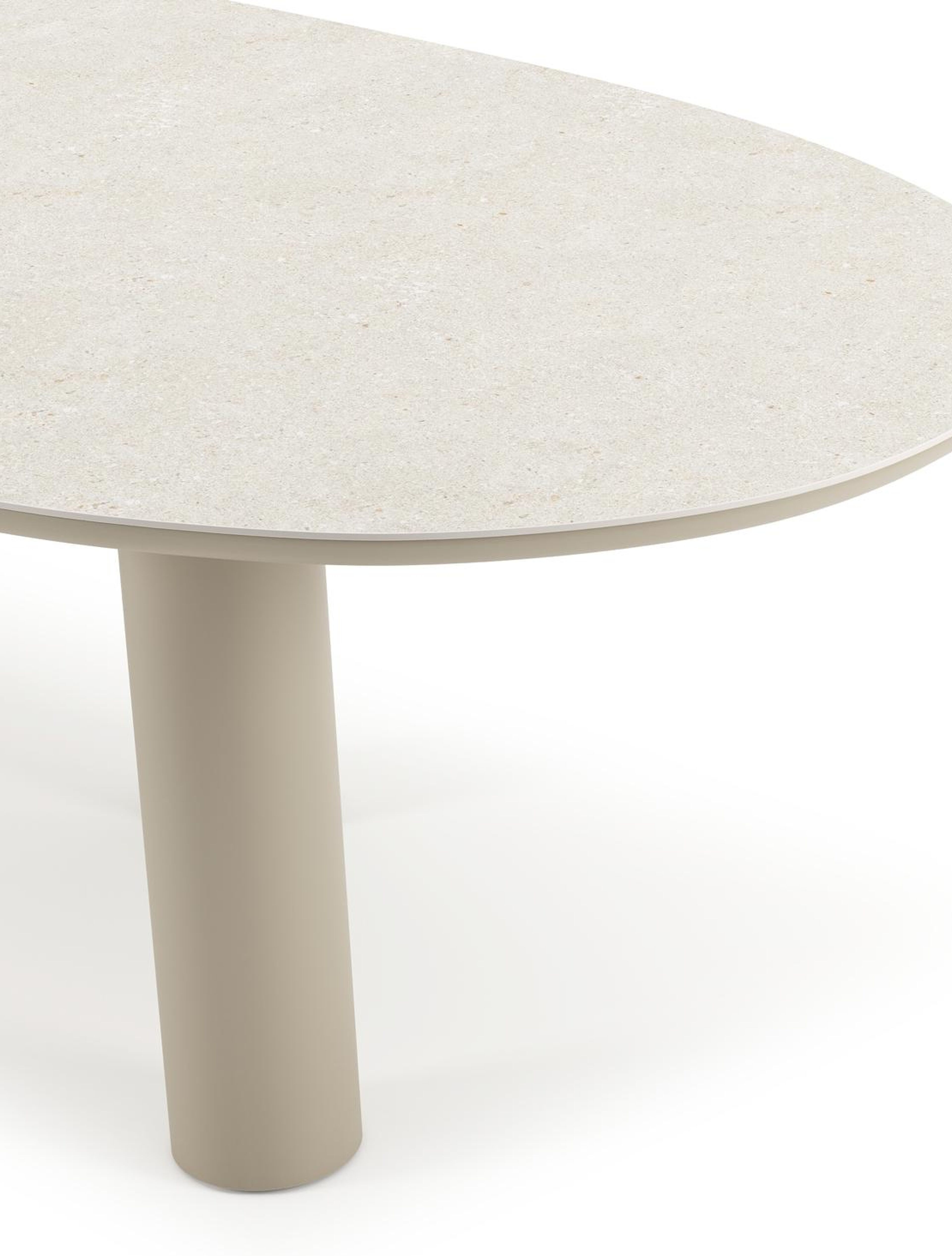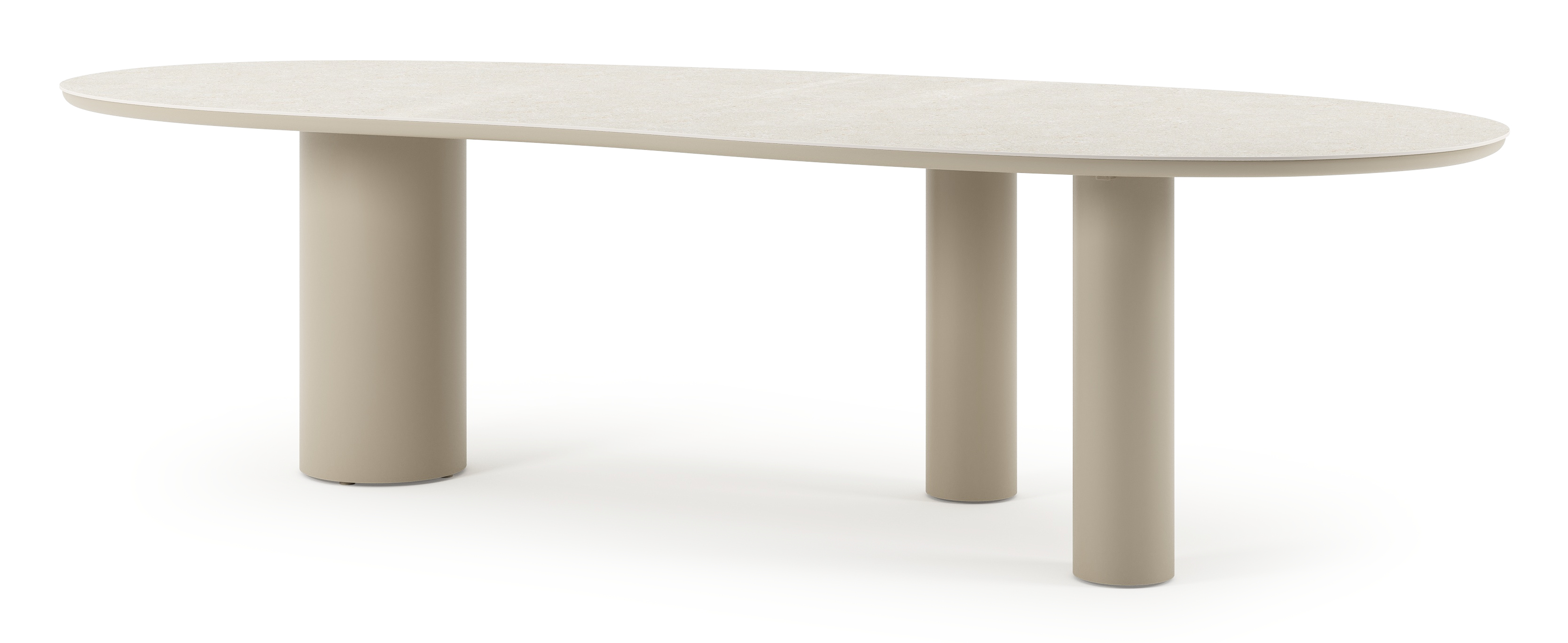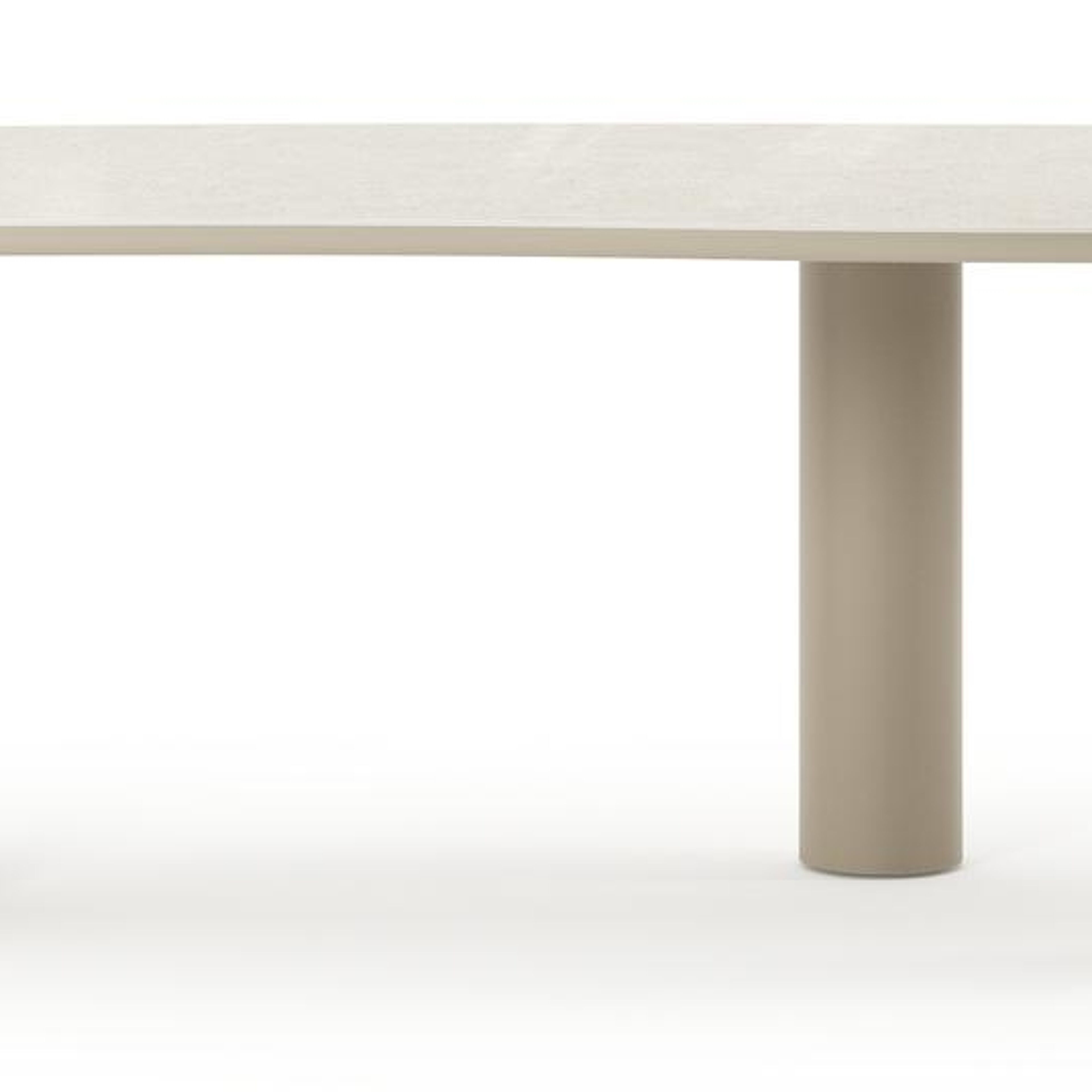 De Organo tuintafel onderscheidt zich door zijn uniek ontwerp, met een organisch gevormd tafelblad dat een eigentijdse uitstraling heeft. De tafel rust op een robuuste, dikke ronde poot en twee fijne ronde poten. Samen creëren ze een meesterlijke balans tussen luxe en moderniteit, waardoor deze tafel het pronkstuk van je buitenruimte wordt.
