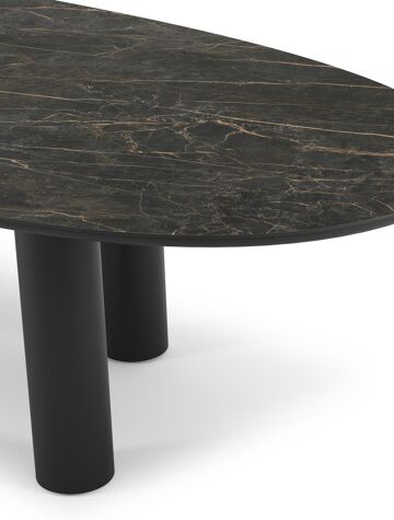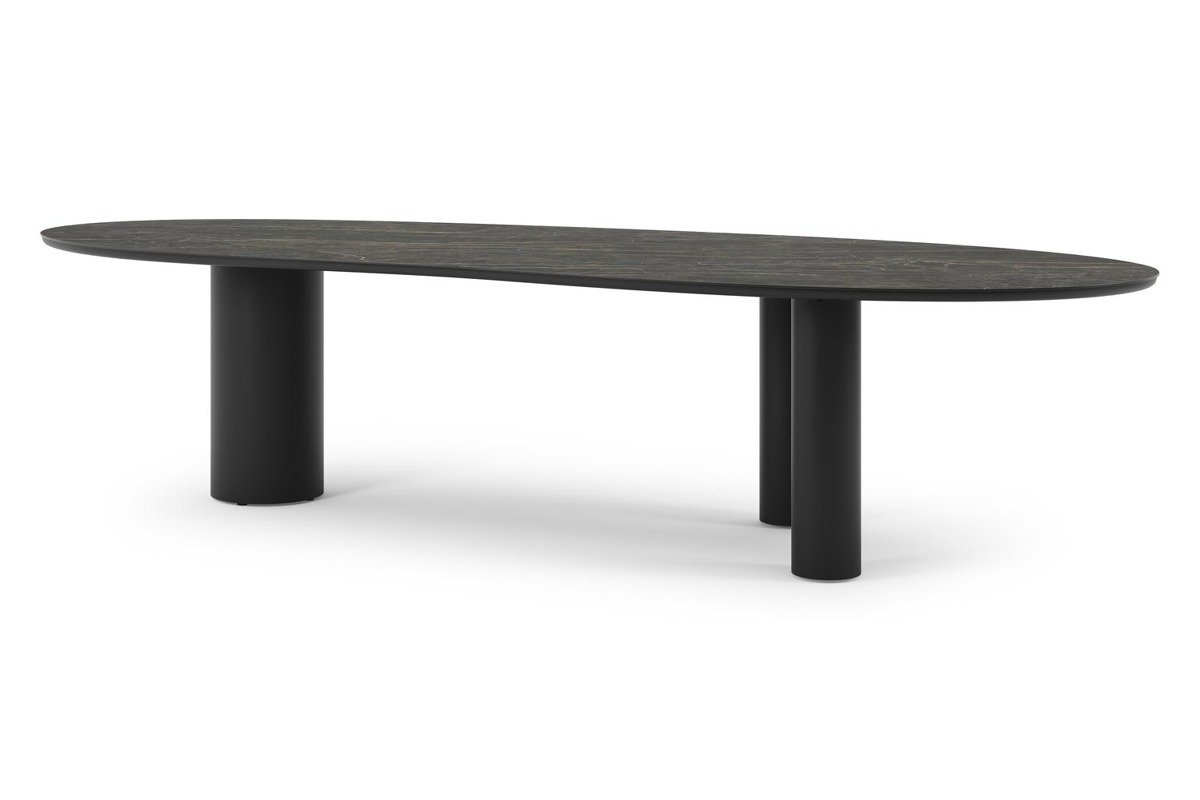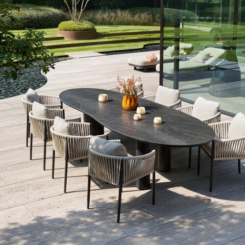 De Organo tuintafel onderscheidt zich door zijn uniek ontwerp, met een organisch gevormd tafelblad dat een eigentijdse uitstraling heeft. De tafel rust op een robuuste, dikke ronde poot en twee fijne ronde poten. Samen creëren ze een meesterlijke balans tussen luxe en moderniteit, waardoor deze tafel het pronkstuk van je buitenruimte wordt.