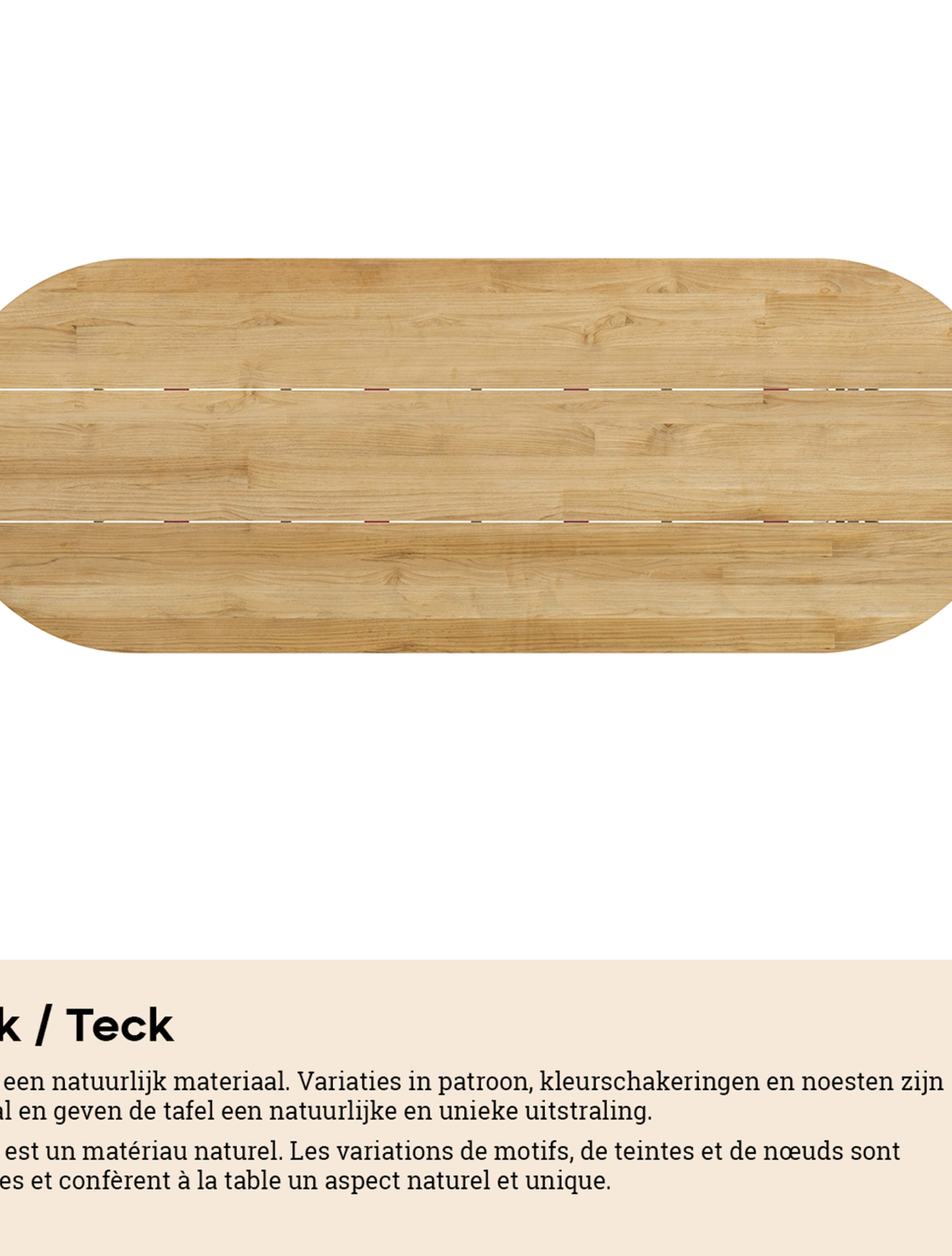 Een tafelblad uit teak staat gelijk aan bijzondere kwaliteit en natuurlijk design. Teak is een kwalitatieve houtsoort gekenmerkt door zijn hardheid. Aangezien hout leeft, kan de structuur of kleur licht anders zijn dan op het beeld weergegeven.