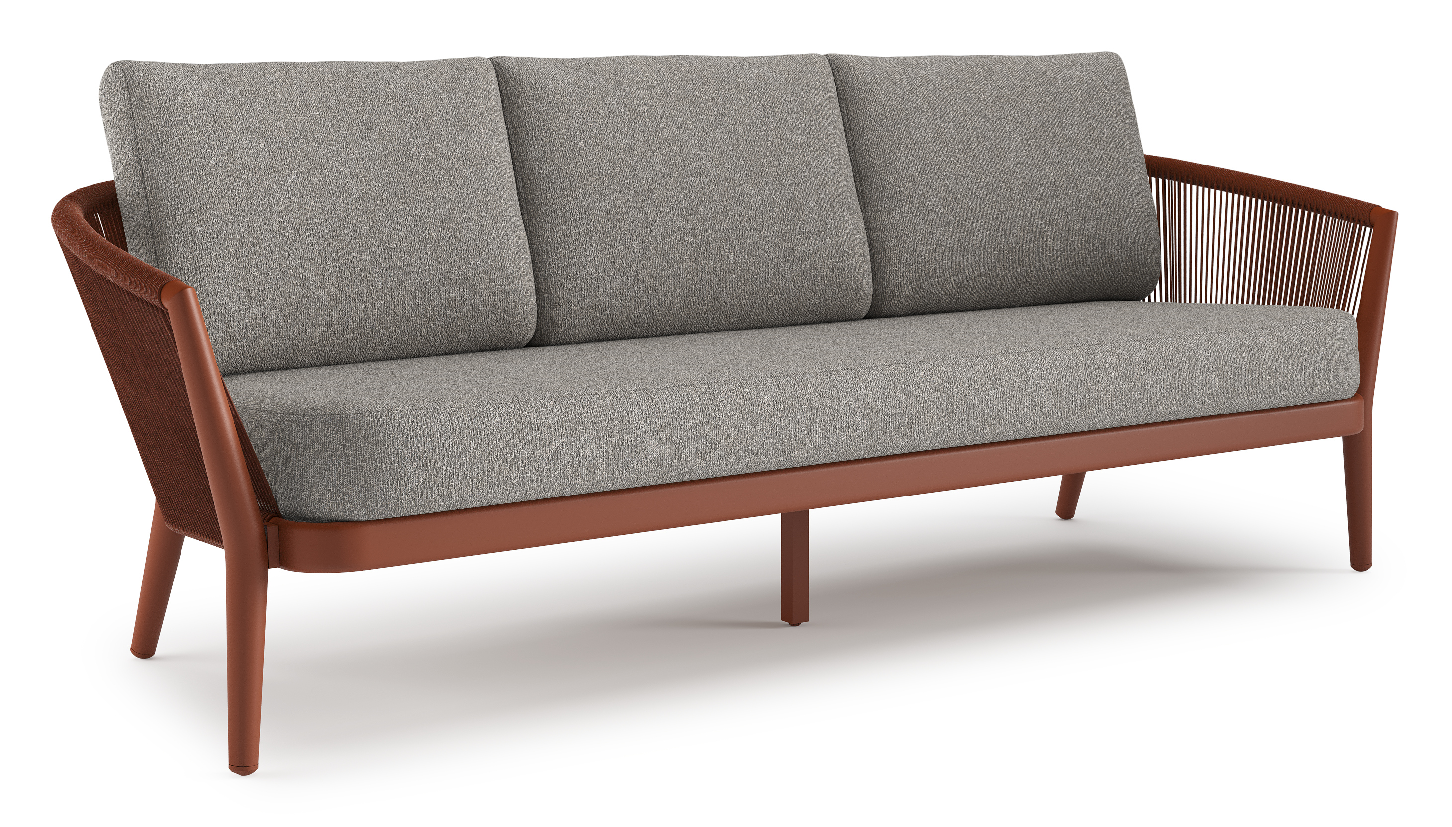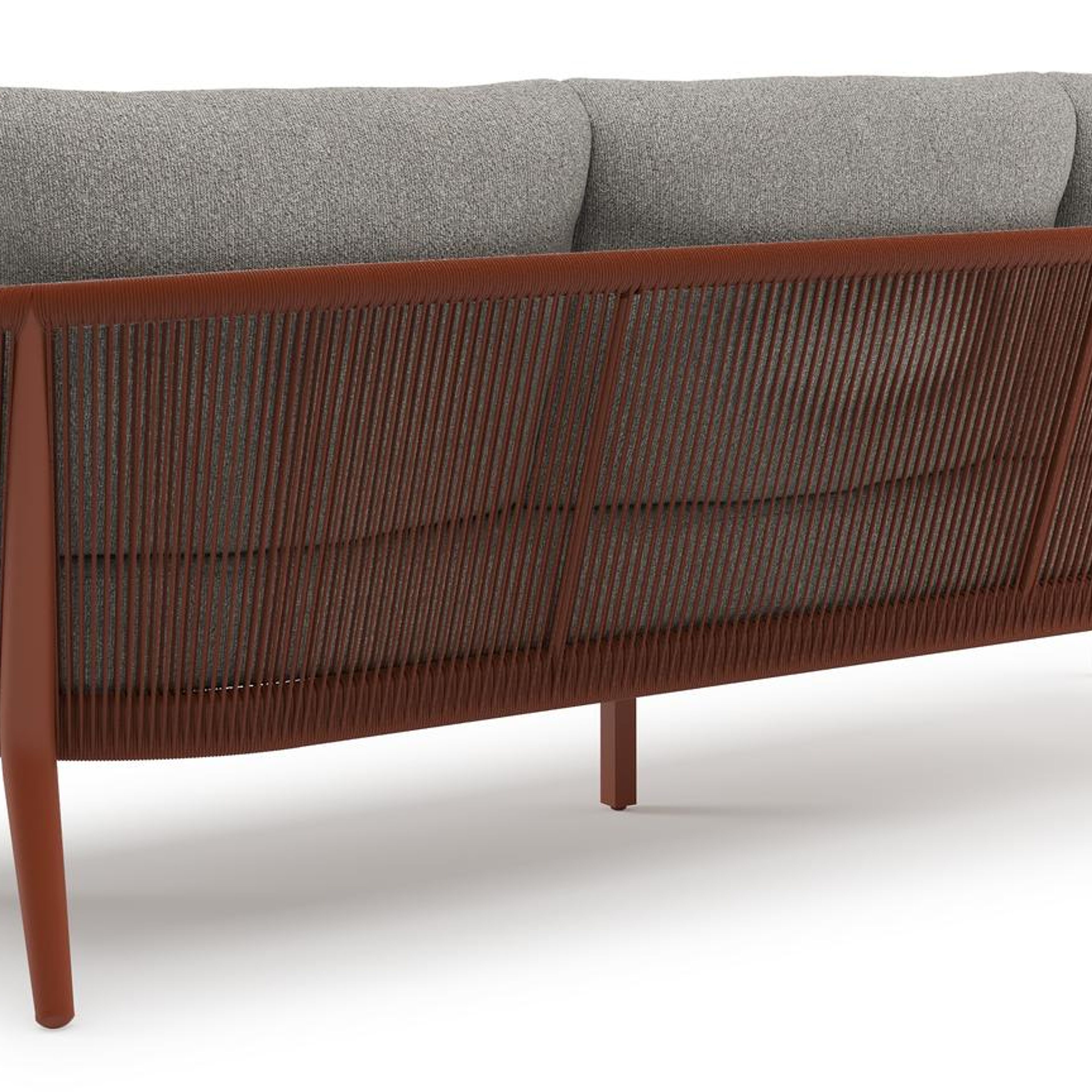 Orso loungebank in roestbruin aluminium en roestbruin verticaal geweven ronde rope met Tundra Charcoal all weather sunbrella® luxe kussen | Exterioo tuinmeubelen