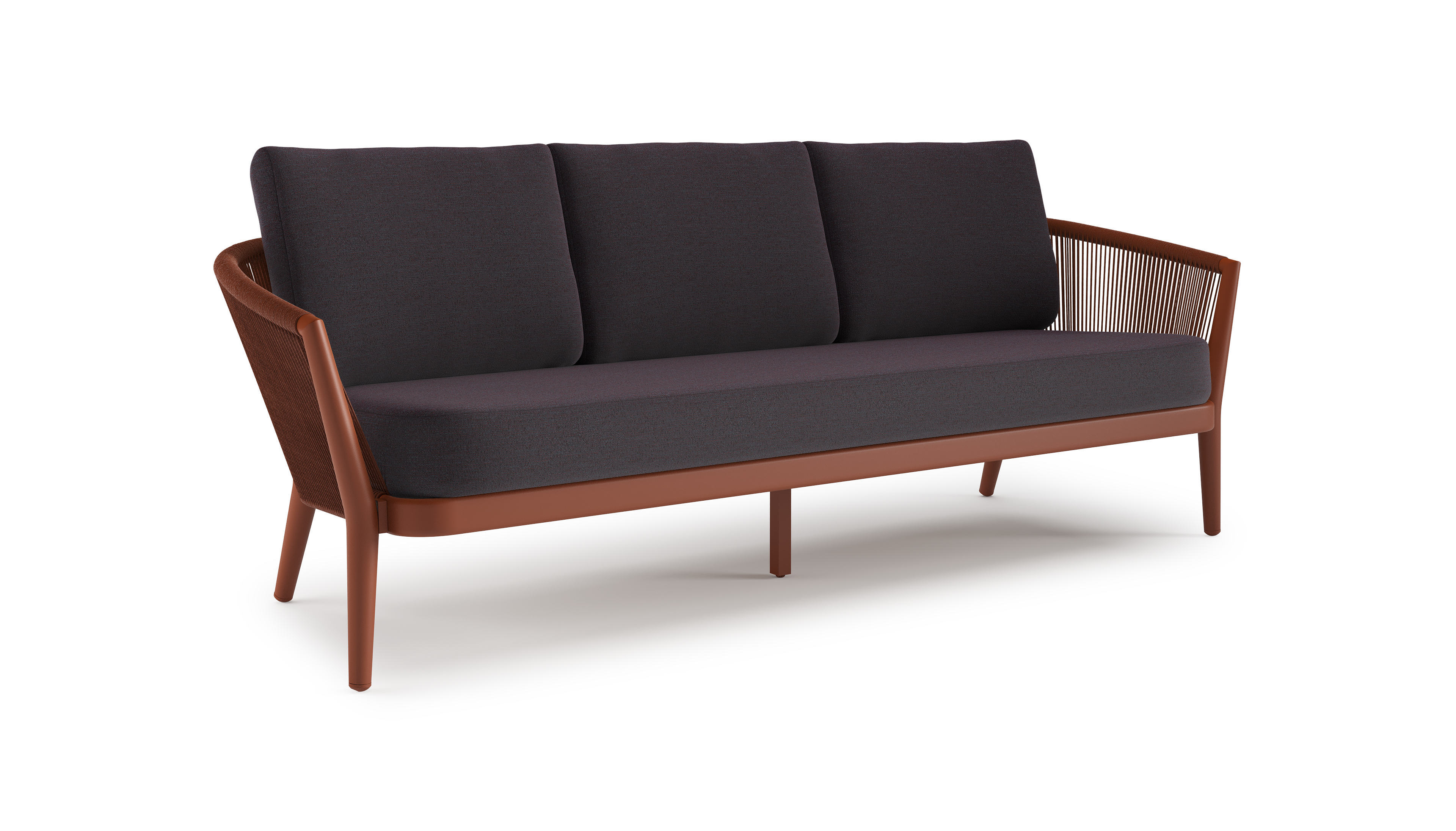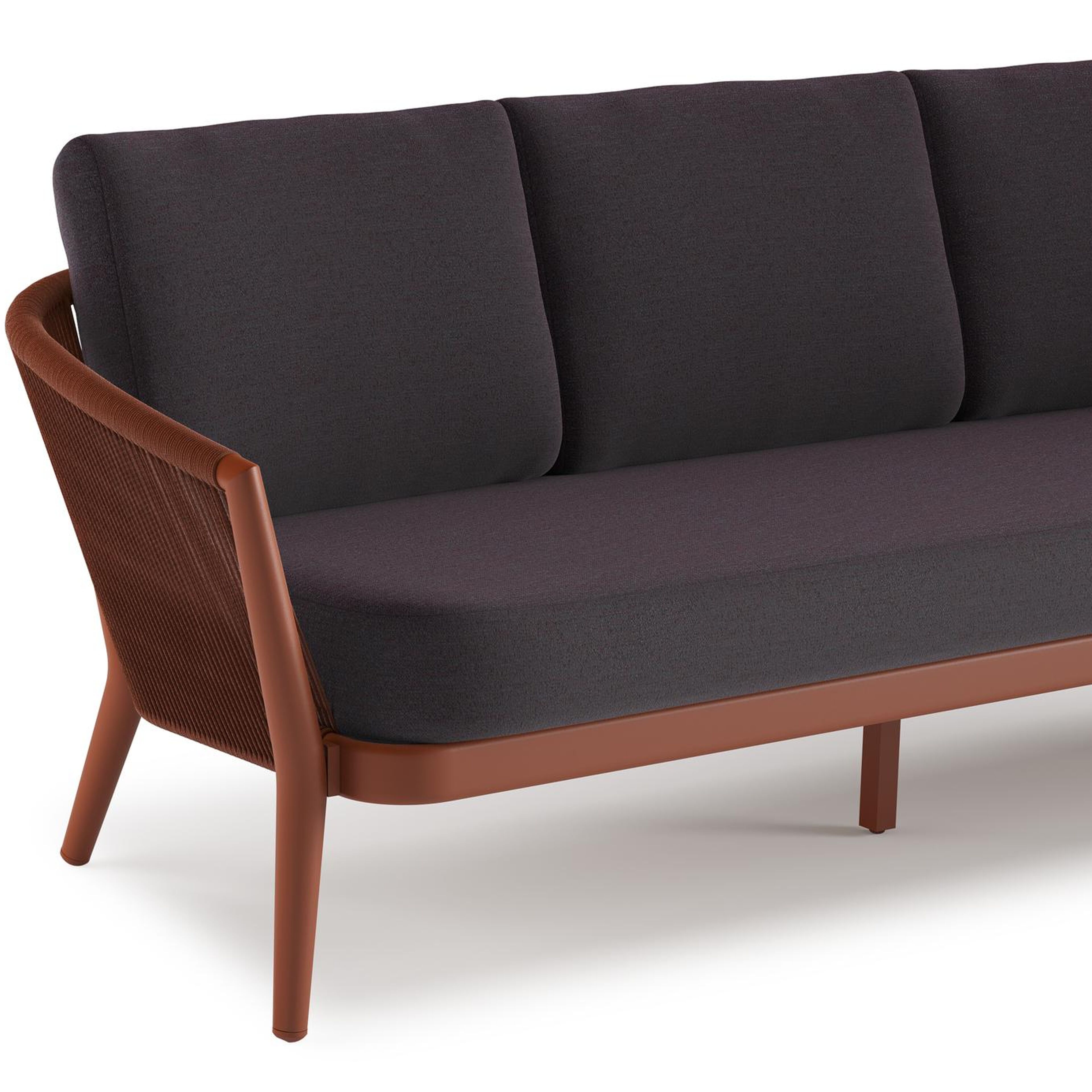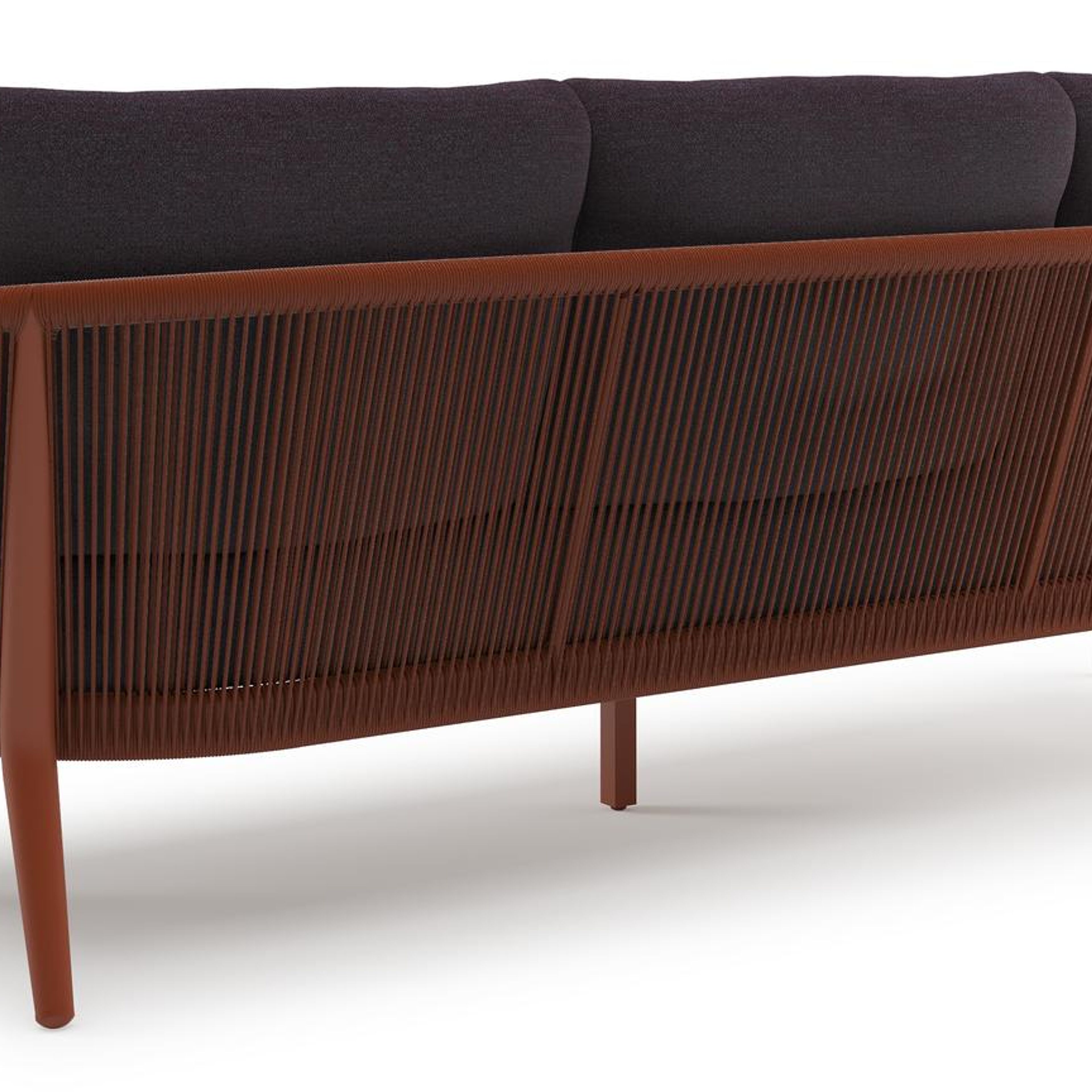 Orso loungebank in roestbruin aluminium en roestbruin verticaal geweven ronde rope met Tundra Red all weather sunbrella® luxe kussen | Exterioo tuinmeubelen
