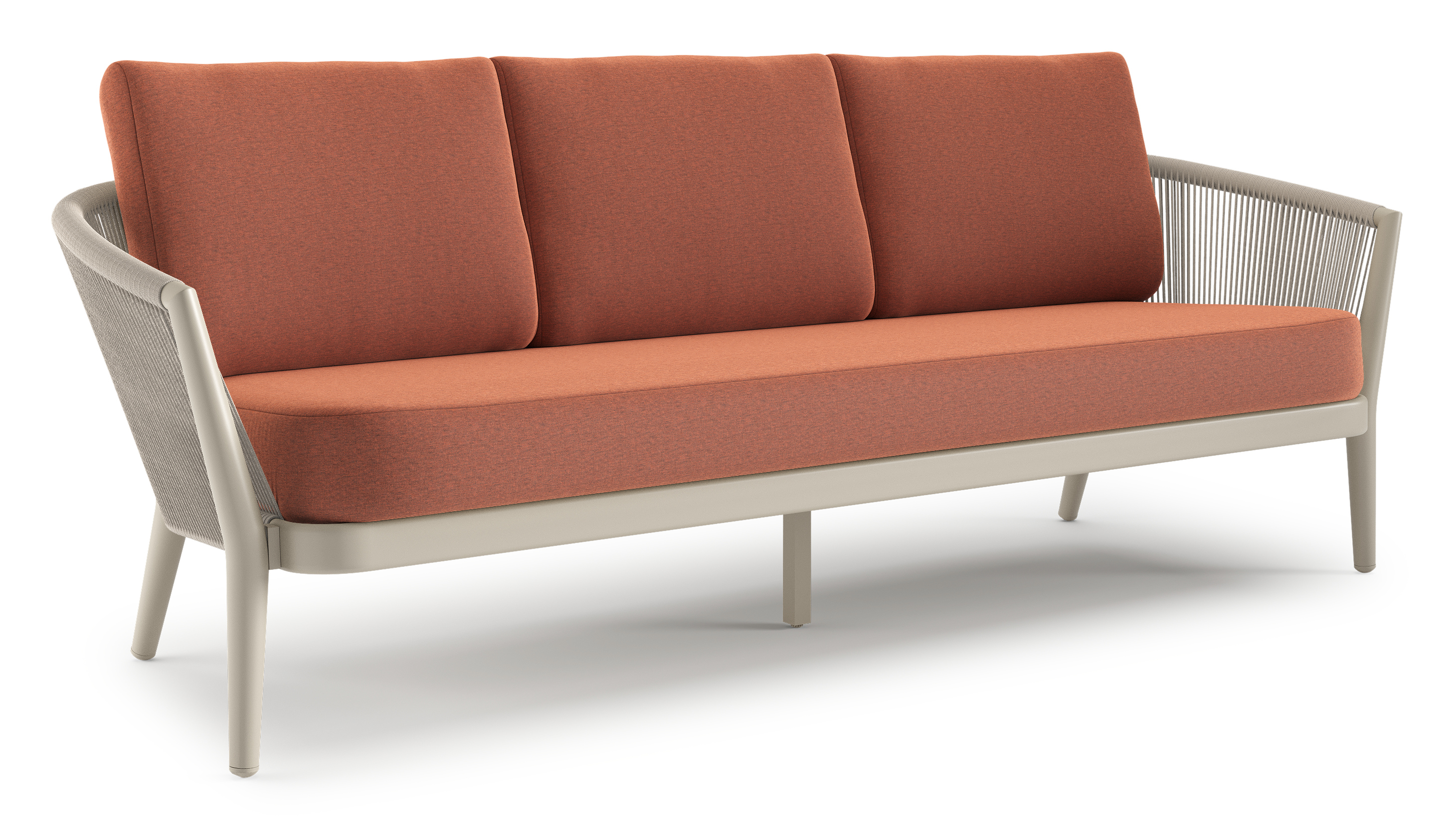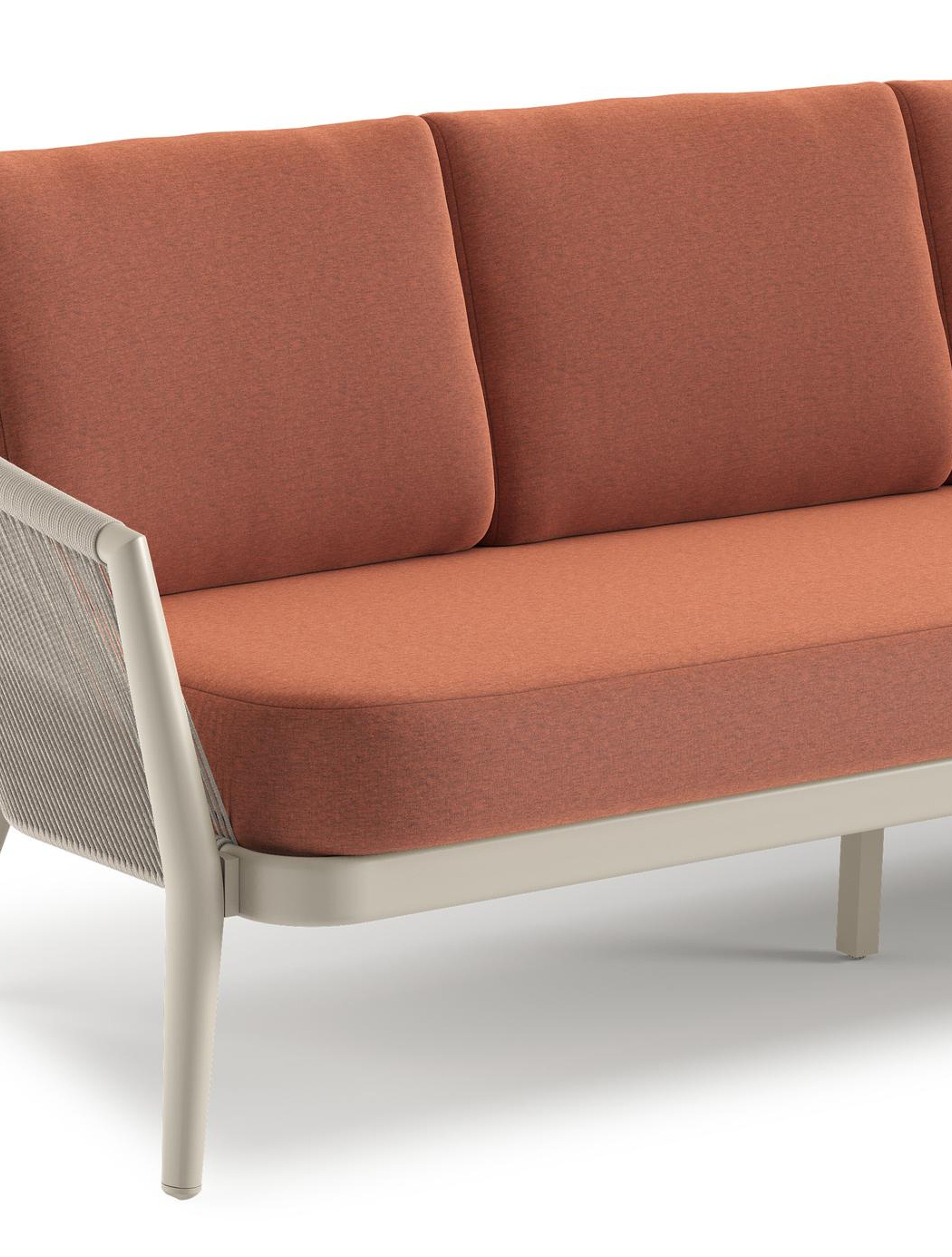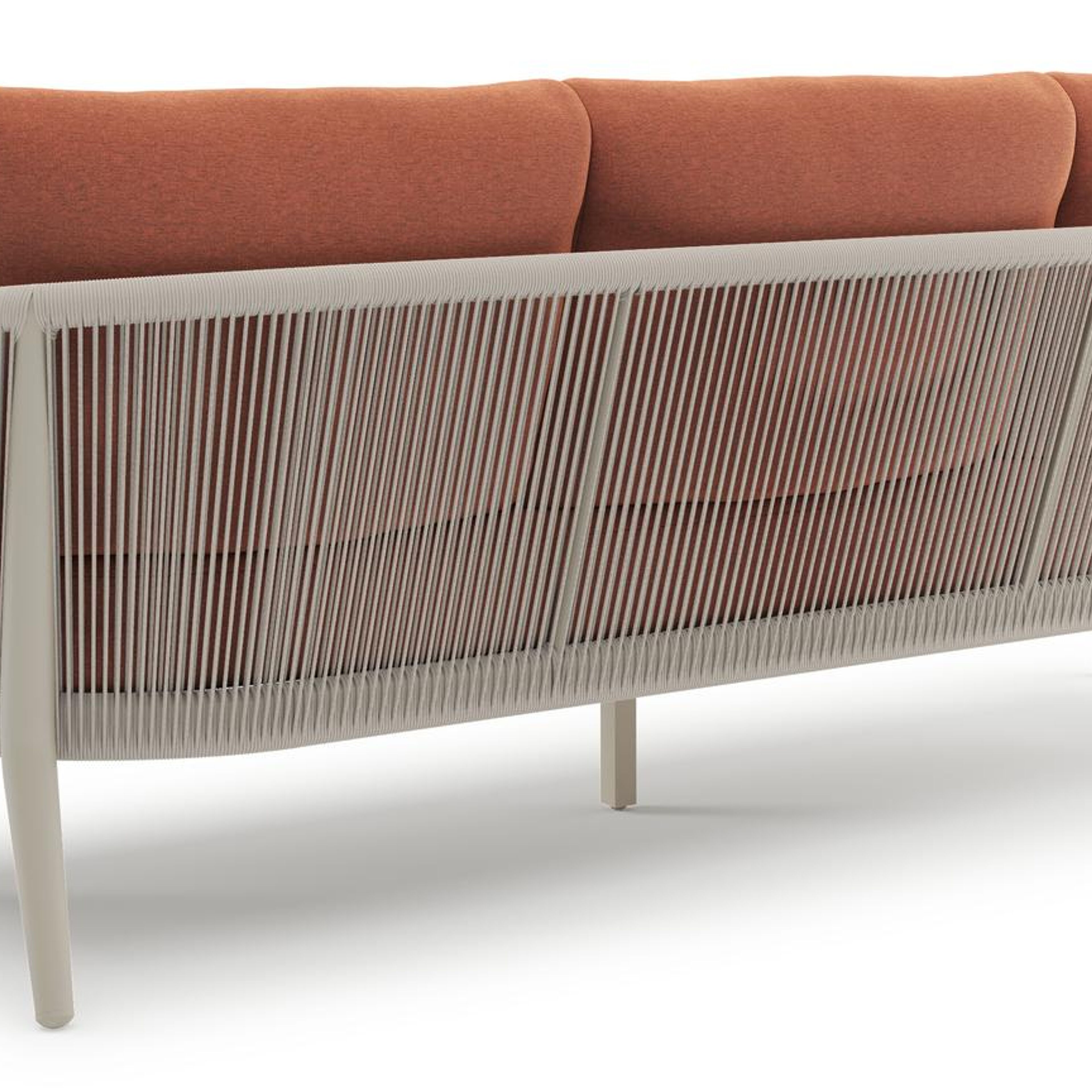 Orso loungebank in beige aluminium en beige verticaal geweven ronde rope met Heritage Rust all weather sunbrella® luxe kussen | Exterioo tuinmeubelen