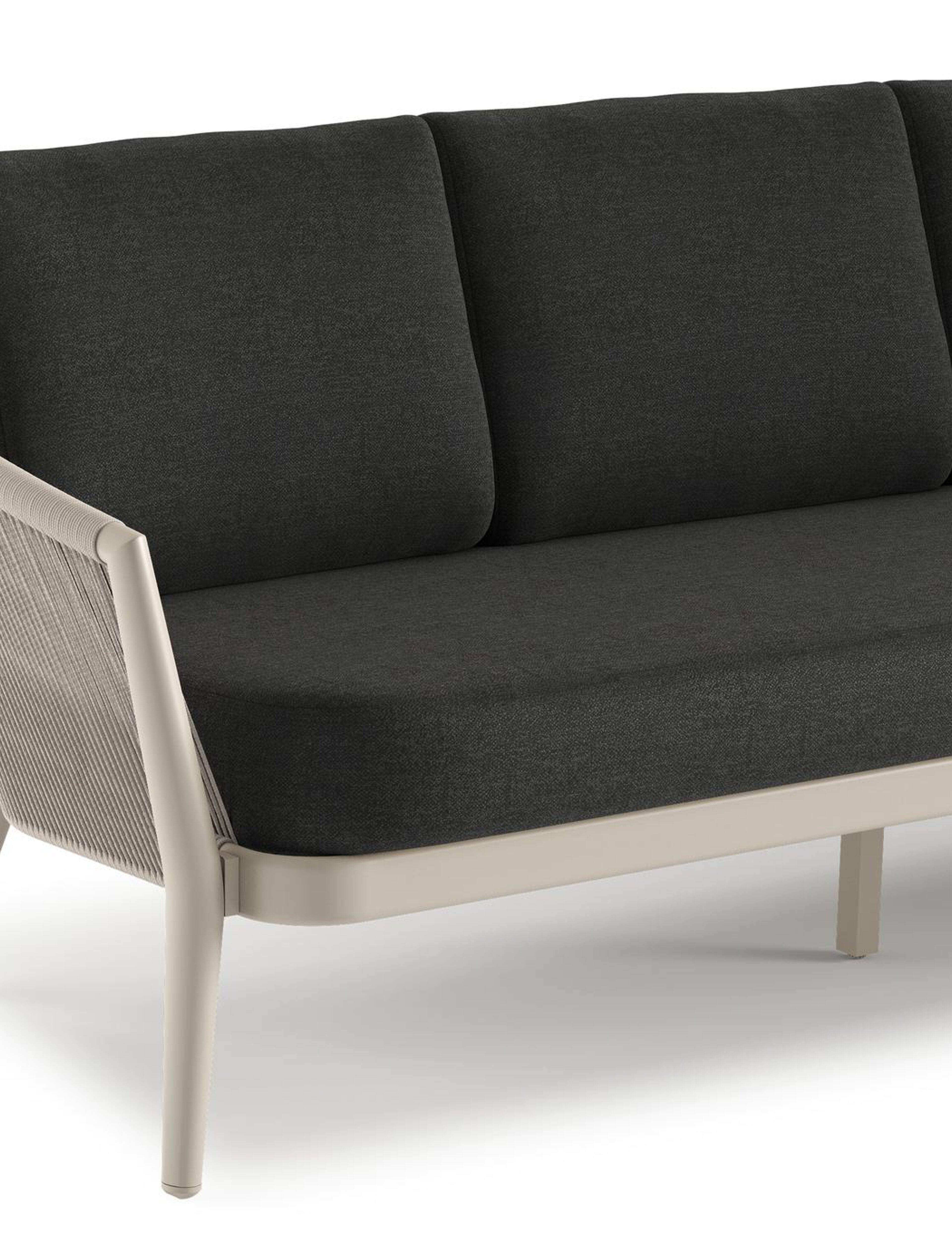 Orso loungebank in beige aluminium en beige verticaal geweven ronde rope met Chartres Sooty all weather sunbrella® luxe kussen | Exterioo tuinmeubelen