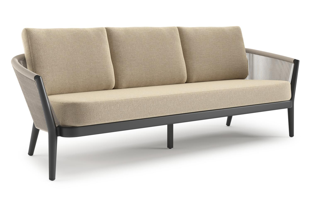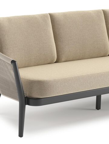 Orso loungebank in zwart aluminium en beige verticaal geweven ronde rope met Althea Camel all weather cosytica kussen | Exterioo