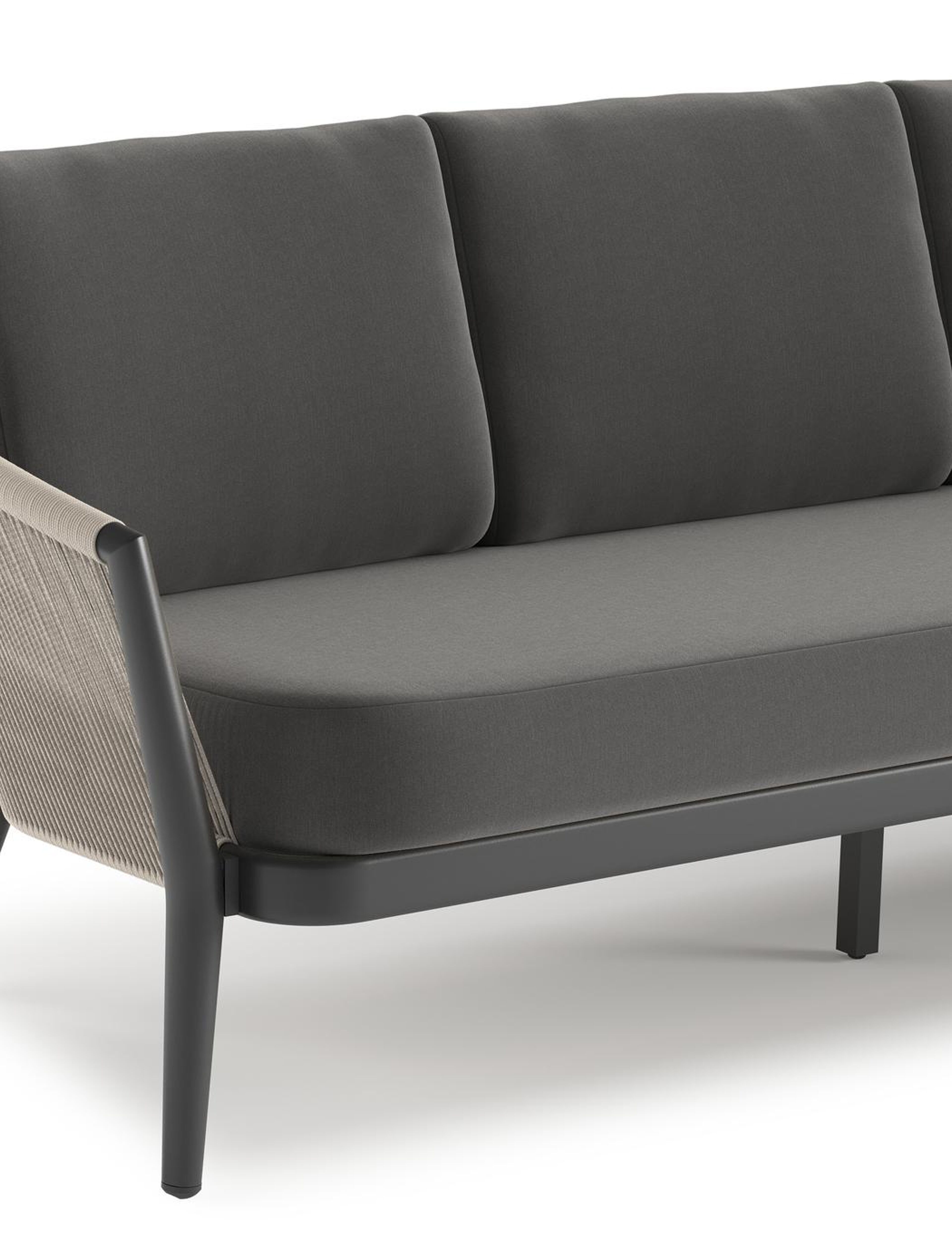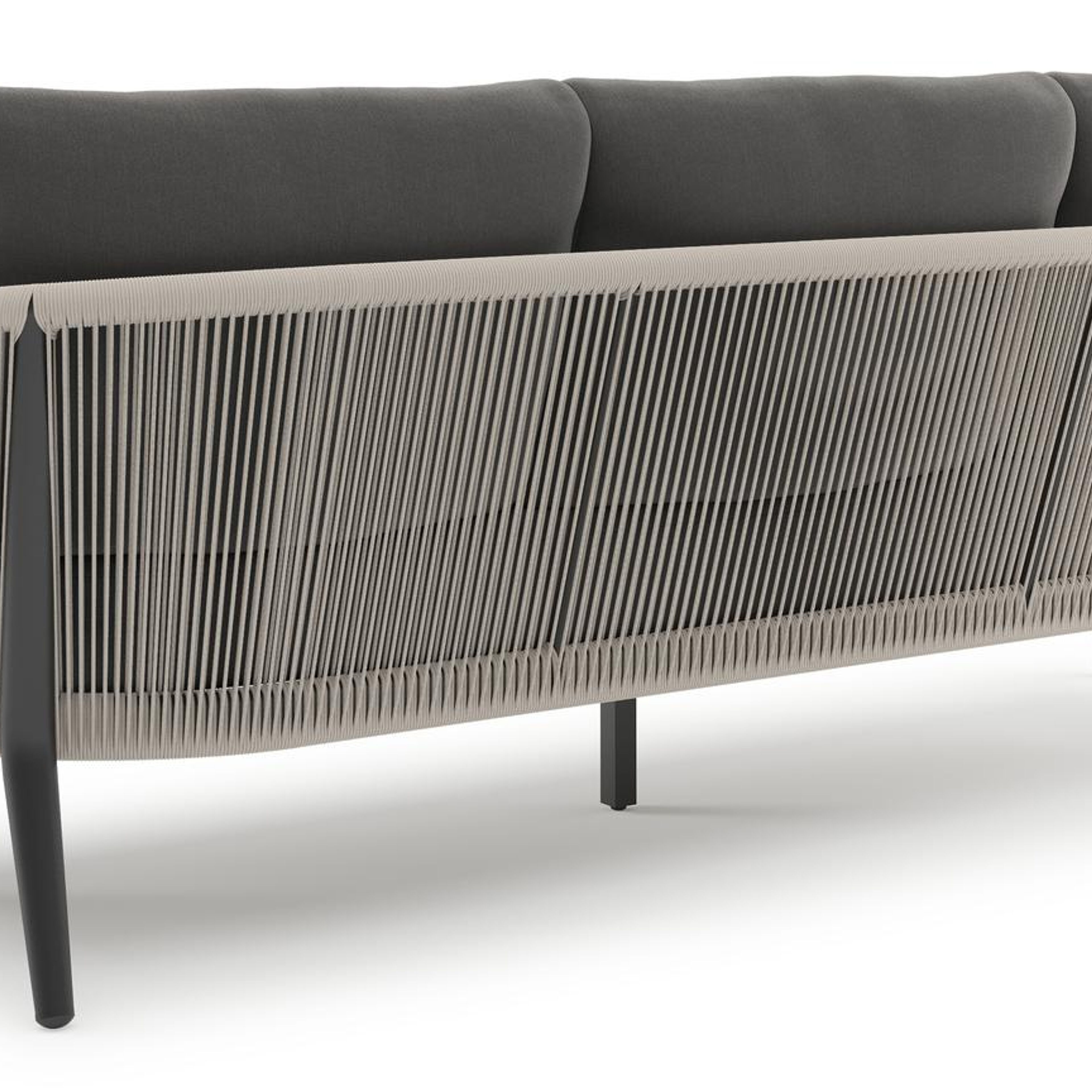Orso loungebank in zwart aluminium en beige verticaal geweven ronde rope met Natte Charcoal Chine all weather sunbrella® luxe kussen | Exterioo tuinmeubelen