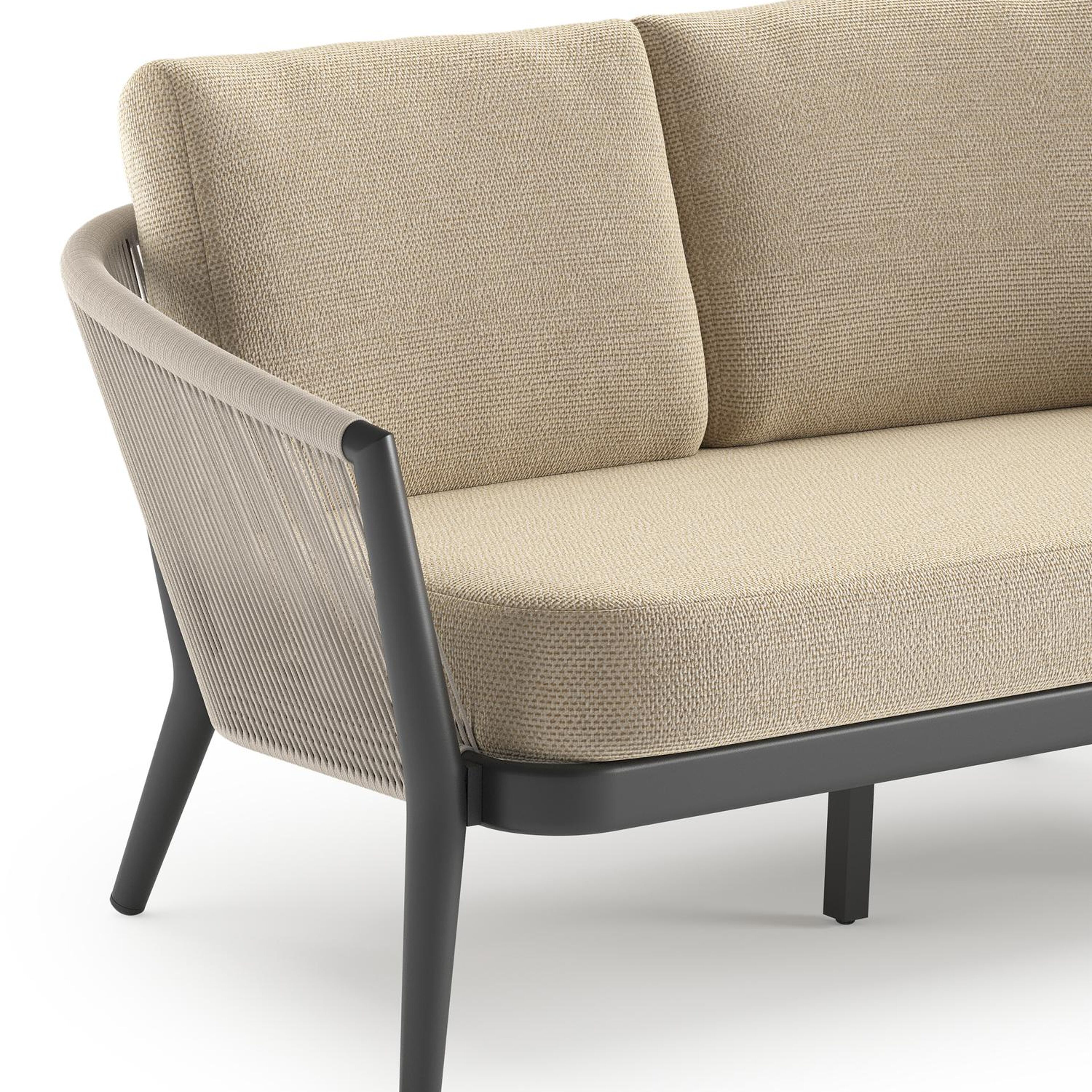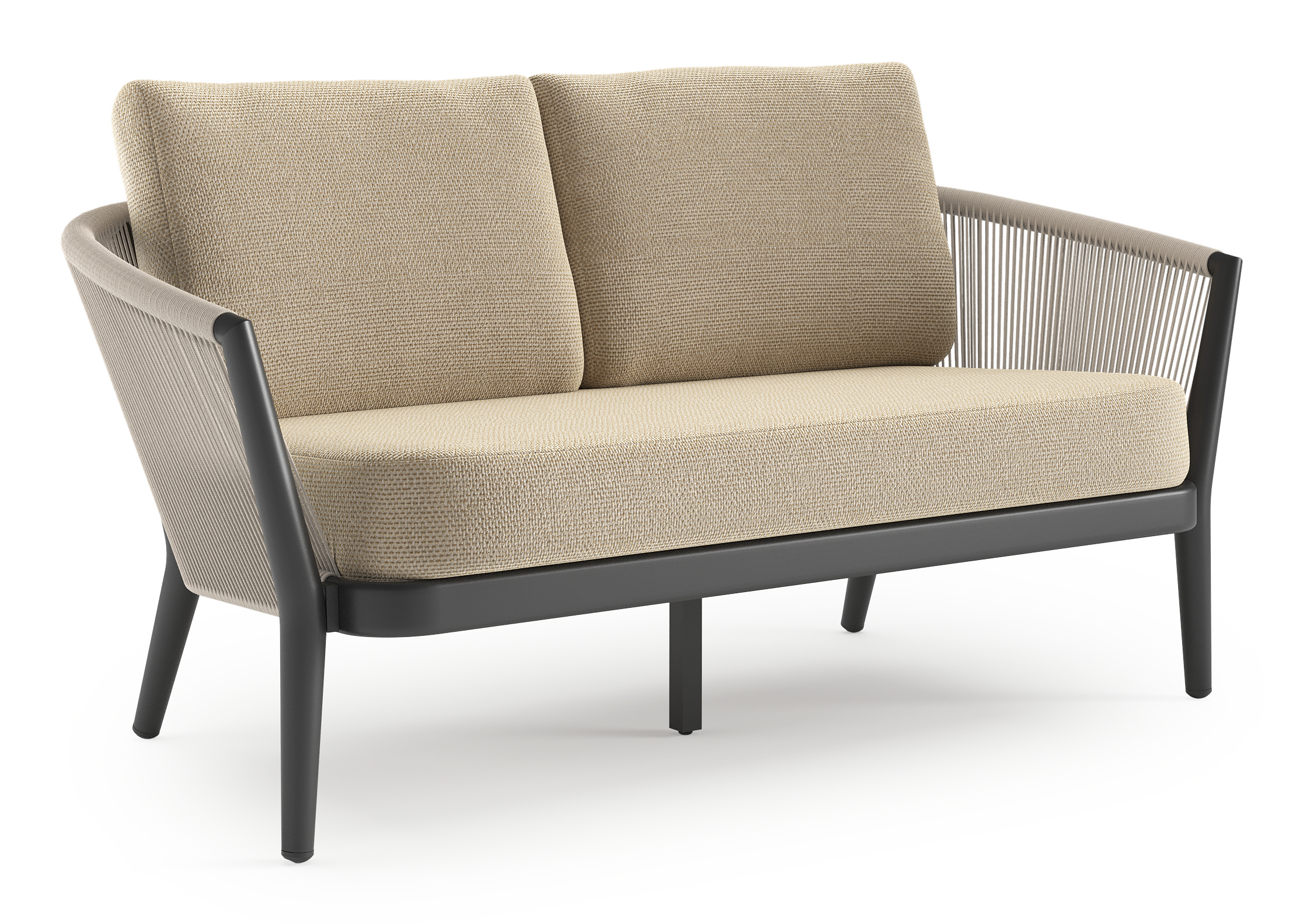 Orso loungebank in zwart aluminium en beige verticaal geweven ronde rope met Althea Camel all weather cosytica kussen | Exterioo tuinmeubelen