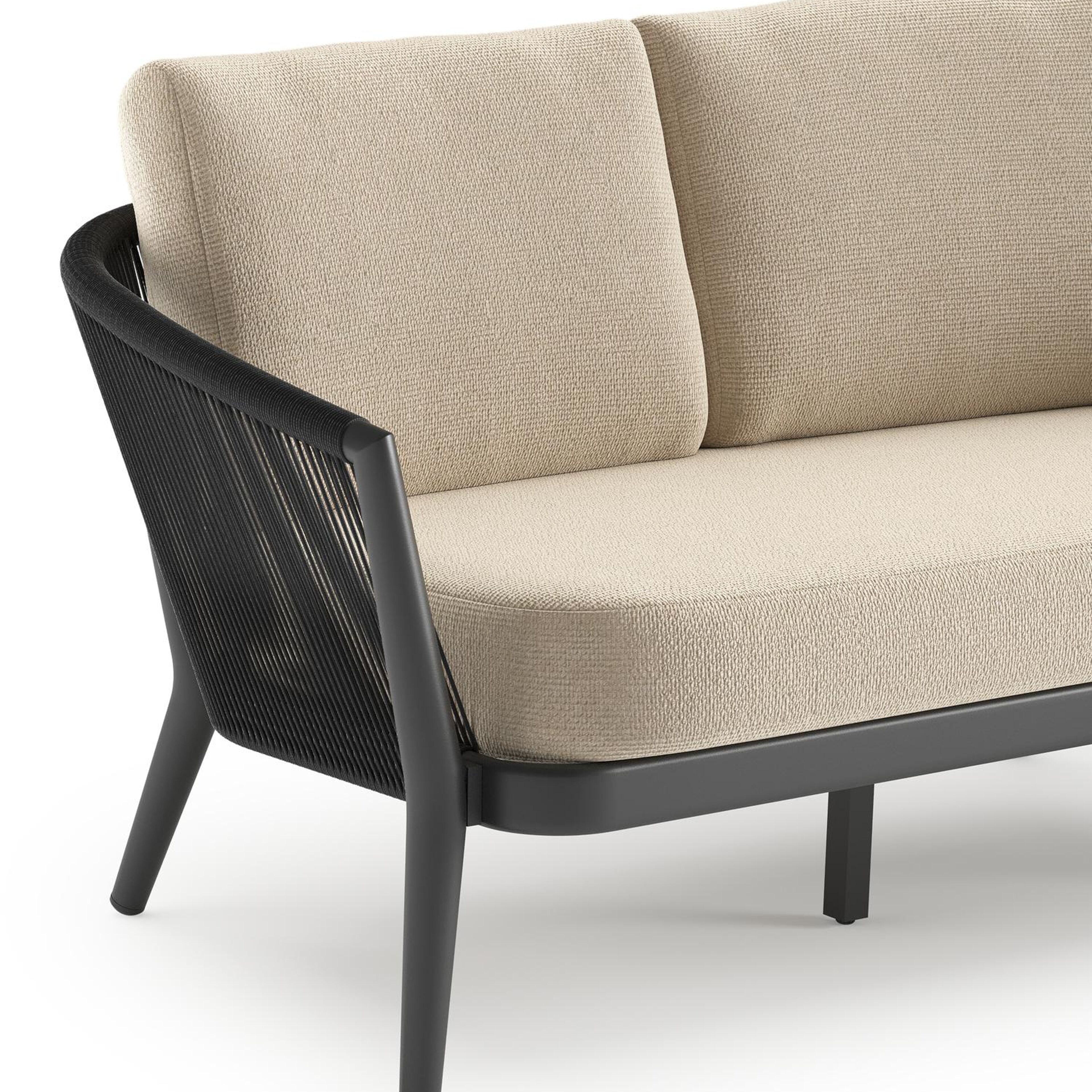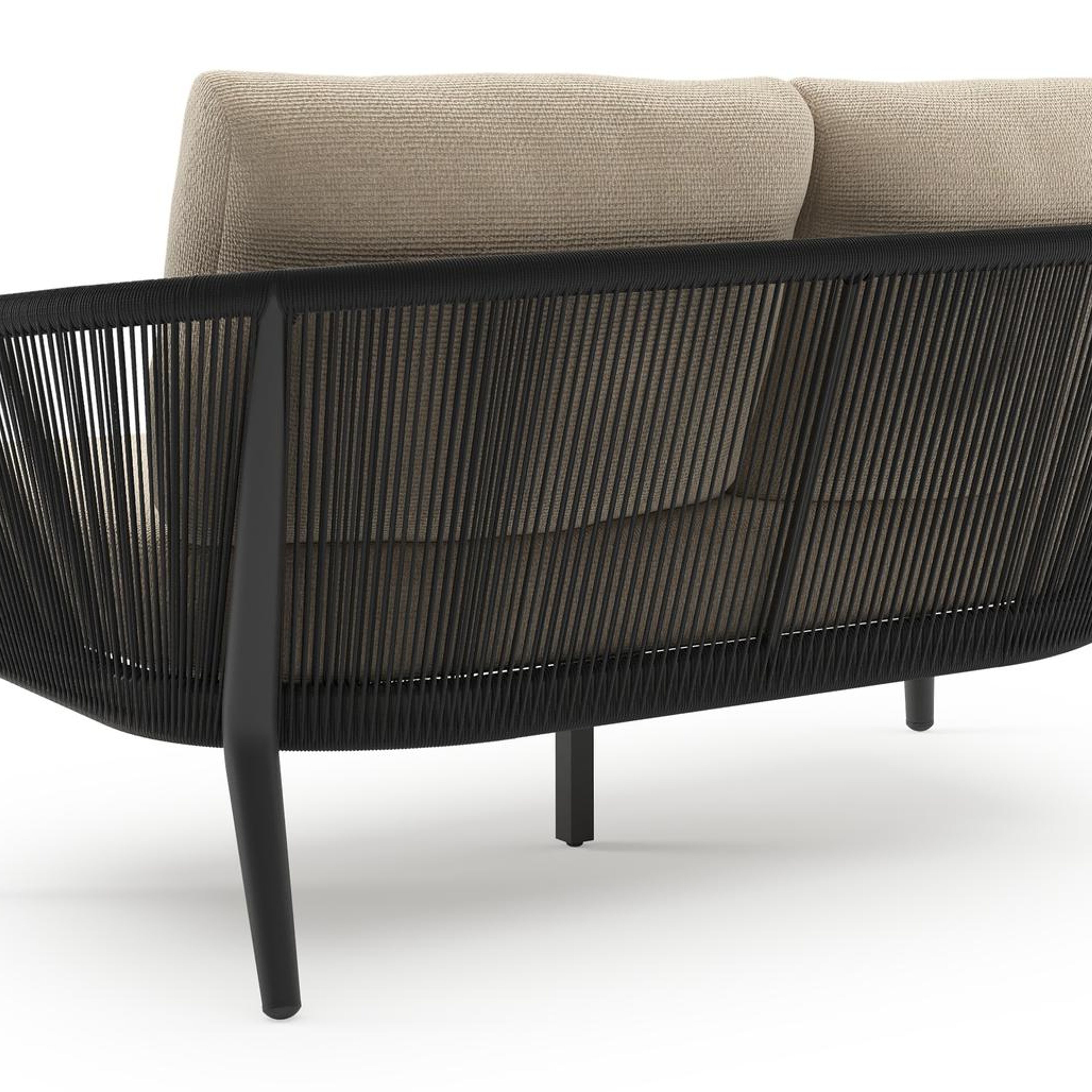 Orso loungebank in zwart aluminium en zwart verticaal geweven ronde rope met Althea Chalk all weather cosytica kussen | Exterioo tuinmeubelen