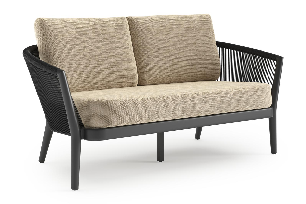 Orso loungebank in zwart aluminium en zwart verticaal geweven ronde rope met Althea Camel all weather cosytica kussen | Exterioo