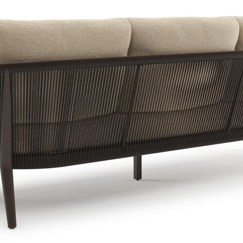 Orso loungeset in donkerbruin aluminium en donkerbruin verticaal geweven ronde rope met Althea Camel all weather cosytica kussen | Exterioo