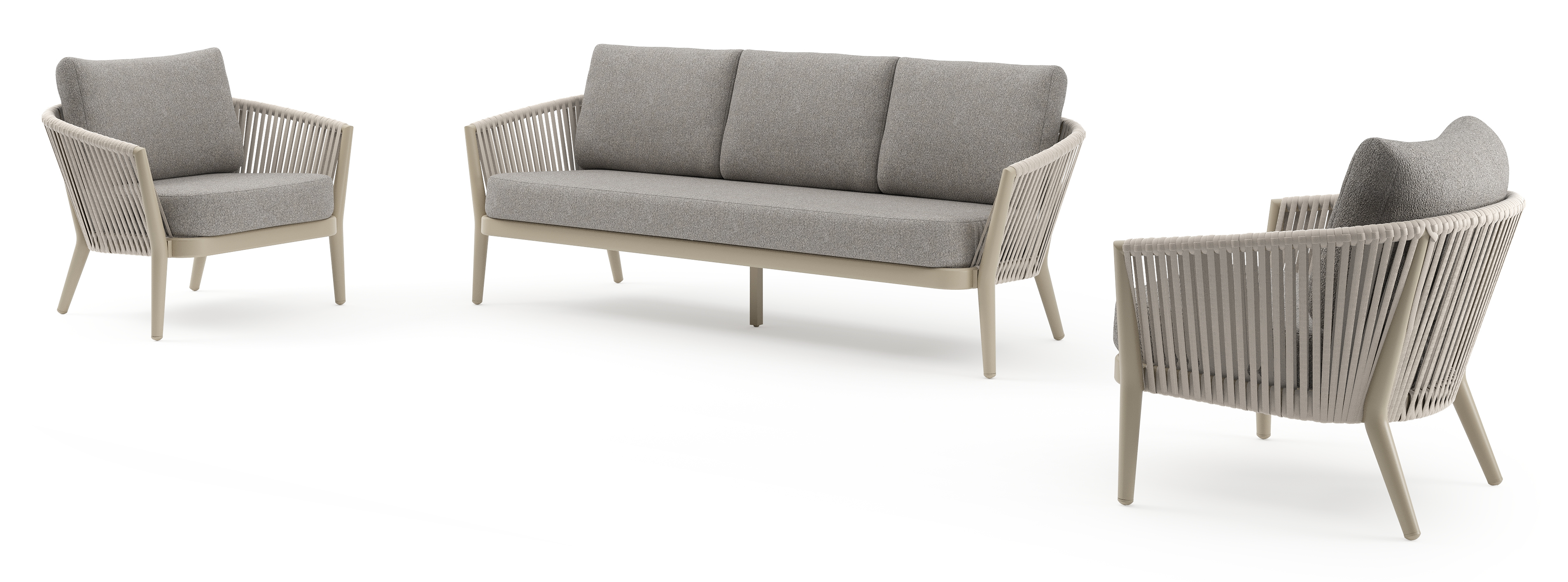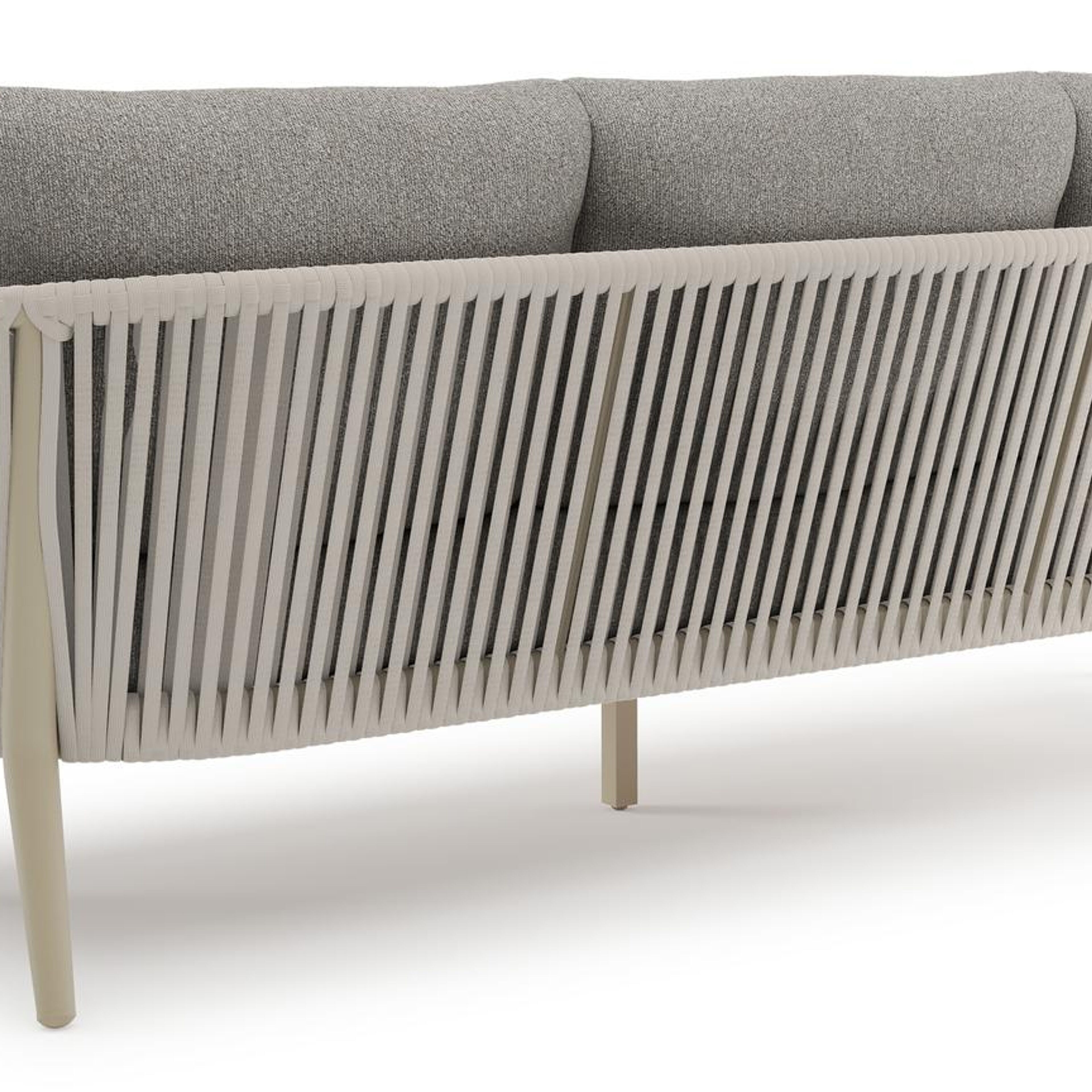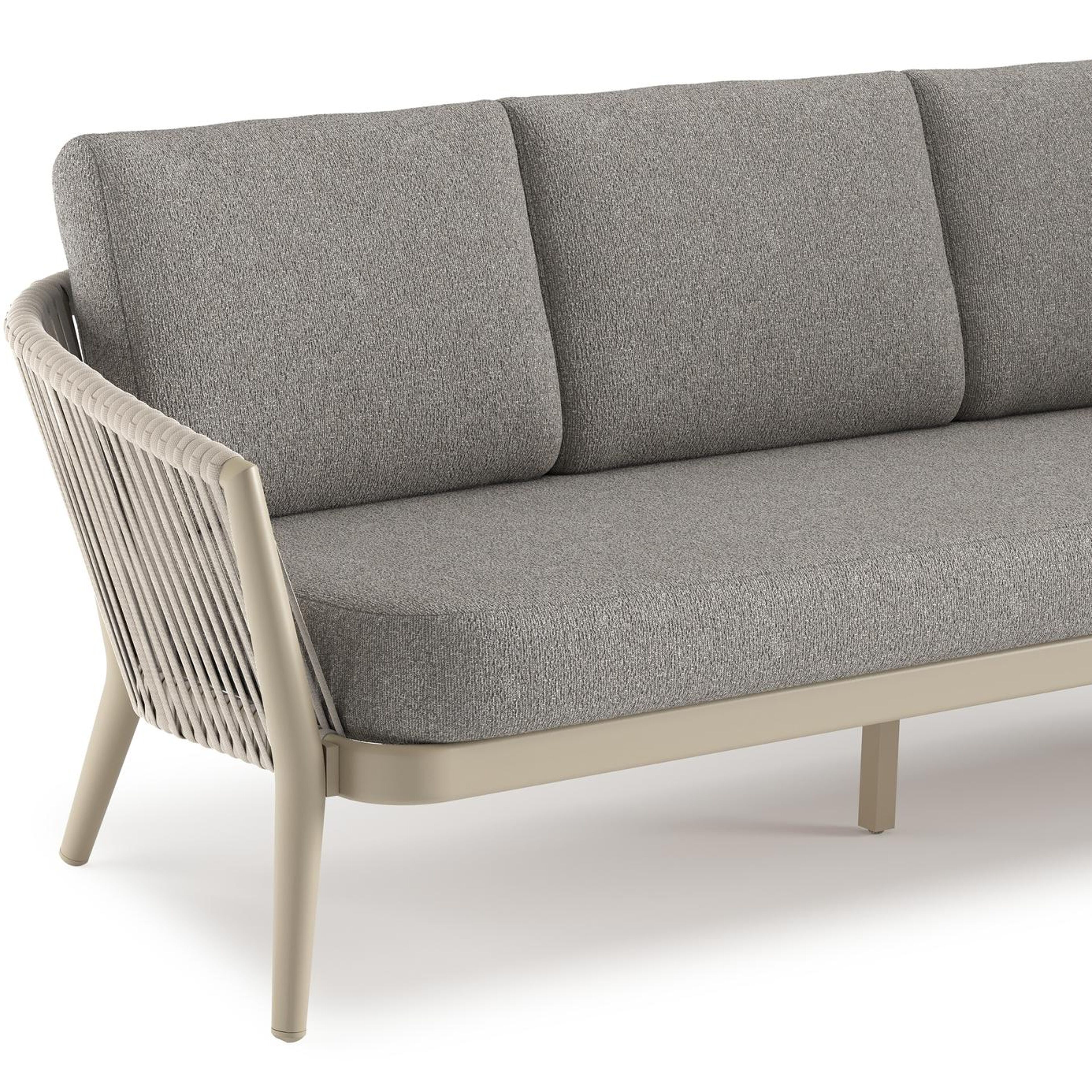 Orso loungeset in beige aluminium en beige verticaal geweven ronde rope met Tundra Charcoal all weather sunbrella® luxe kussen | Exterioo tuinmeubelen