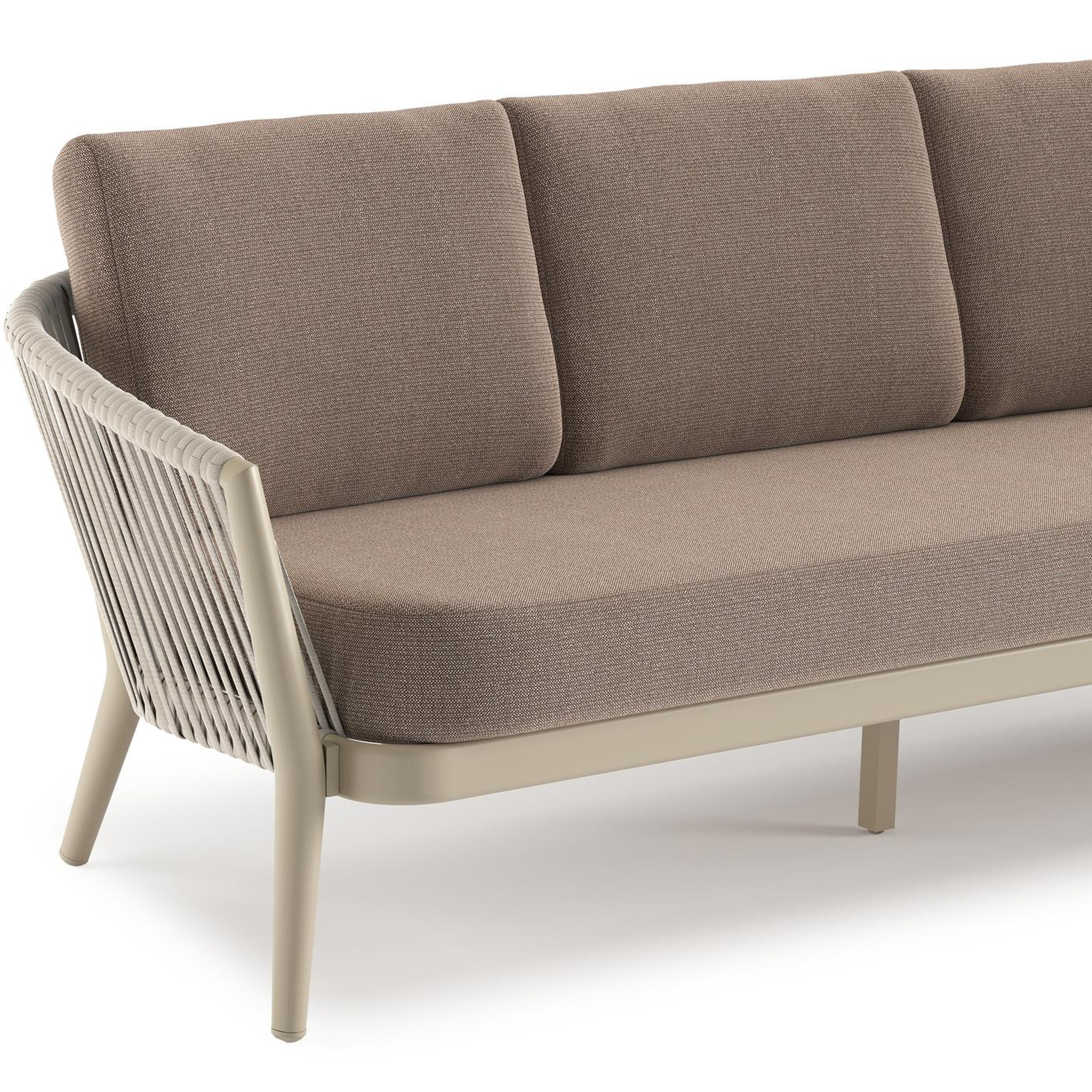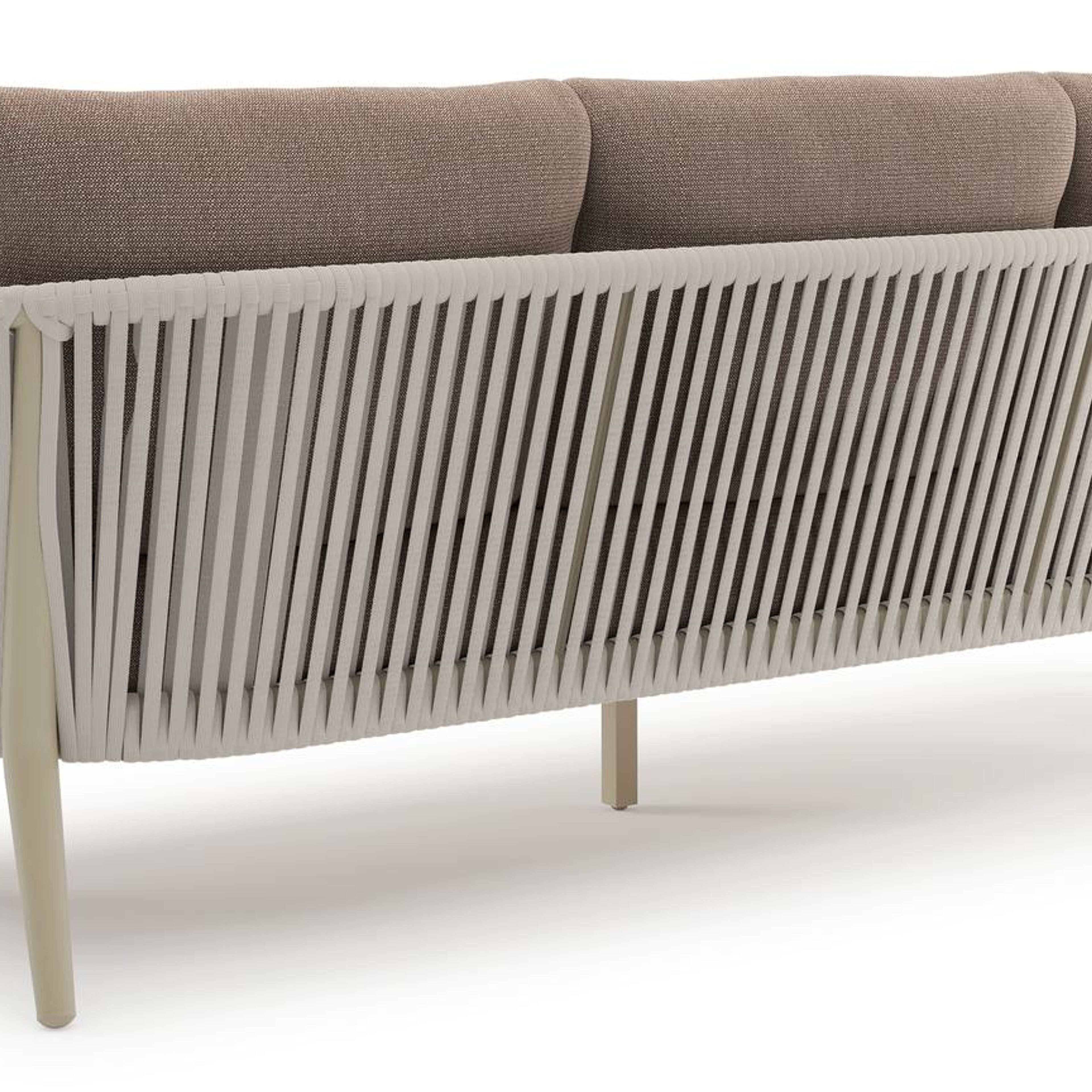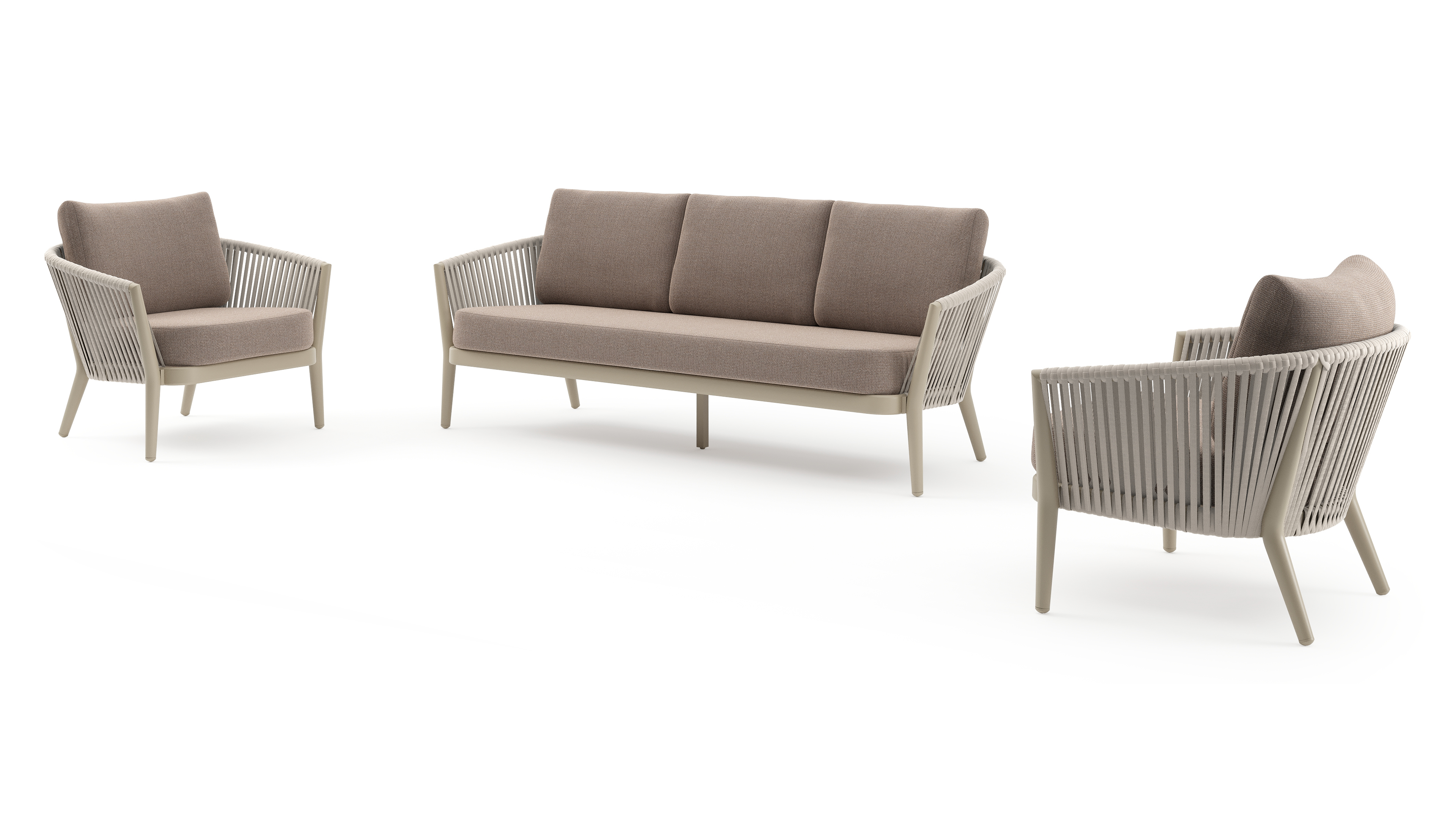 Orso loungeset in beige aluminium en beige verticaal geweven luxe vlakke rope met Savane Earth all weather sunbrella® luxe kussen | Exterioo tuinmeubelen