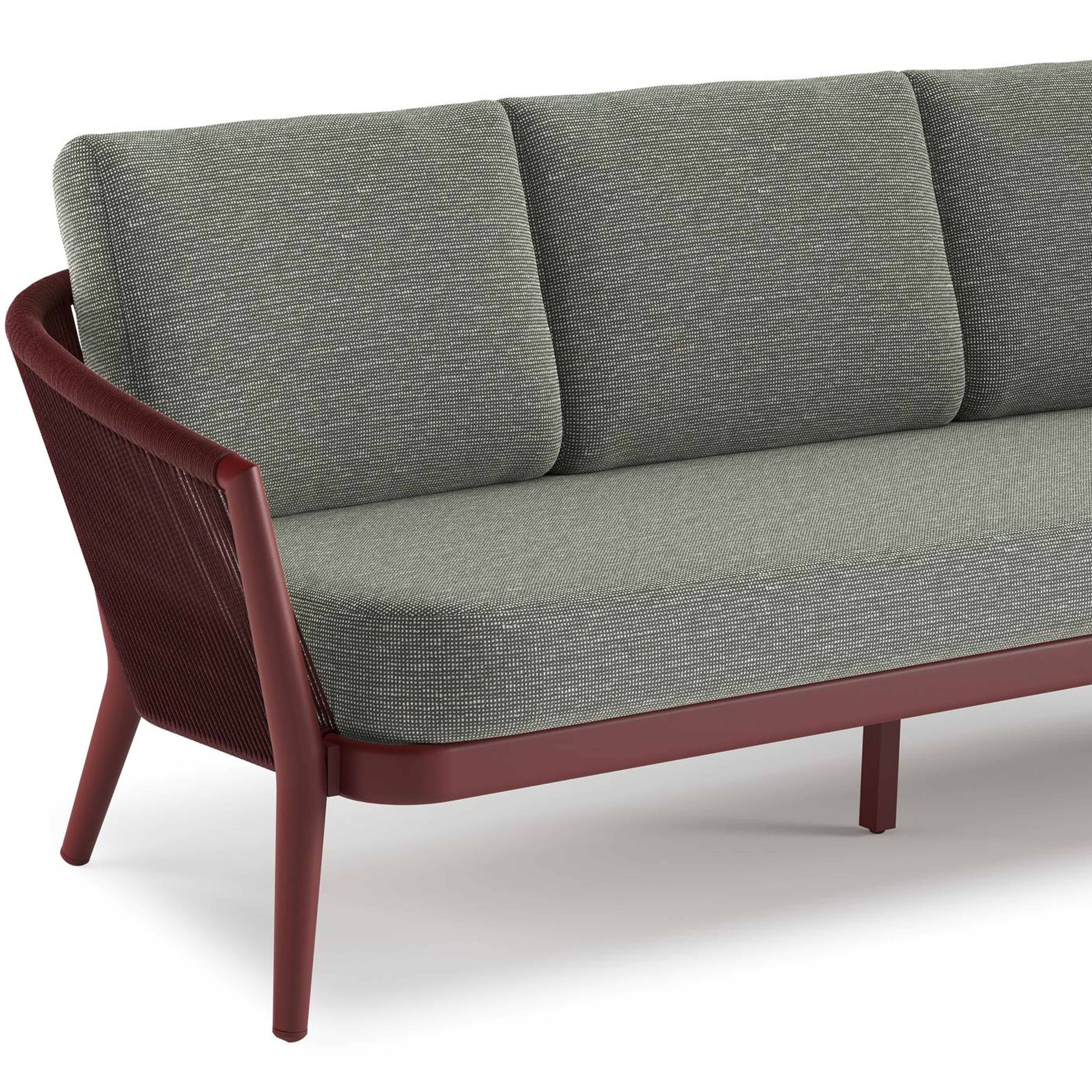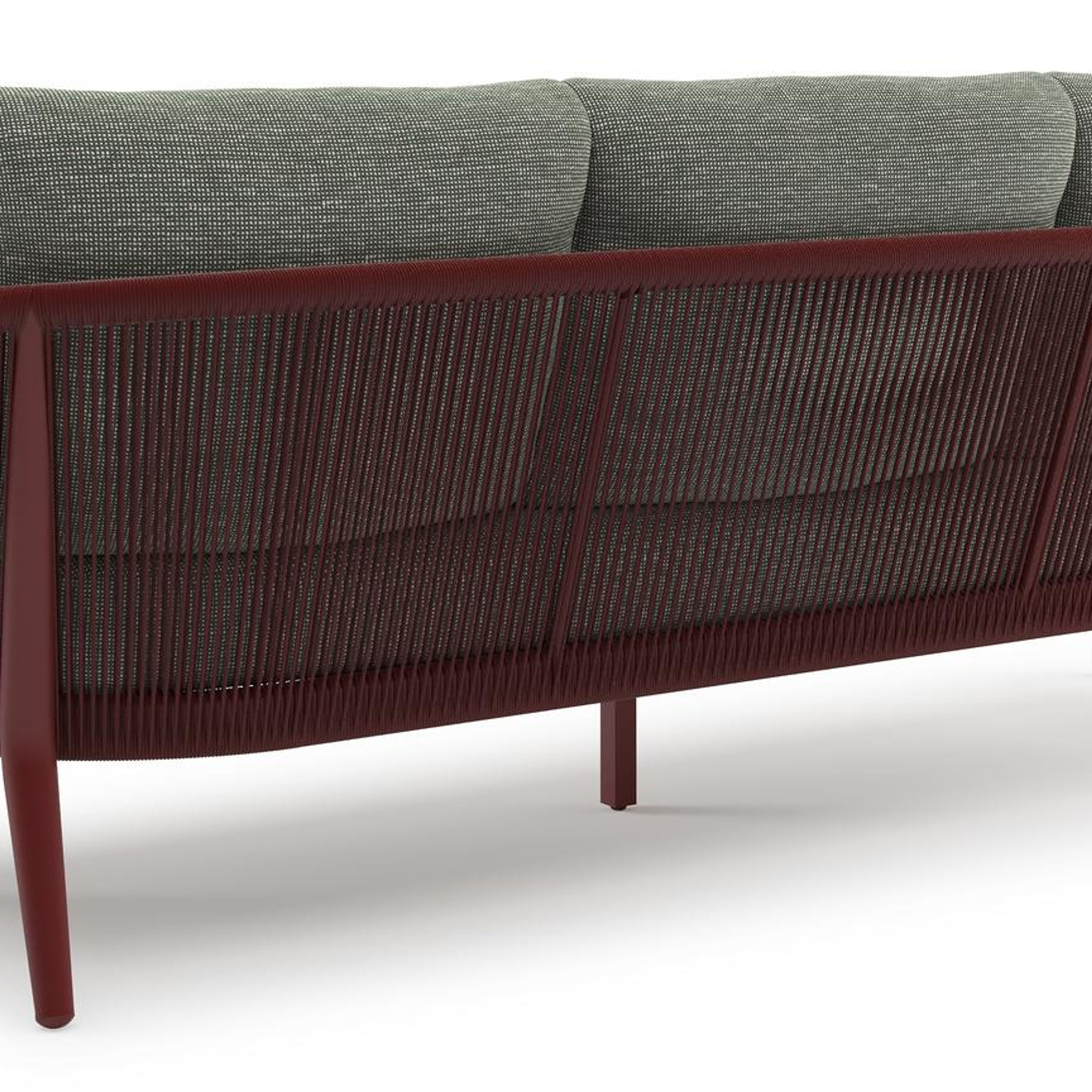 Orso loungeset in ruby aluminium en ruby verticaal geweven ronde rope met Slow Fern all weather sunbrella® luxe kussen | Exterioo tuinmeubelen