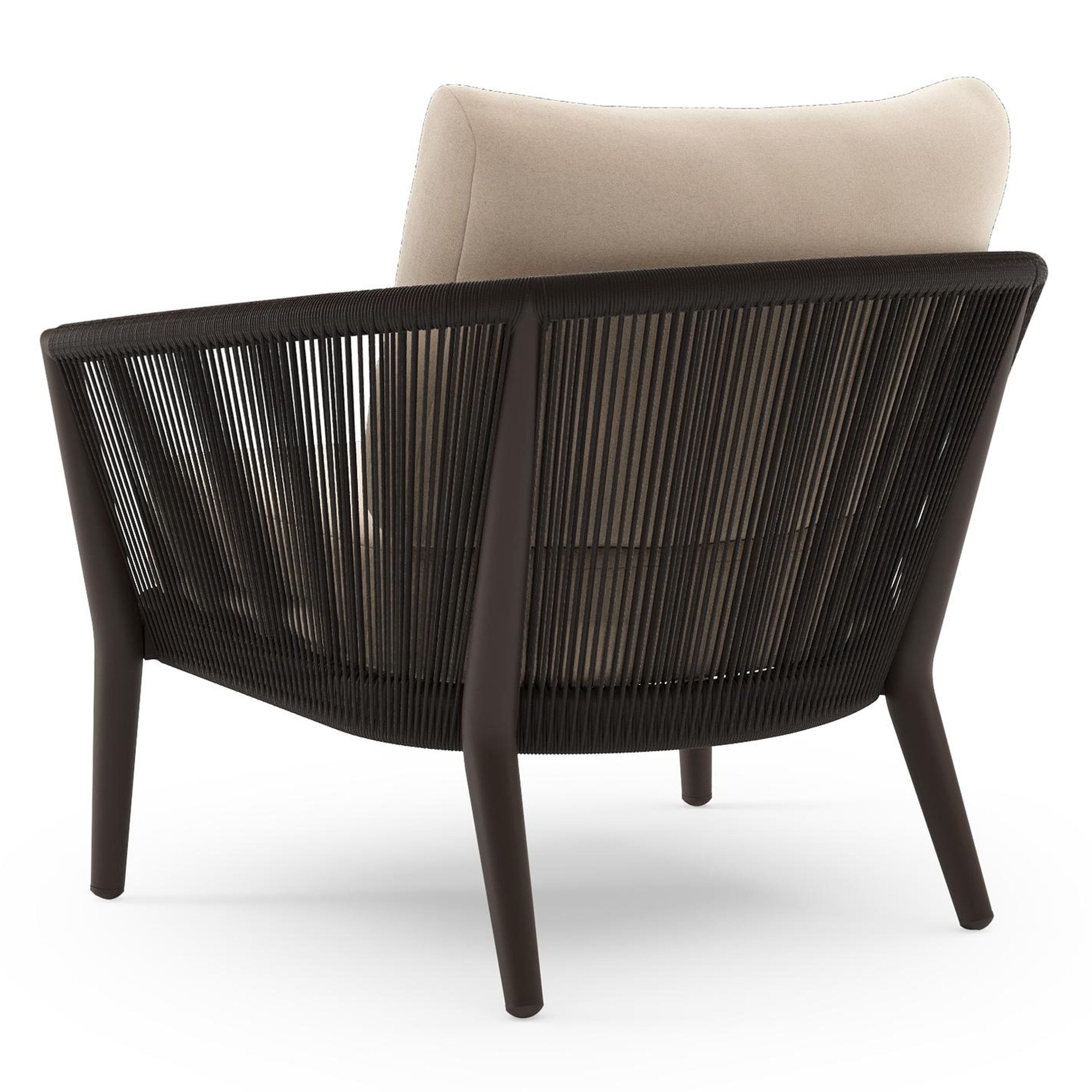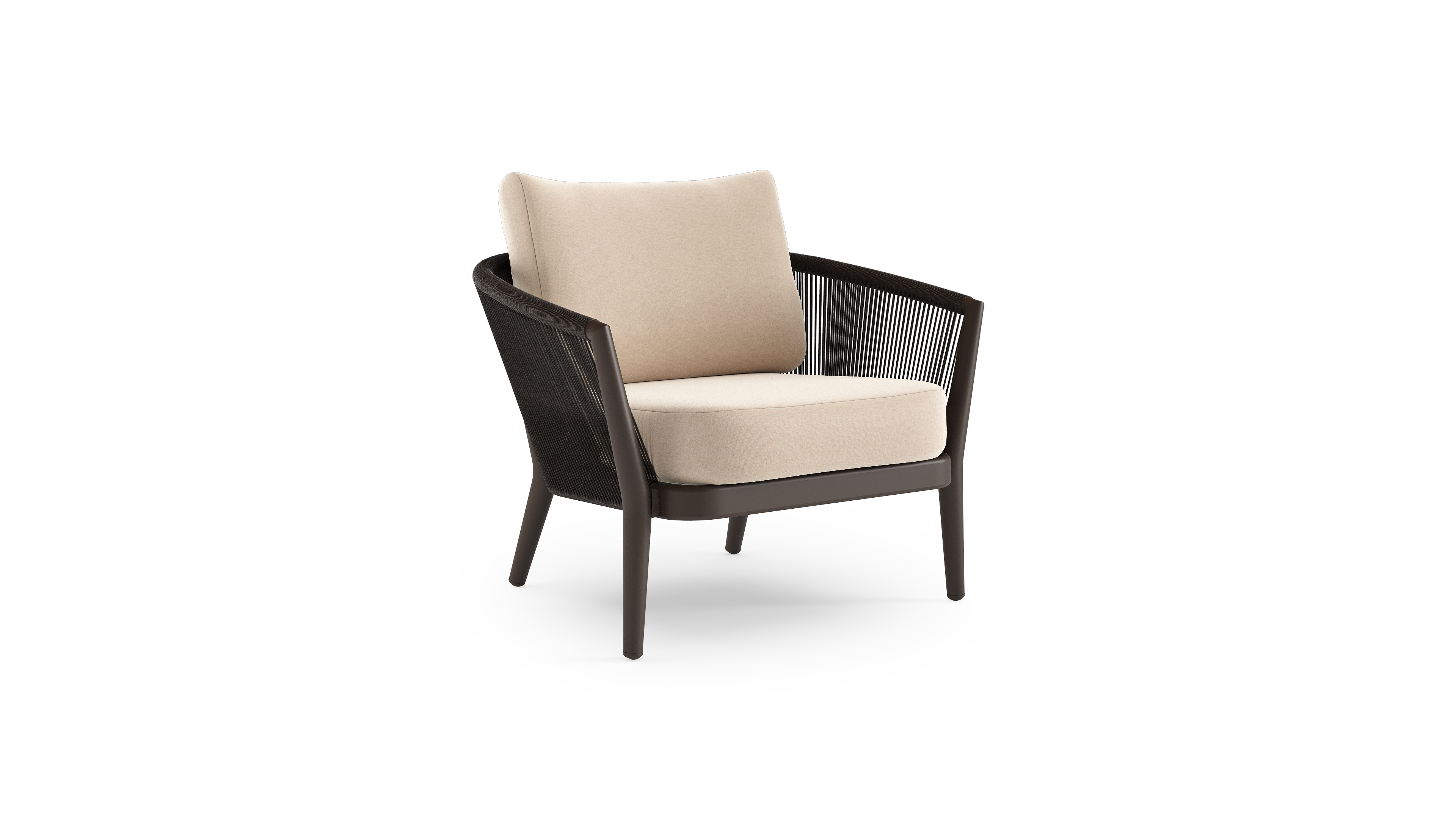 Orso loungestoel in donkerbruin aluminium en donkerbruin verticaal geweven ronde rope met Natte Linen Chalk all weather sunbrella® luxe kussen | Exterioo tuinmeubelen