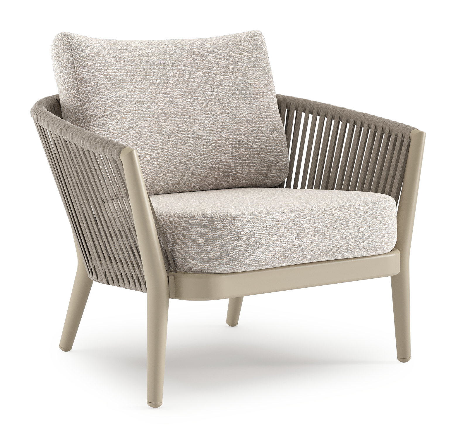 Orso loungestoel in beige aluminium en beige verticaal geweven ronde rope met Tundra Sand all weather sunbrella® luxe kussen | Exterioo tuinmeubelen