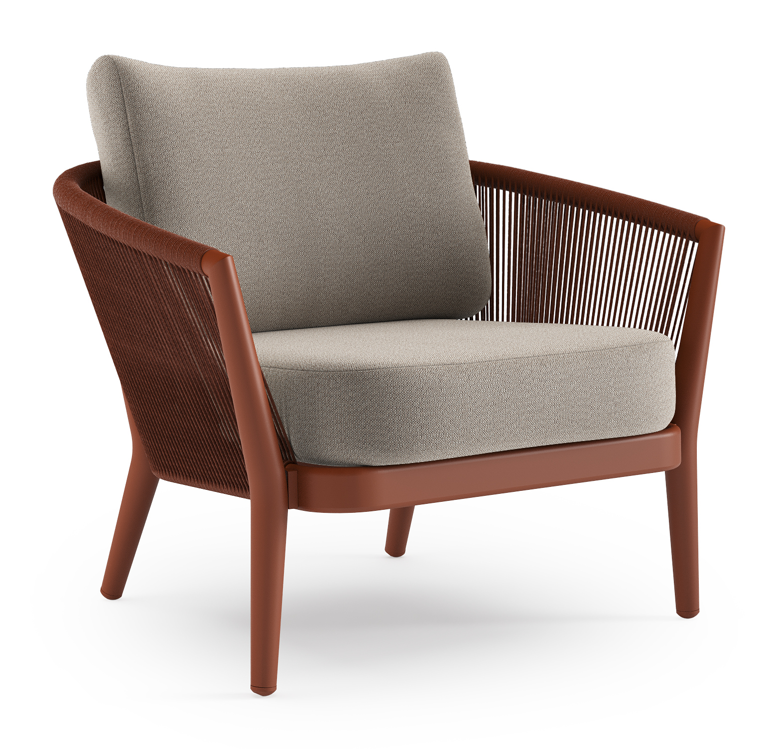 Orso loungestoel in roestbruin aluminium en roestbruin verticaal geweven ronde rope met Savane Coconut all weather sunbrella® luxe kussen | Exterioo tuinmeubelen