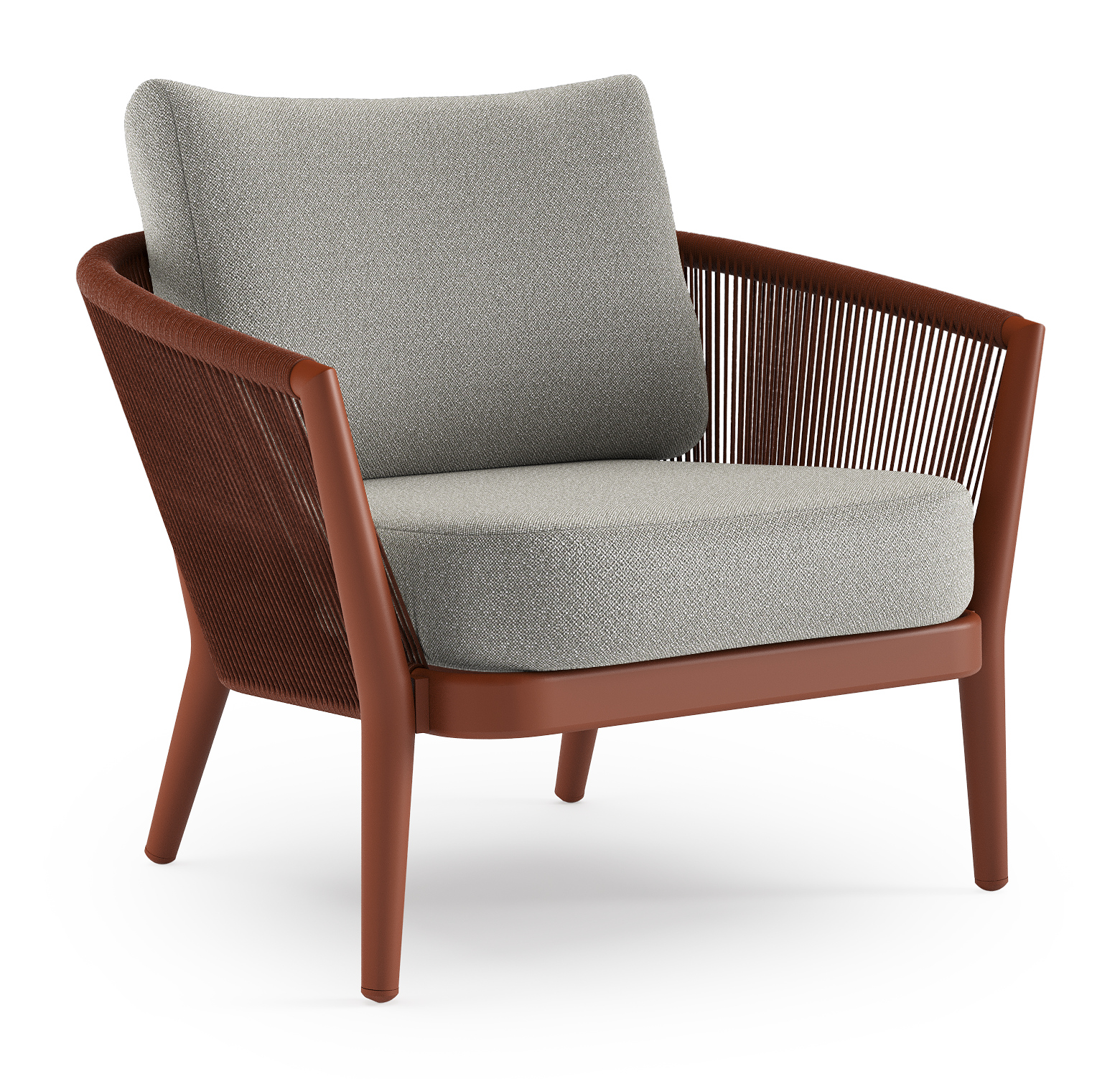 Orso loungestoel in roestbruin aluminium en roestbruin verticaal geweven ronde rope met Savane Tunder all weather sunbrella® luxe kussen | Exterioo tuinmeubelen