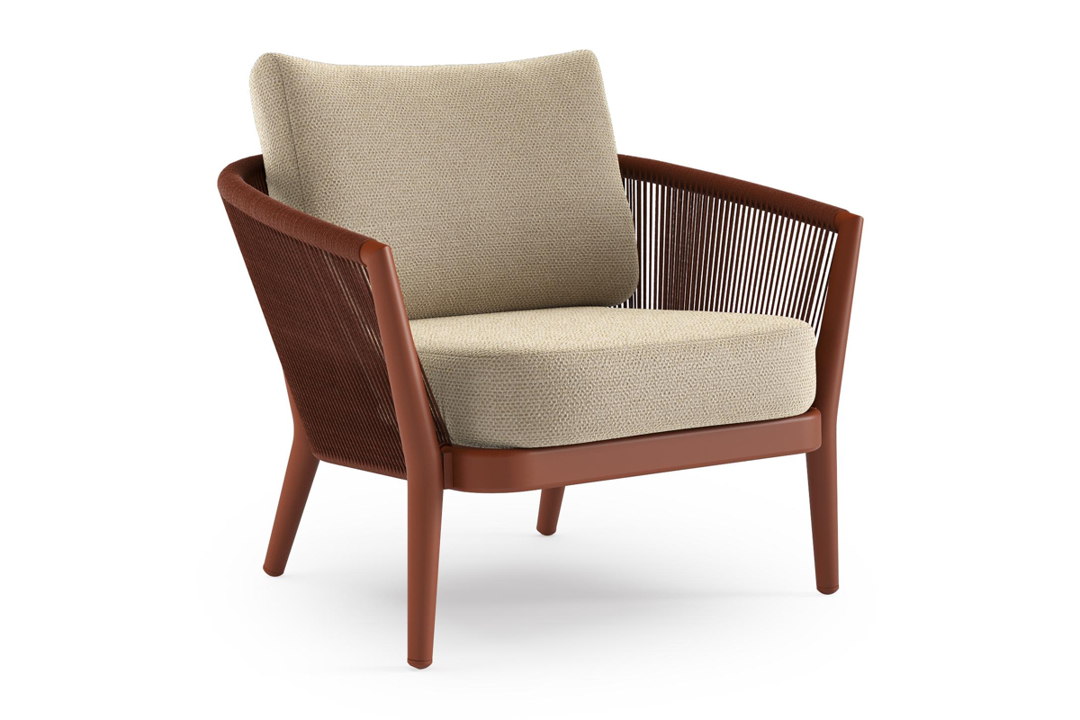 Orso loungestoel in roestbruin aluminium en roestbruin verticaal geweven ronde rope met Althea Camel all weather cosytica kussen | Exterioo