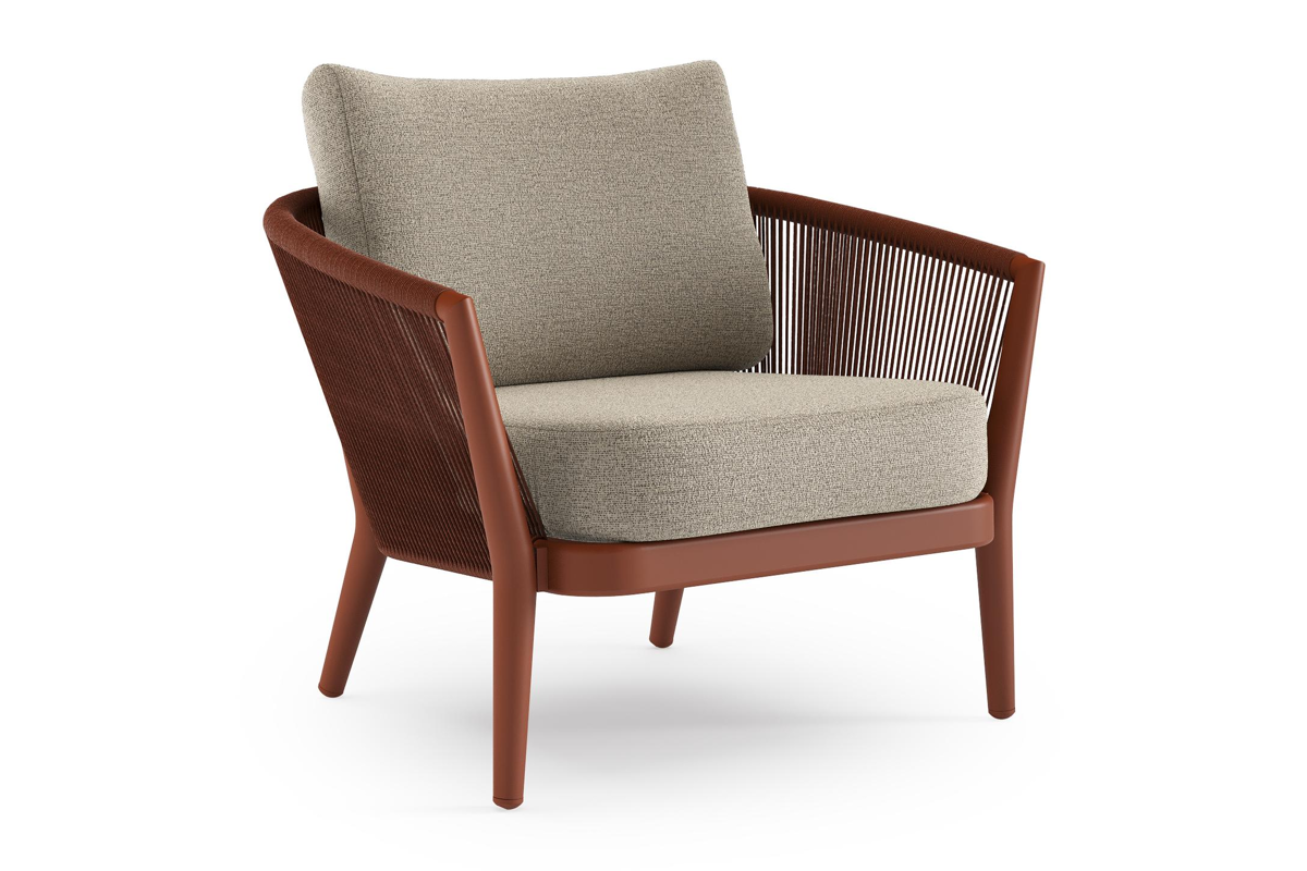 Orso loungestoel in roestbruin aluminium en roestbruin verticaal geweven ronde rope met Catania Beige all weather cosytica kussen | Exterioo
