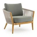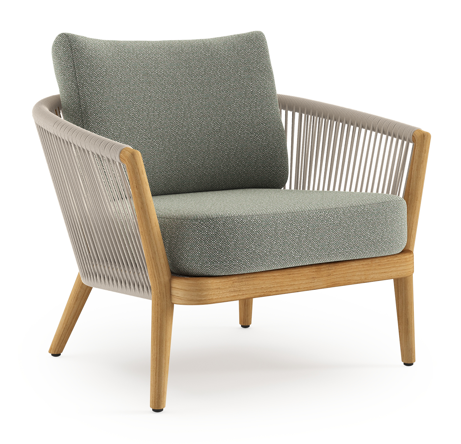 Orso loungestoel in teak en beige verticaal geweven ronde rope met Savane Leaf all weather sunbrella® luxe kussen | Exterioo tuinmeubelen