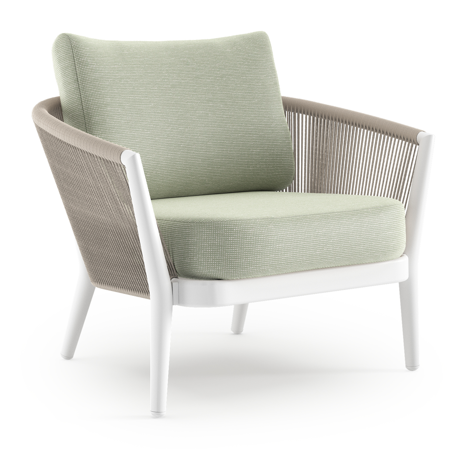 Orso loungestoel in wit aluminium en beige verticaal geweven ronde rope met Slow Spirea all weather sunbrella® luxe kussen | Exterioo tuinmeubelen