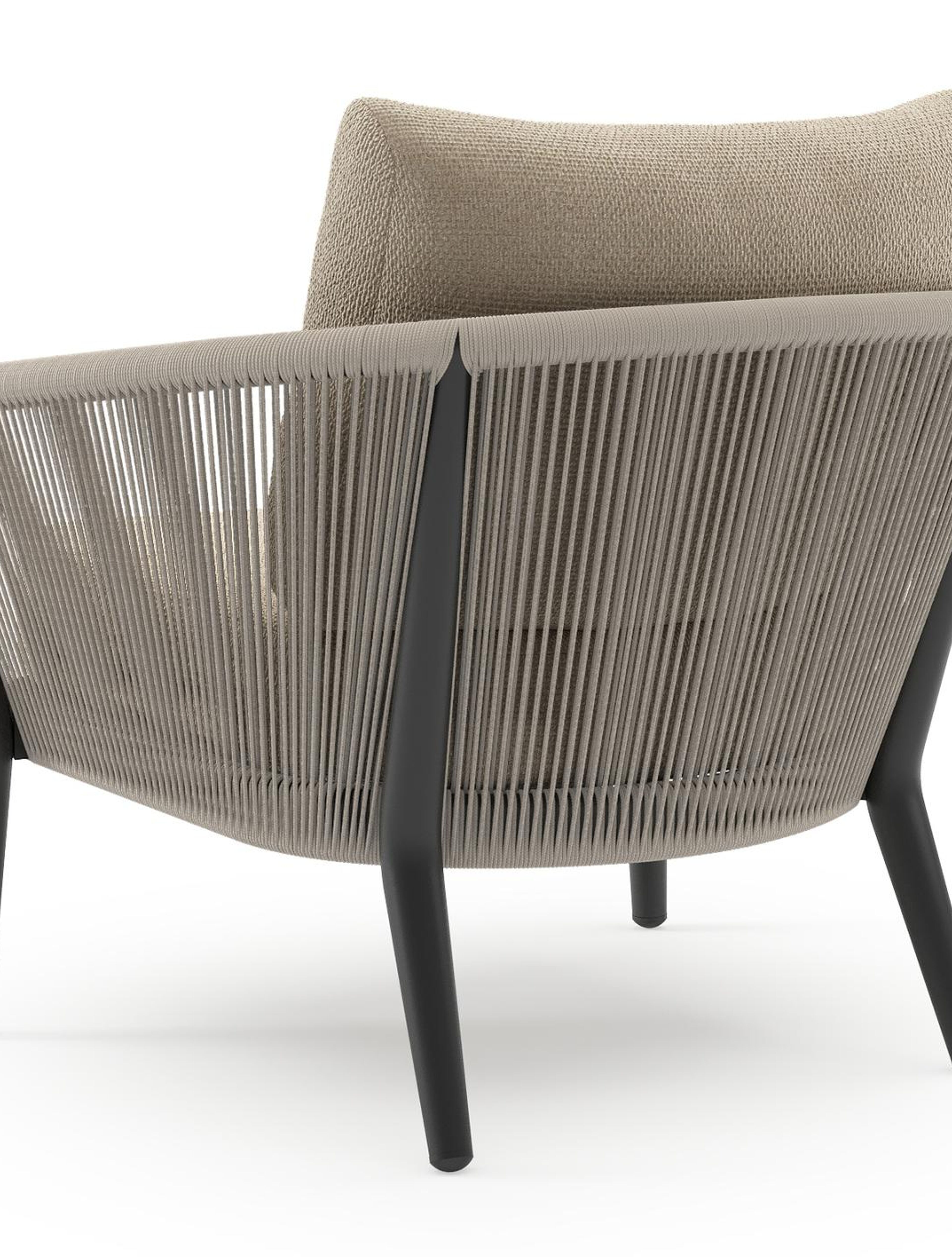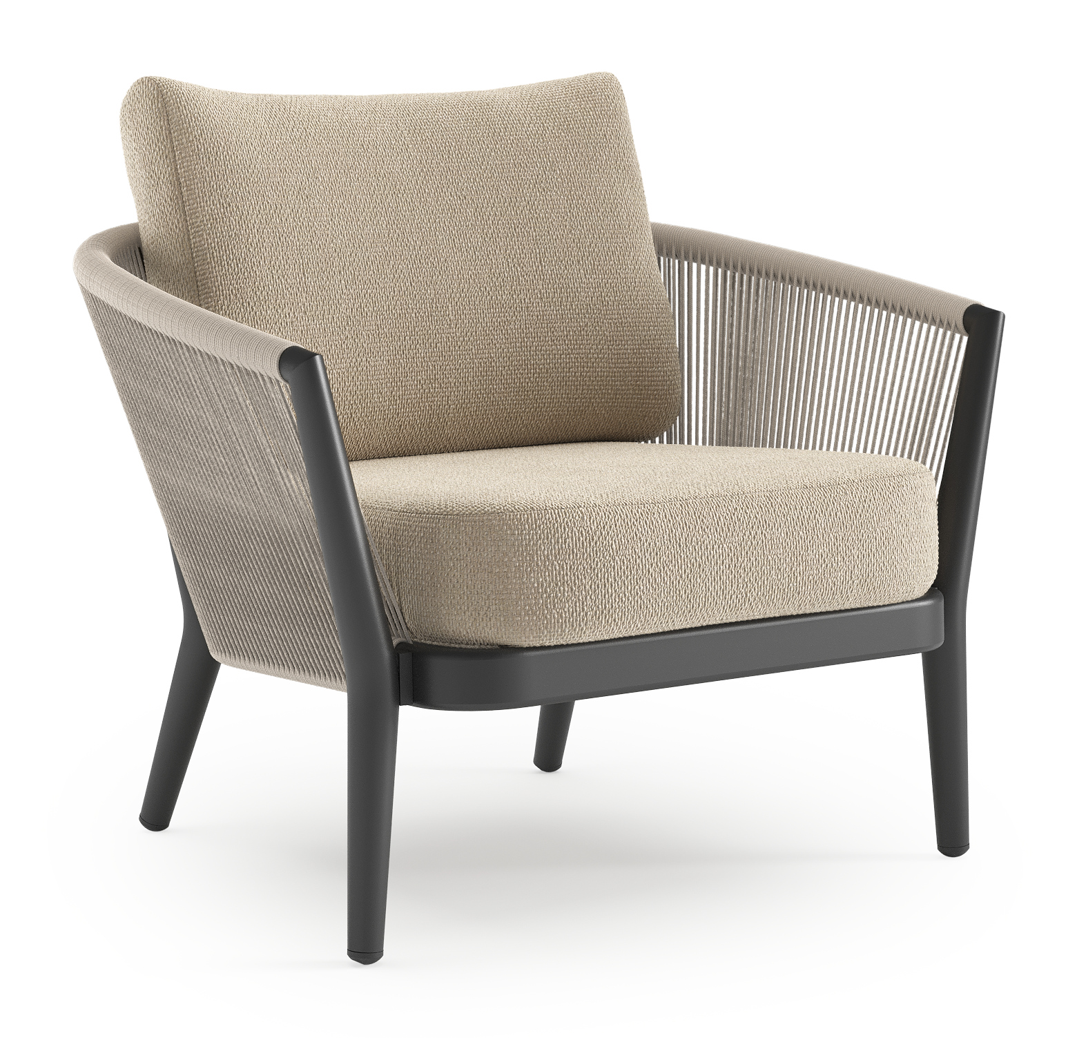 Orso loungestoel in zwart aluminium en beige verticaal geweven ronde rope met Althea Chalk all weather cosytica kussen | Exterioo tuinmeubelen