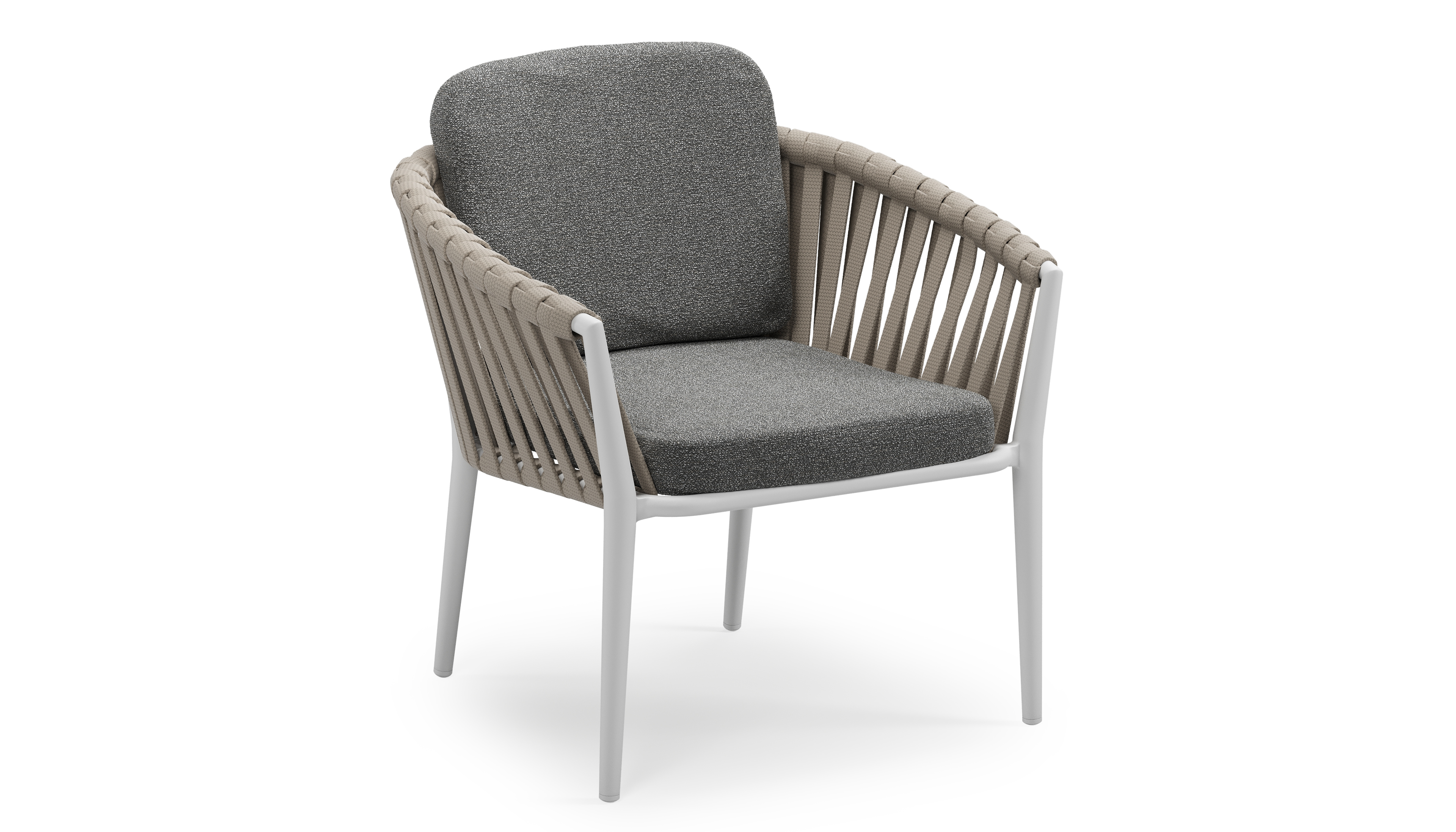 Orso low dining tuinstoel in wit aluminium en beige verticaal geweven luxe vlakke brede rope met stoelkussen in All Weather Cosytica Catania Black | Exterioo tuinmeubelen