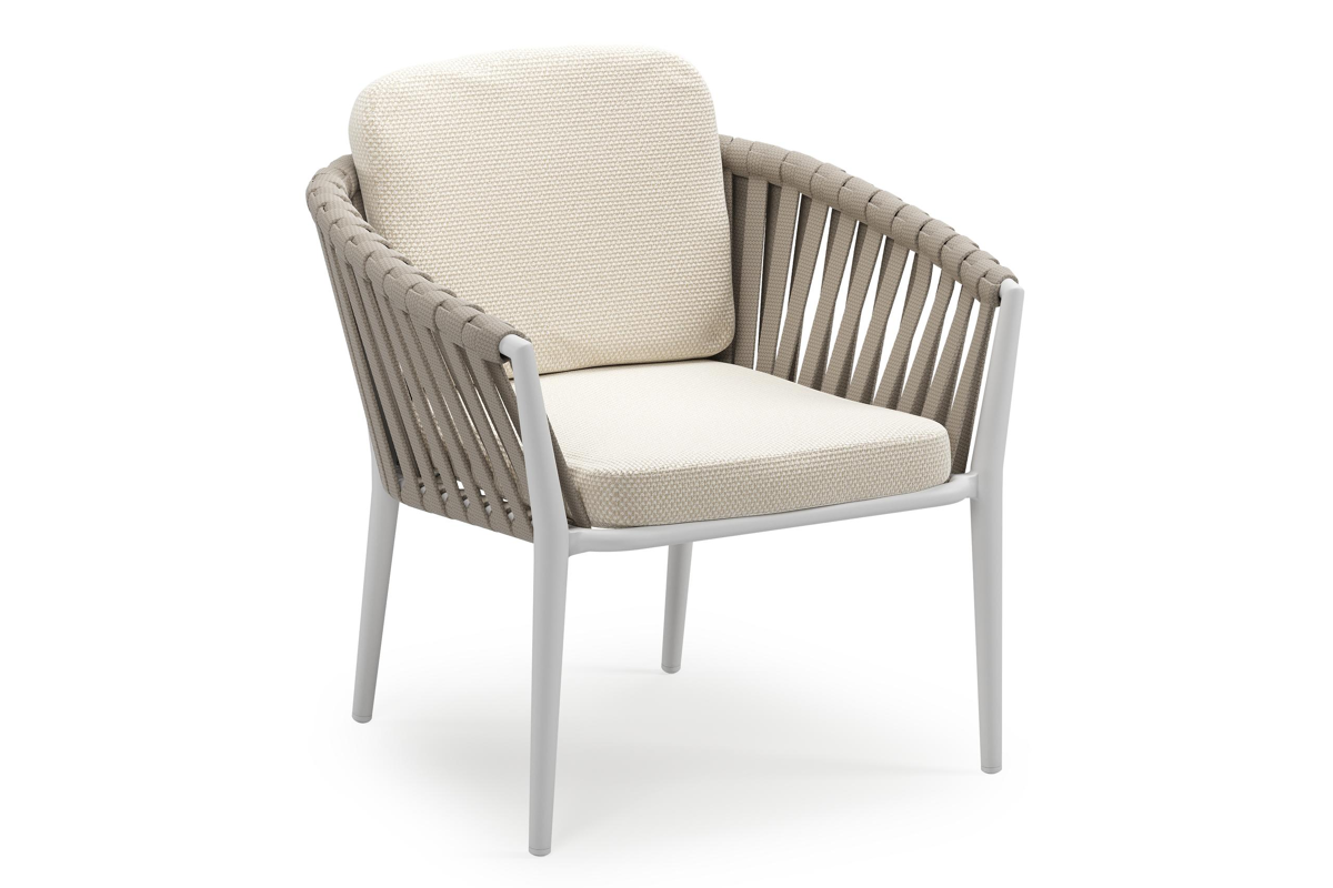 Orso low dining tuinstoel in wit aluminium en beige verticaal geweven luxe vlakke brede rope met stoelkussen in All Weather Cosytica Althea Off White | Exterioo