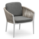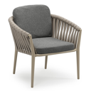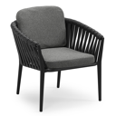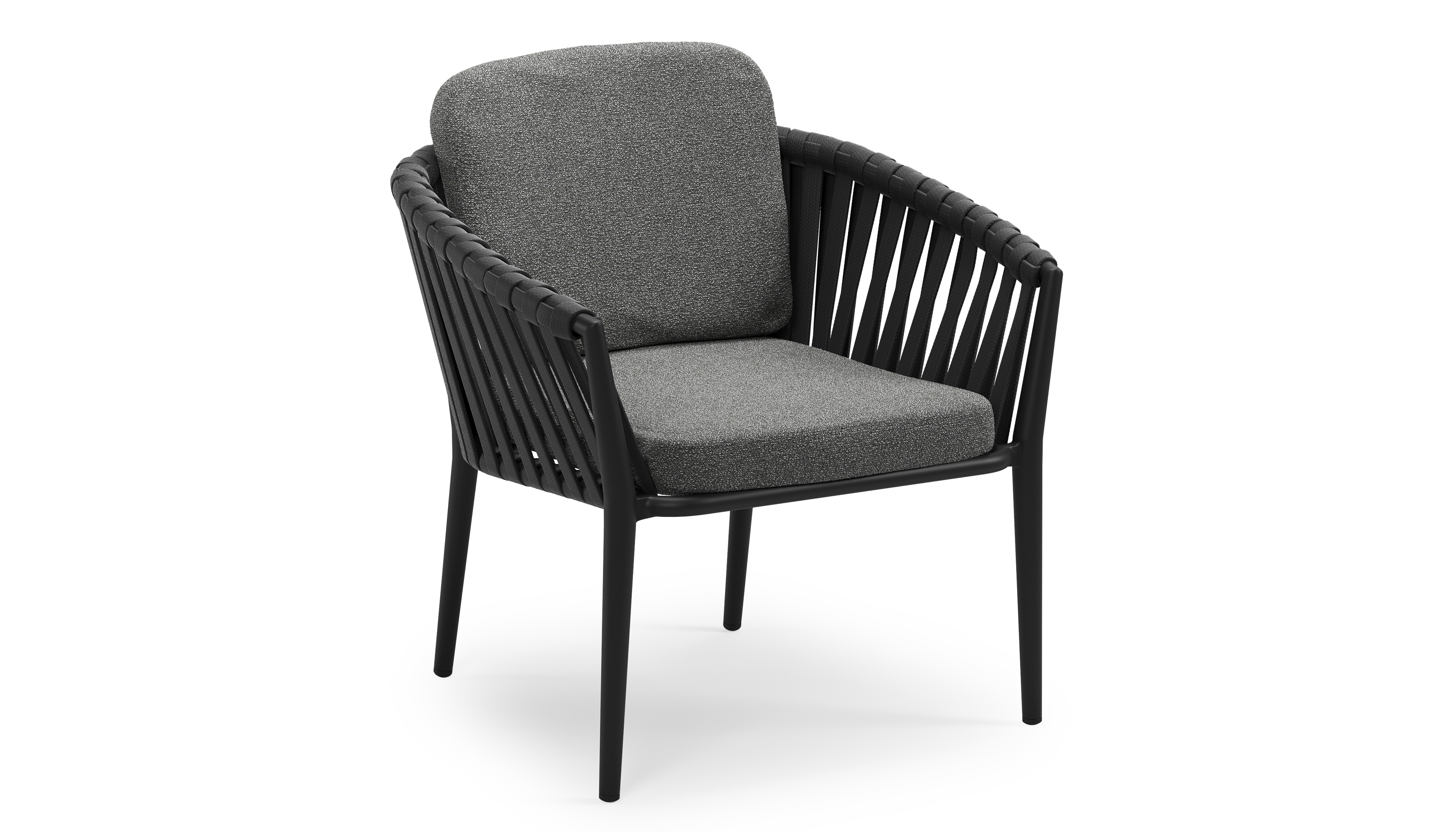 Orso low dining tuinstoel in zwart aluminium en zwart verticaal geweven luxe vlakke brede rope met stoelkussen in All Weather Cosytica Catania Black | Exterioo tuinmeubelen