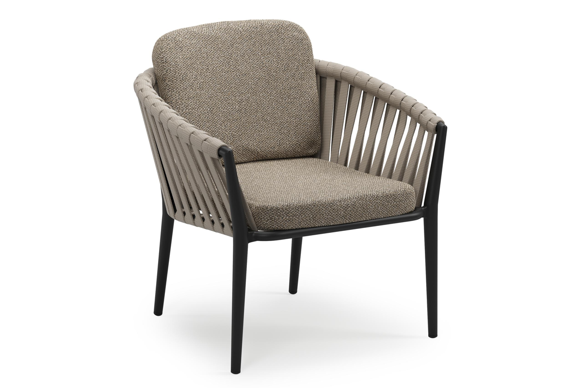 Orso low dining tuinstoel in zwart aluminium en beige verticaal geweven luxe vlakke brede rope met stoelkussen in All Weather Cosytica Madagascar Burch | Exterioo