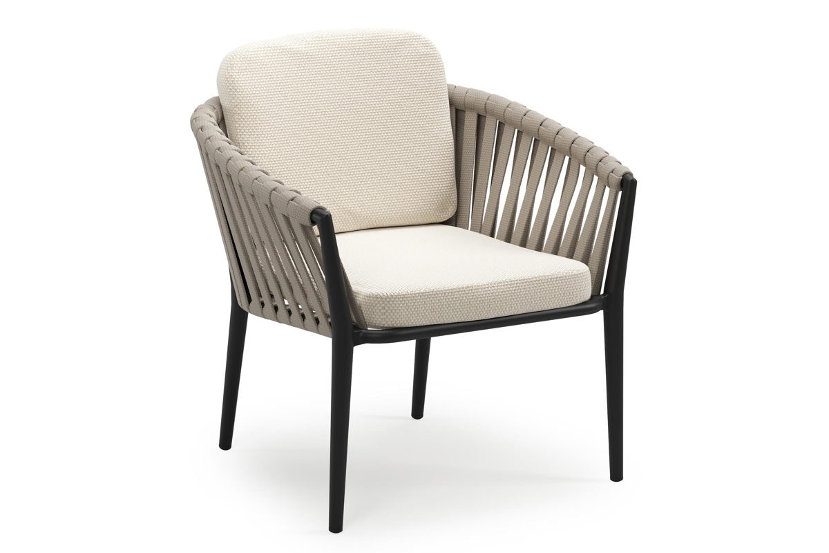 Orso low dining tuinstoel in zwart aluminium en beige verticaal geweven luxe vlakke brede rope met stoelkussen in All Weather Cosytica Althea Off White | Exterioo