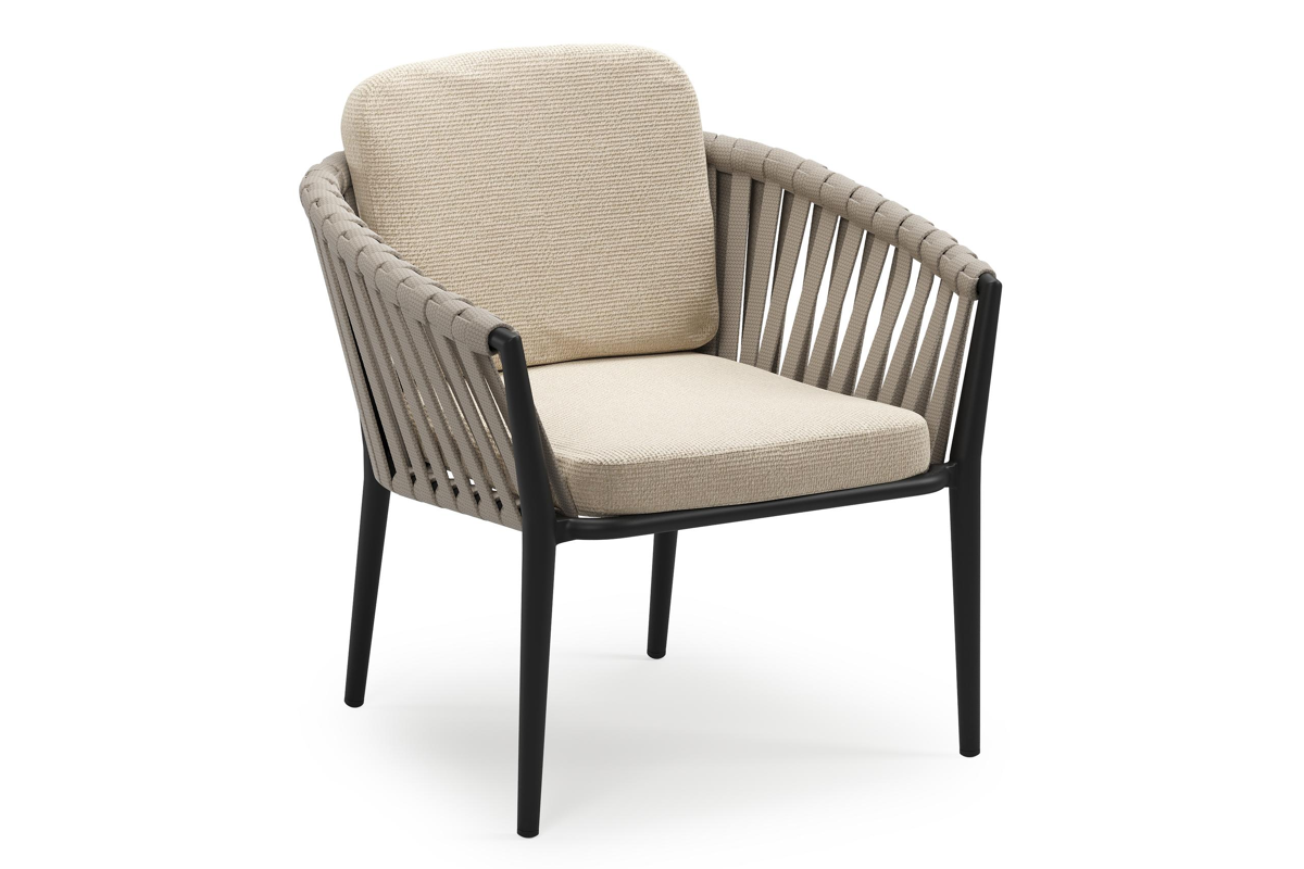 Orso low dining tuinstoel in zwart aluminium en beige verticaal geweven luxe vlakke brede rope met stoelkussen in All Weather Cosytica Althea Chalk | Exterioo