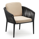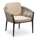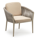 Orso low dining tuinstoel in beige aluminium en beige verticaal geweven luxe vlakke brede rope met stoelkussen in All Weather Sunbrella® Luxe Natte Heather Beige | Exterioo tuinmeubelen