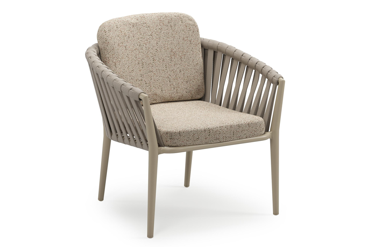 Orso low dining tuinstoel in beige aluminium en beige verticaal geweven luxe vlakke brede rope met stoelkussen in All Weather Cosytica Bora Jungle | Exterioo