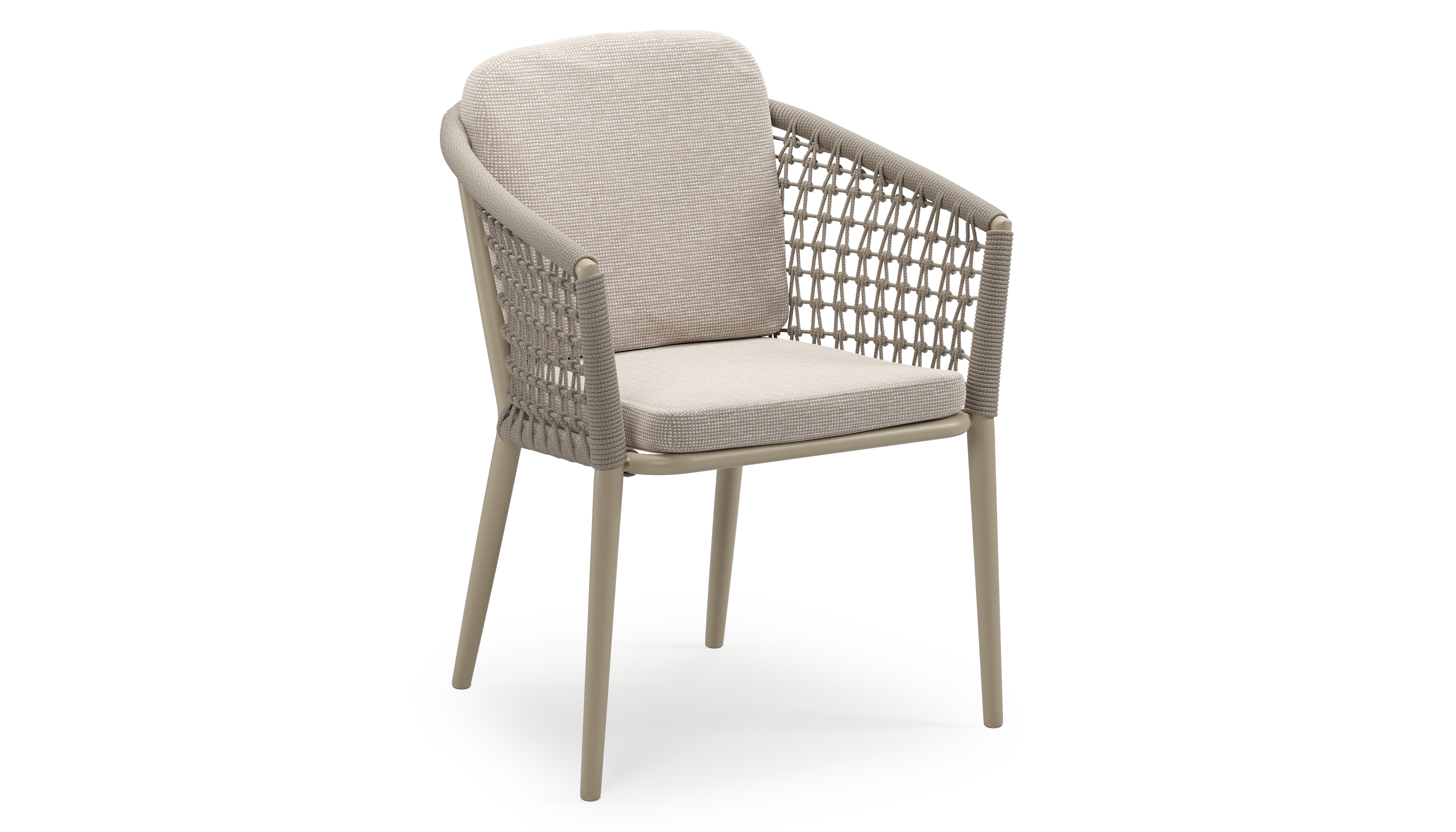 Orso stapelbare tuinstoel in beige aluminium en beige visnet geweven ronde rope met stoelkussen in All Weather Sunbrella® Luxe Slow Farafra | Exterioo tuinmeubelen