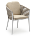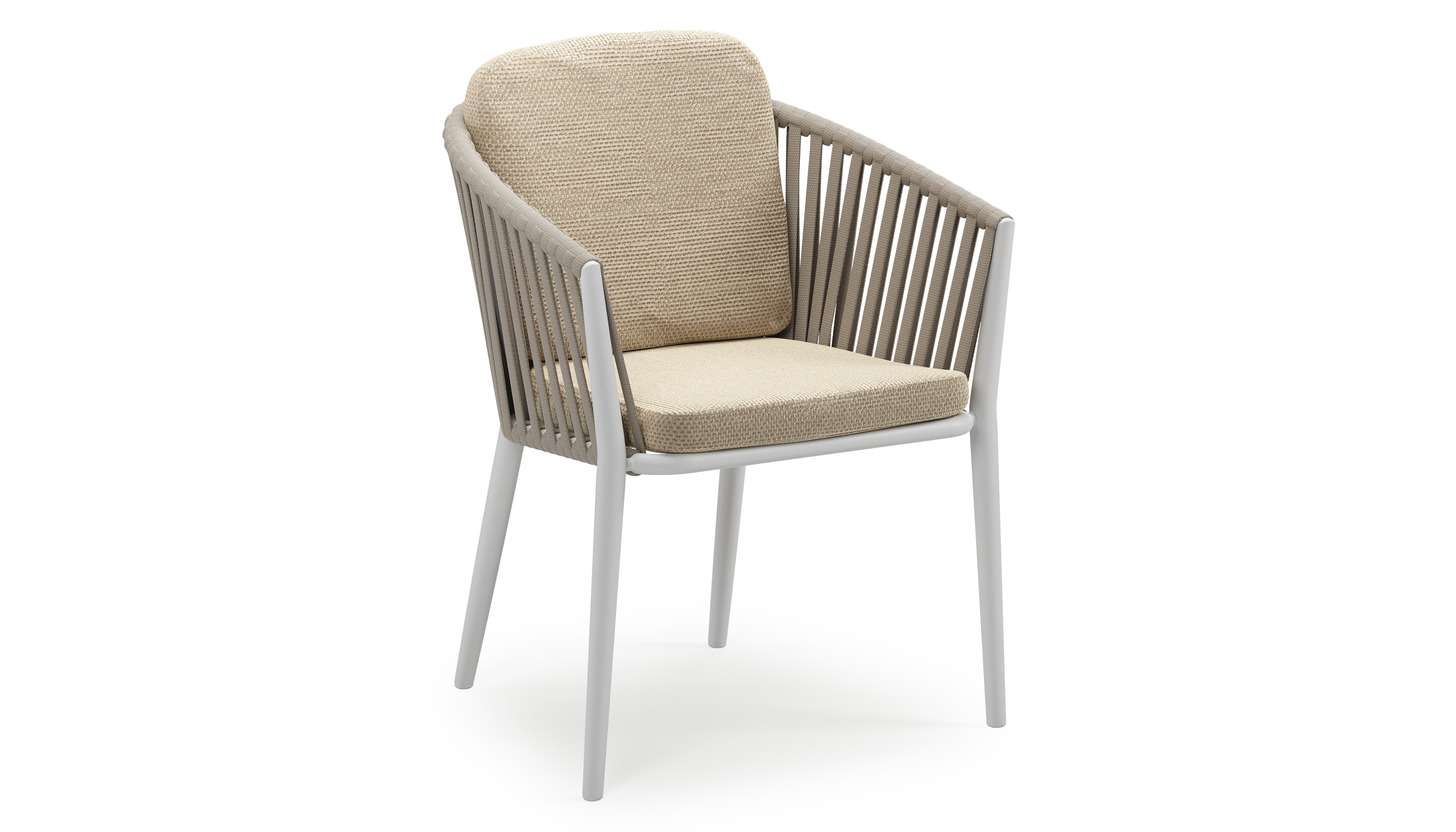 Orso stapelbare tuinstoel in wit aluminium en beige verticaal geweven luxe vlakke brede rope met stoelkussen in All Weather Cosytica Althea Camel | Exterioo tuinmeubelen
