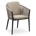 Orso stapelbare tuinstoel in zwart aluminium en beige verticaal geweven luxe vlakke brede rope met stoelkussen in All Weather Cosytica Bora Jungle | Exterioo tuinmeubelen