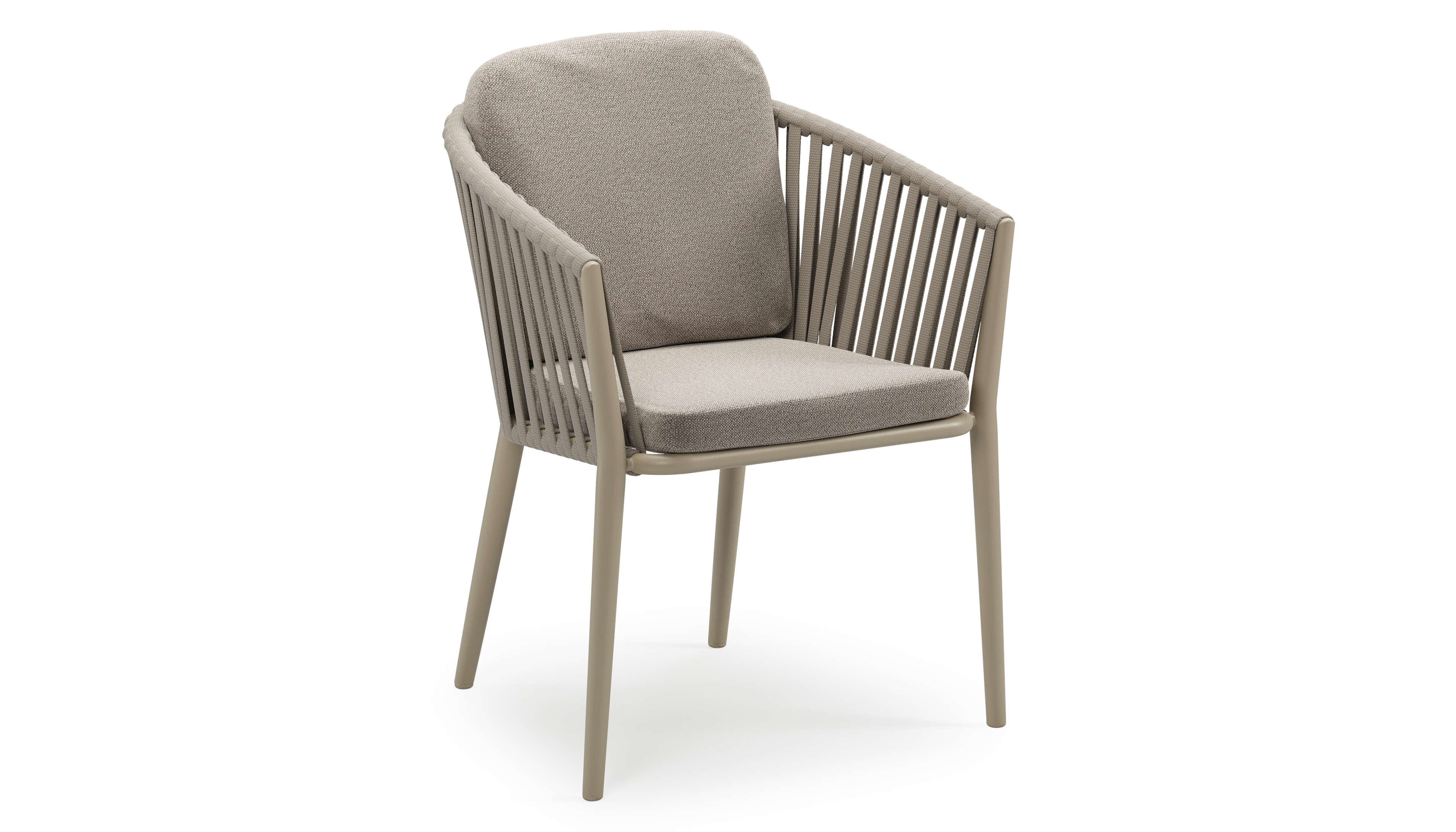 Orso stapelbare tuinstoel in beige aluminium en beige verticaal geweven luxe vlakke brede rope met stoelkussen in All Weather Sunbrella® Luxe Savane Coconut | Exterioo tuinmeubelen