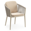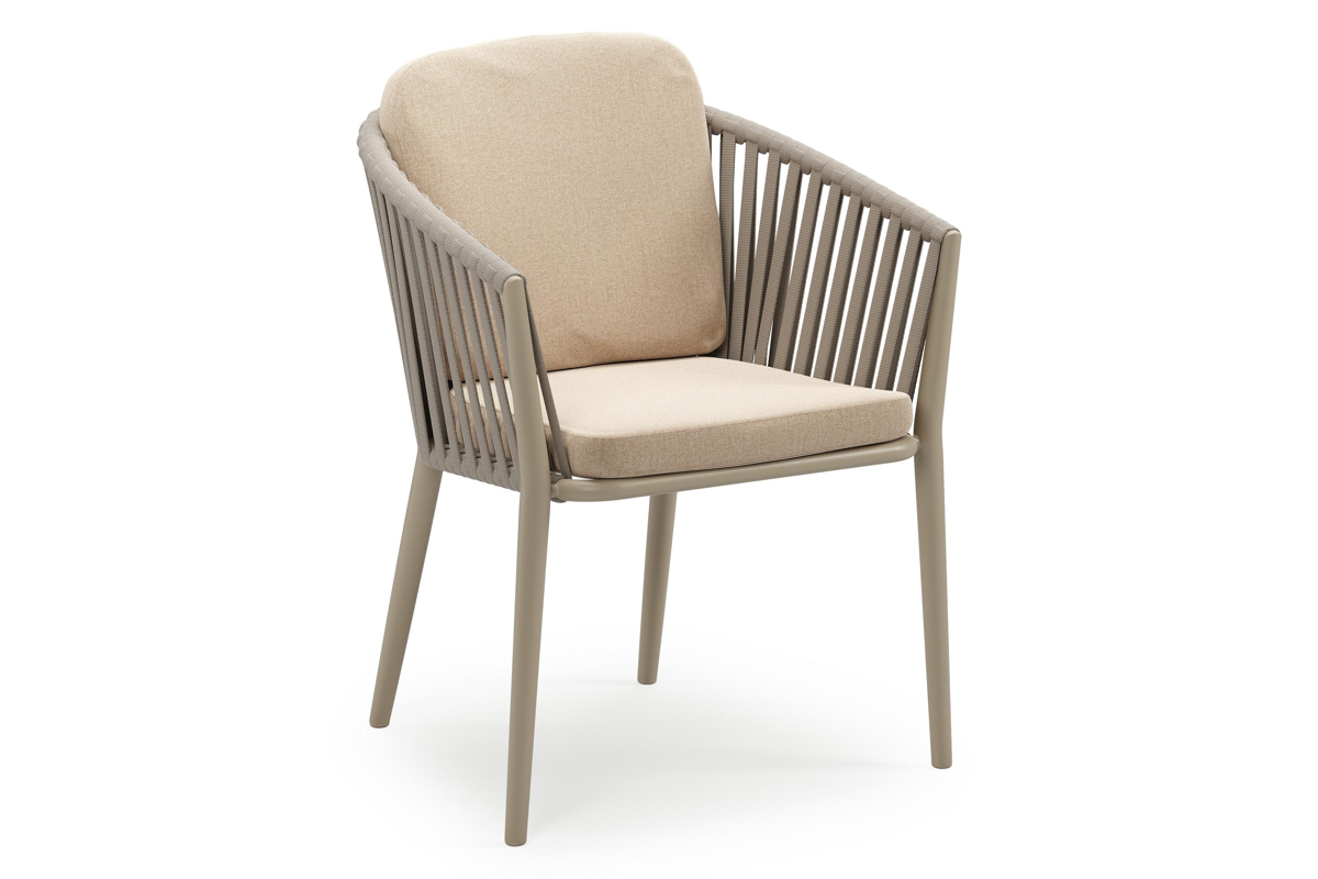 Orso stapelbare tuinstoel in beige aluminium en beige verticaal geweven luxe vlakke brede rope met stoelkussen in All Weather Sunbrella® Luxe Natte Heather Beige | Exterioo
