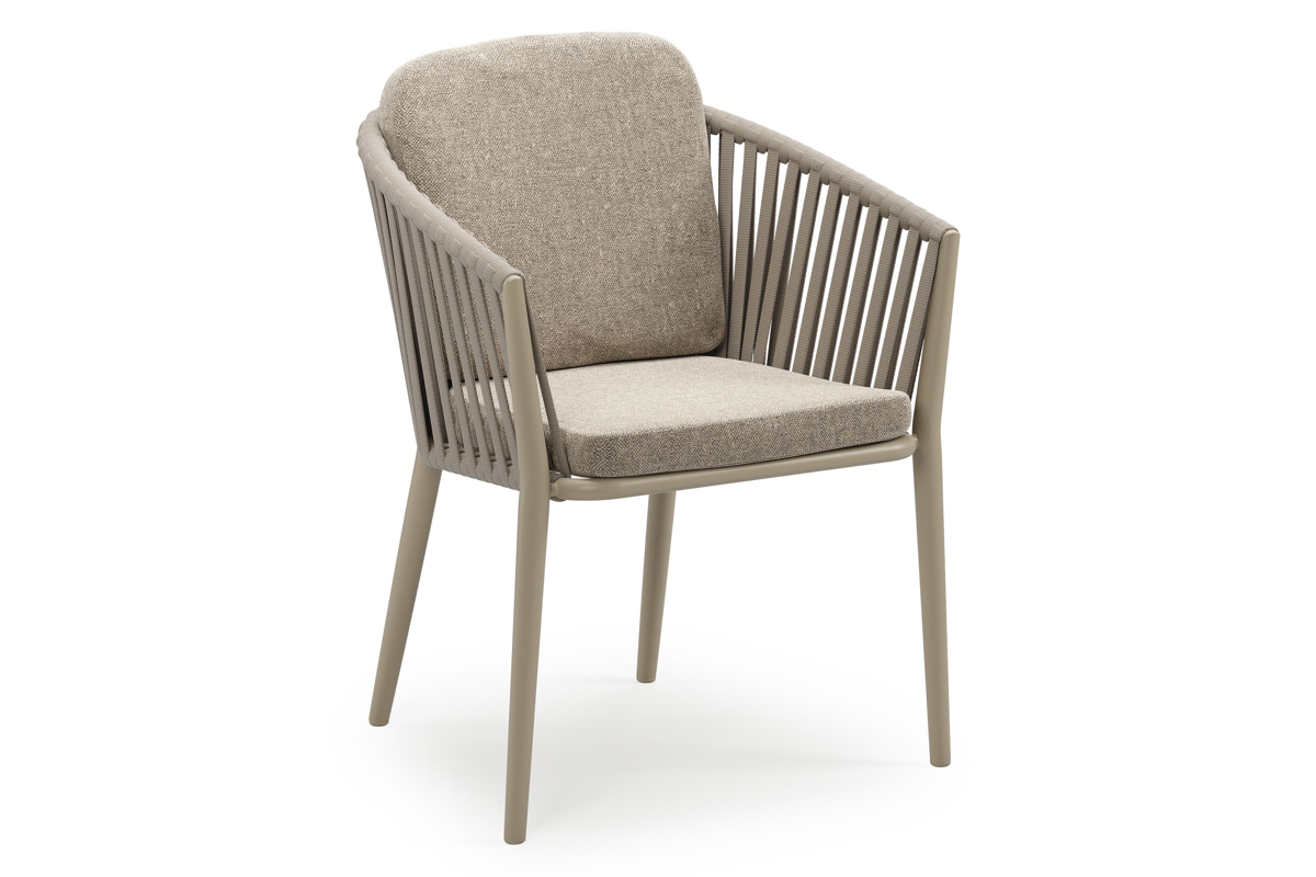 Orso stapelbare tuinstoel in beige aluminium en beige verticaal geweven luxe vlakke brede rope met stoelkussen in All Weather Sunbrella® Luxe Chartres Pewter | Exterioo